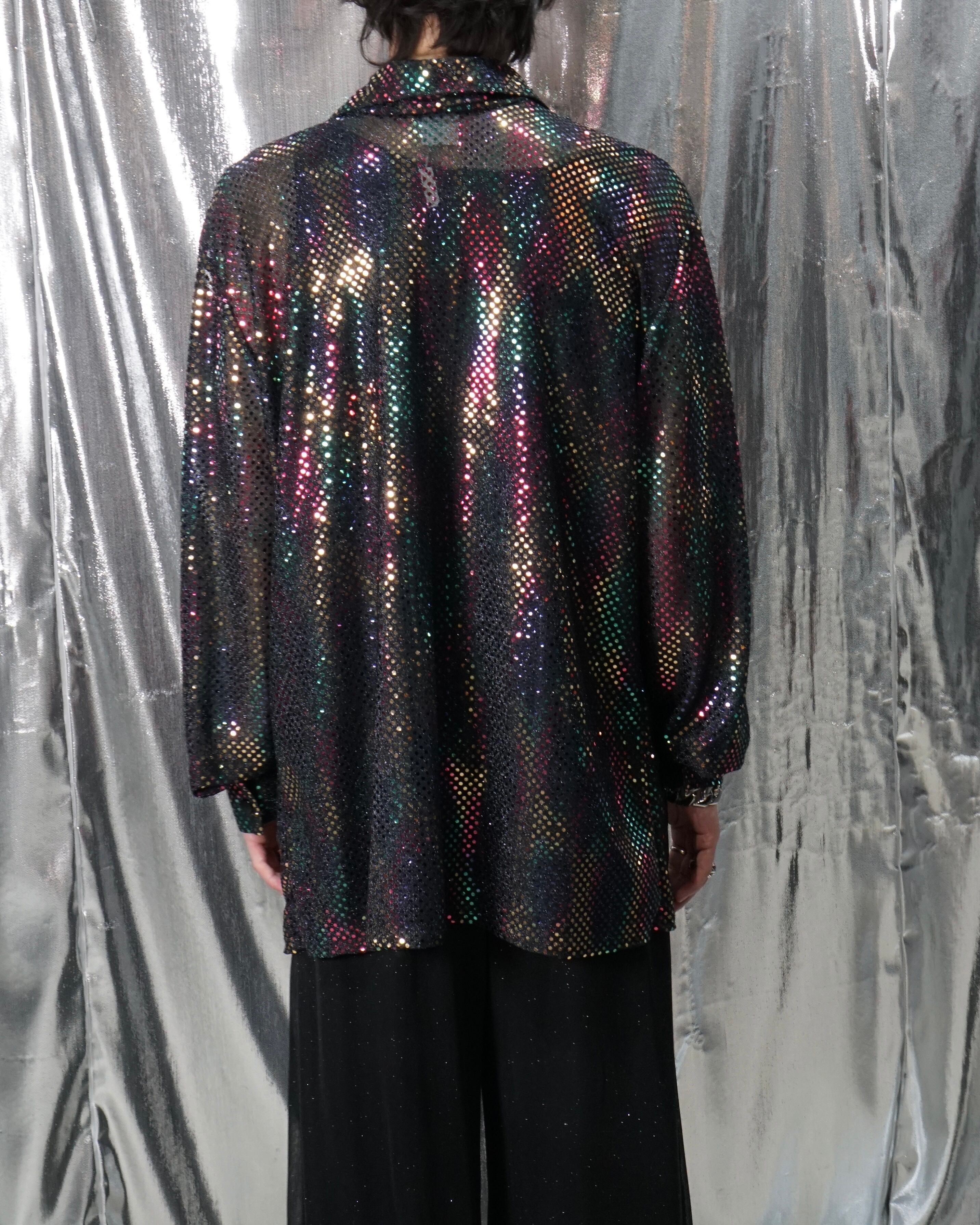 ブラックベースの軽やかなシアー生地に、光の角度で輝くディスコカラーのラメ装飾を全面に施した華やかなデザイン。