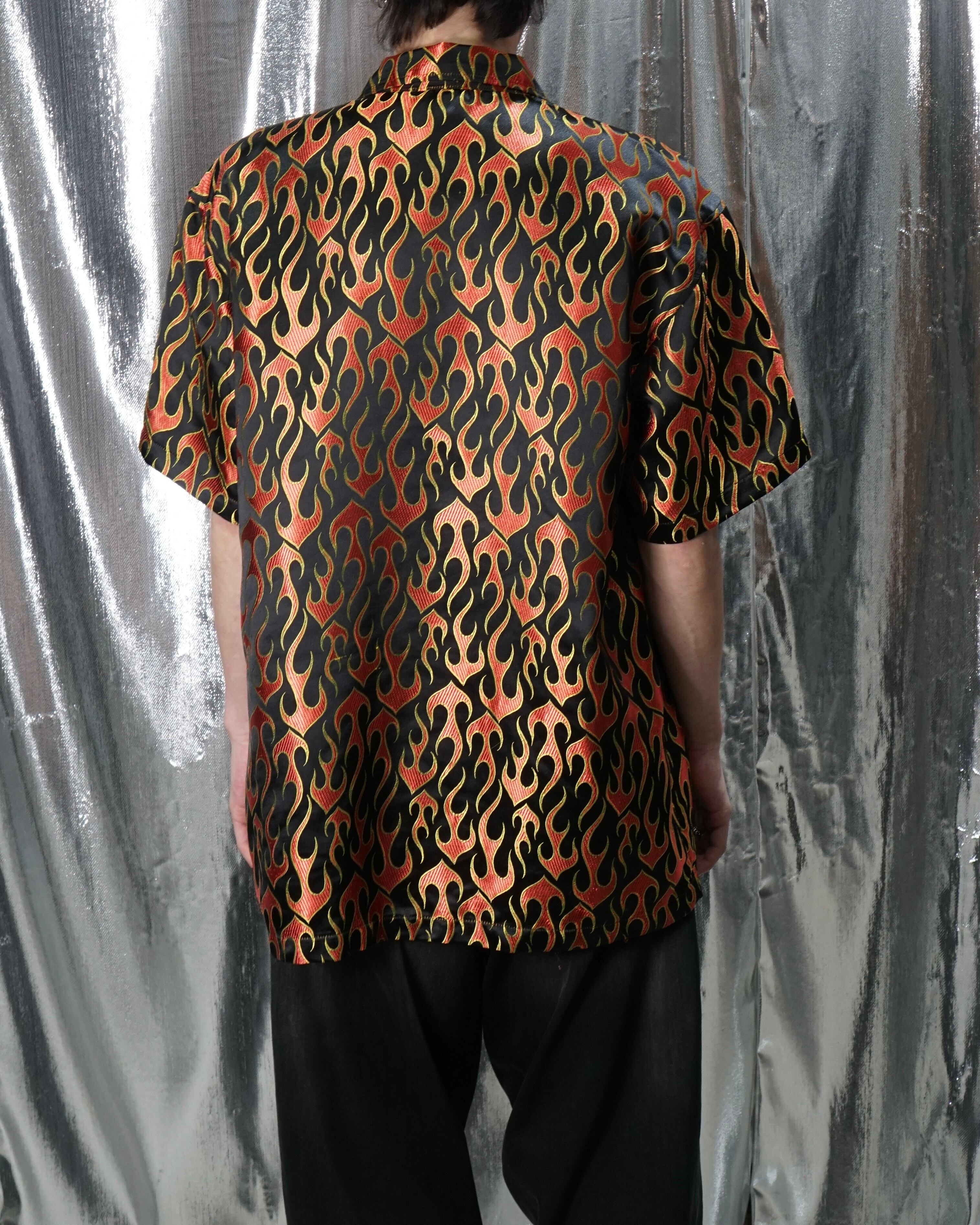 光沢感のあるサテン地に、贅沢にも迫力あるファイヤーパターン刺繍をあしらったインパクト抜群のシャツ。