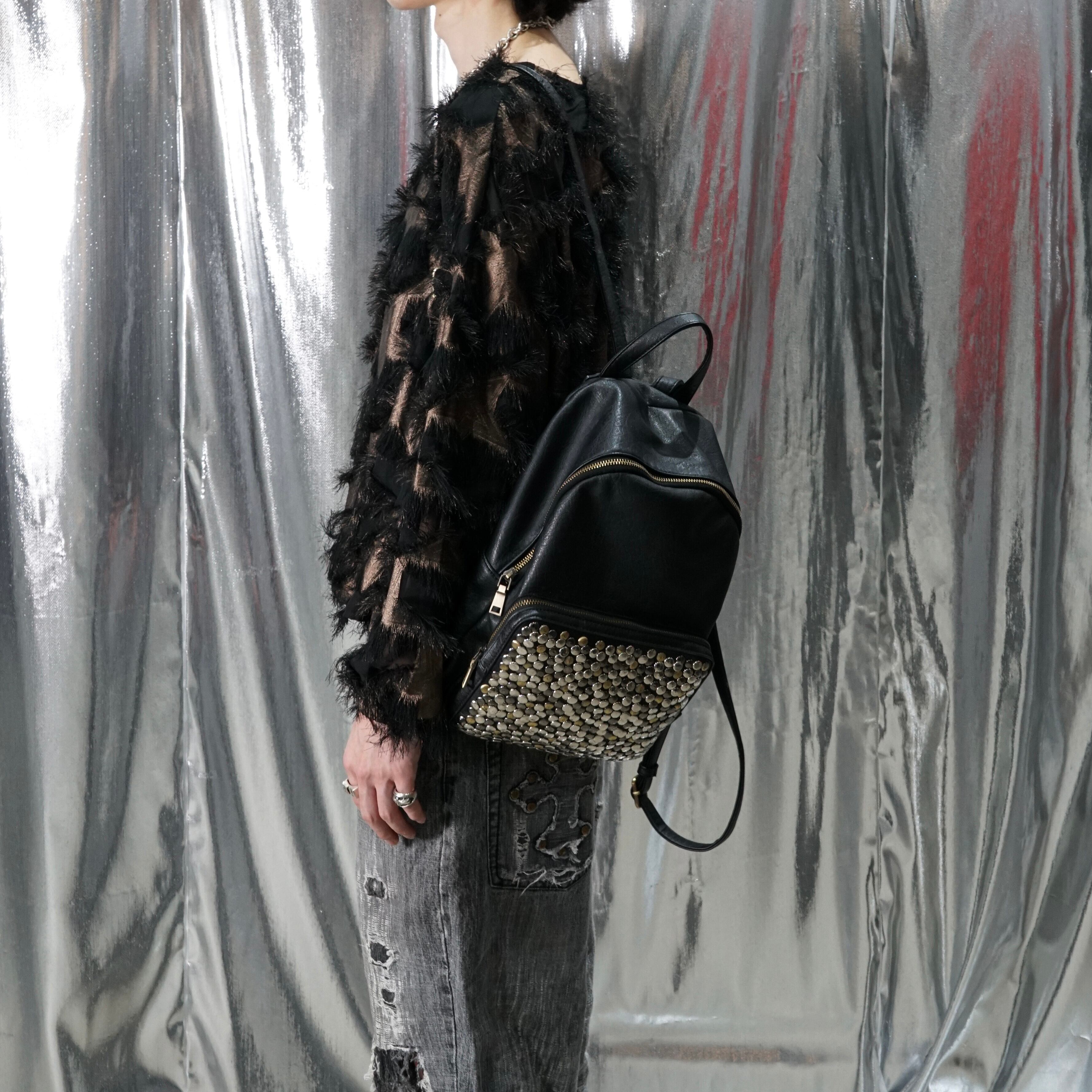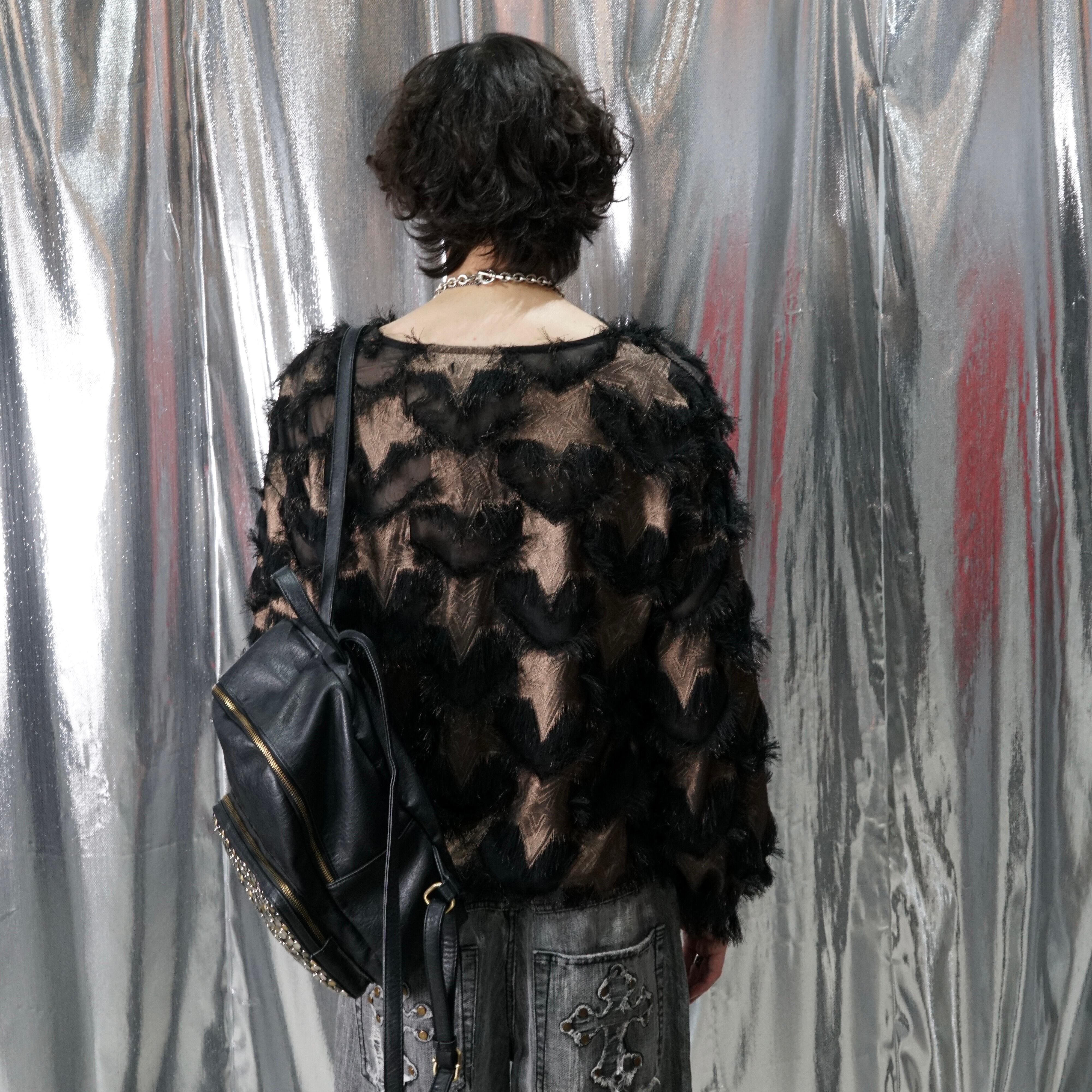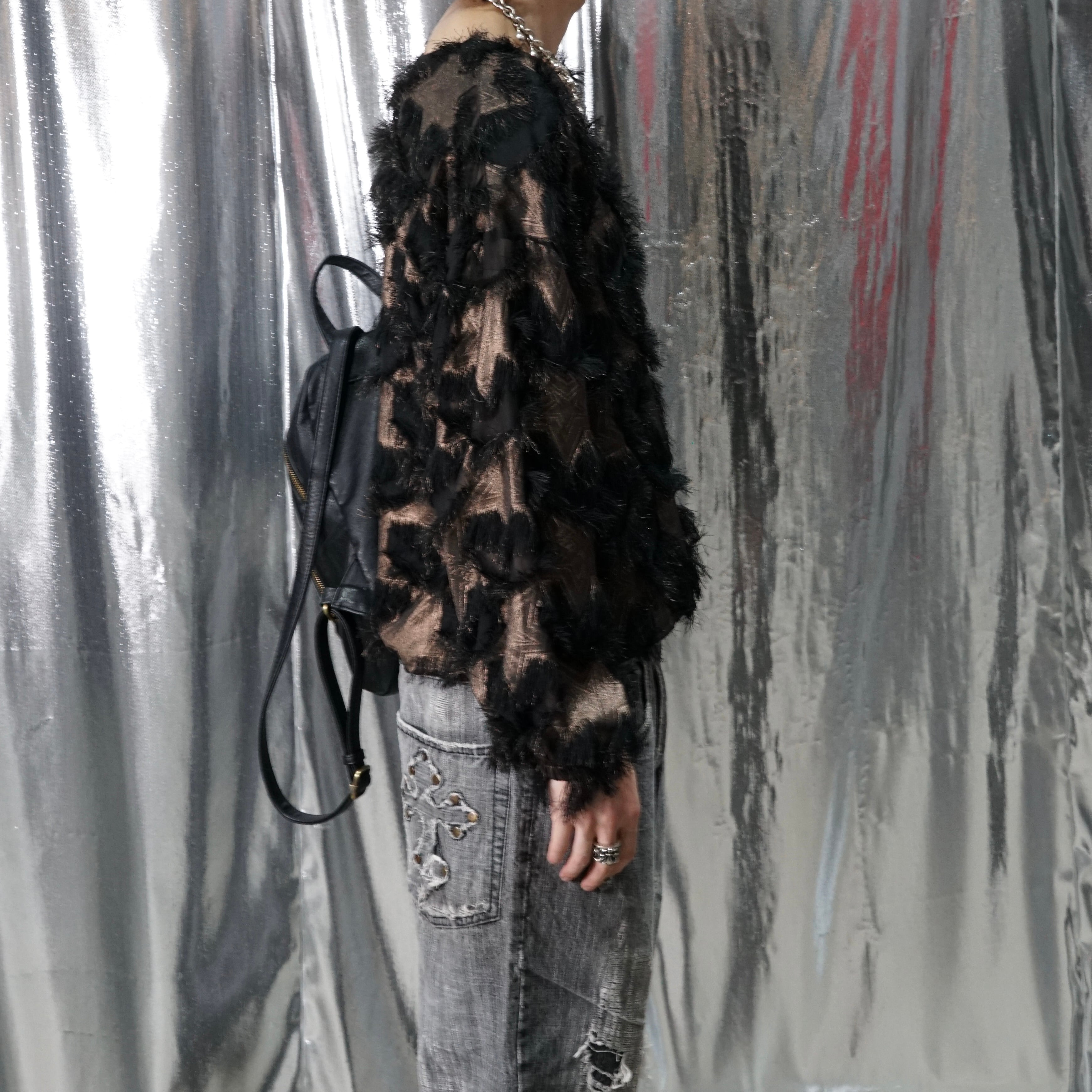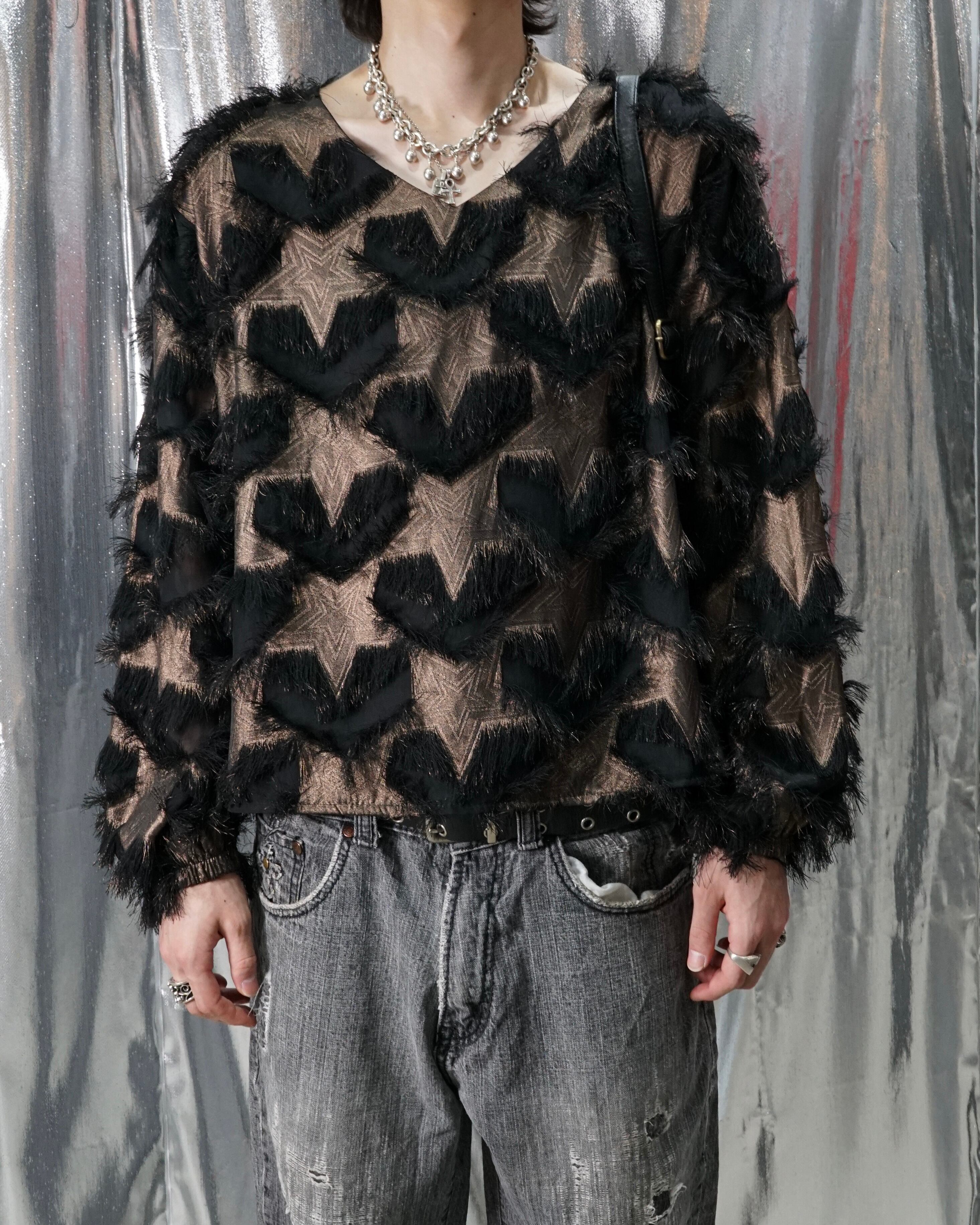 ブラックのメッシュボディに、ブラウンのシャギーで描かれた“スター”と“ハート”のモチーフが浮かび上がる、唯一無二のヴィンテージカットソー。