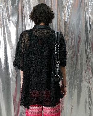 ベースは柔らかく透け感のあるメッシュ地。そこに微細なラメと起毛感のある繊維がミックスされ、光を受けて鈍く妖しく光るような存在感を放ちます。