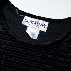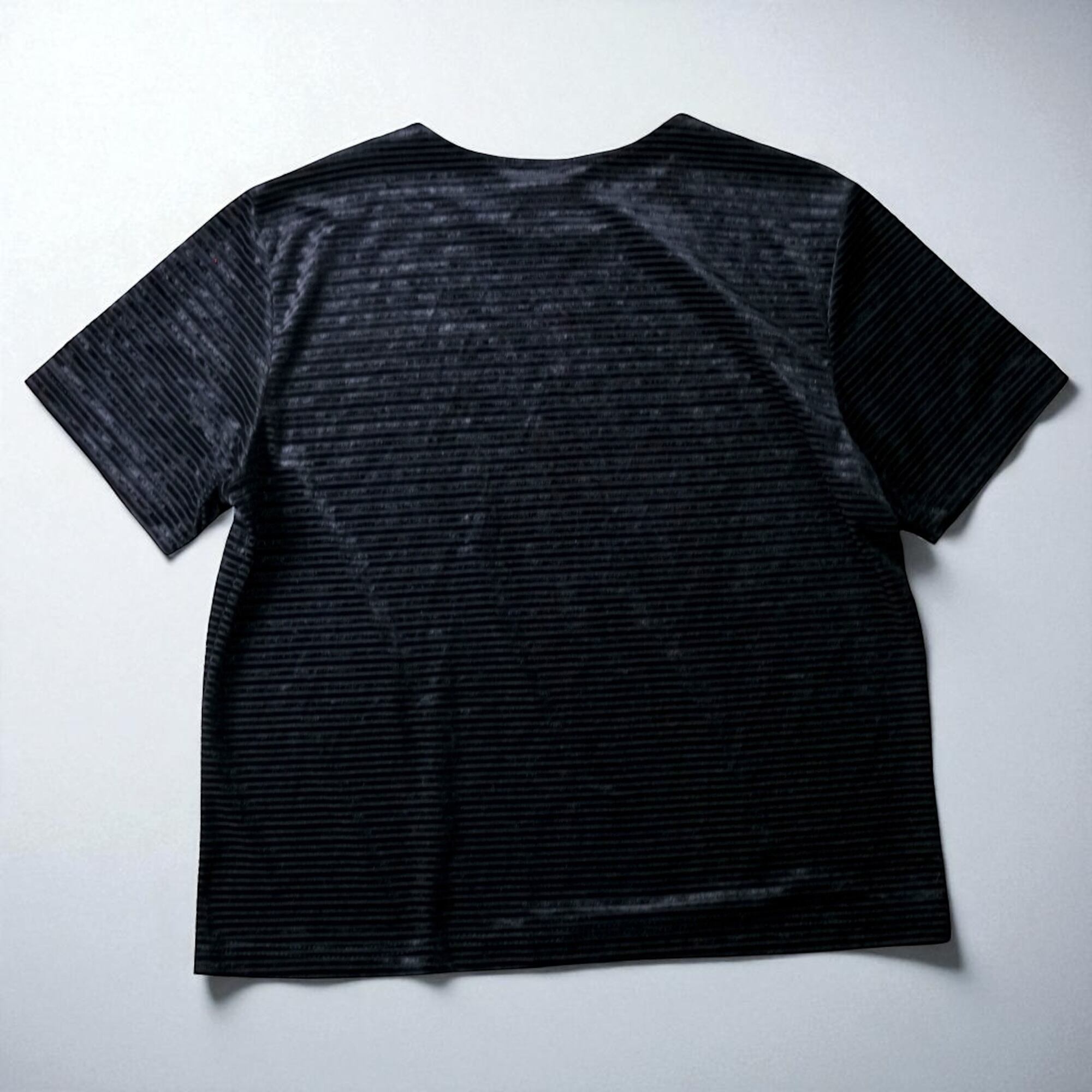 オールブラックの中に織り込まれたさりげないボーダーパターンが魅力ベロアTシャツ。