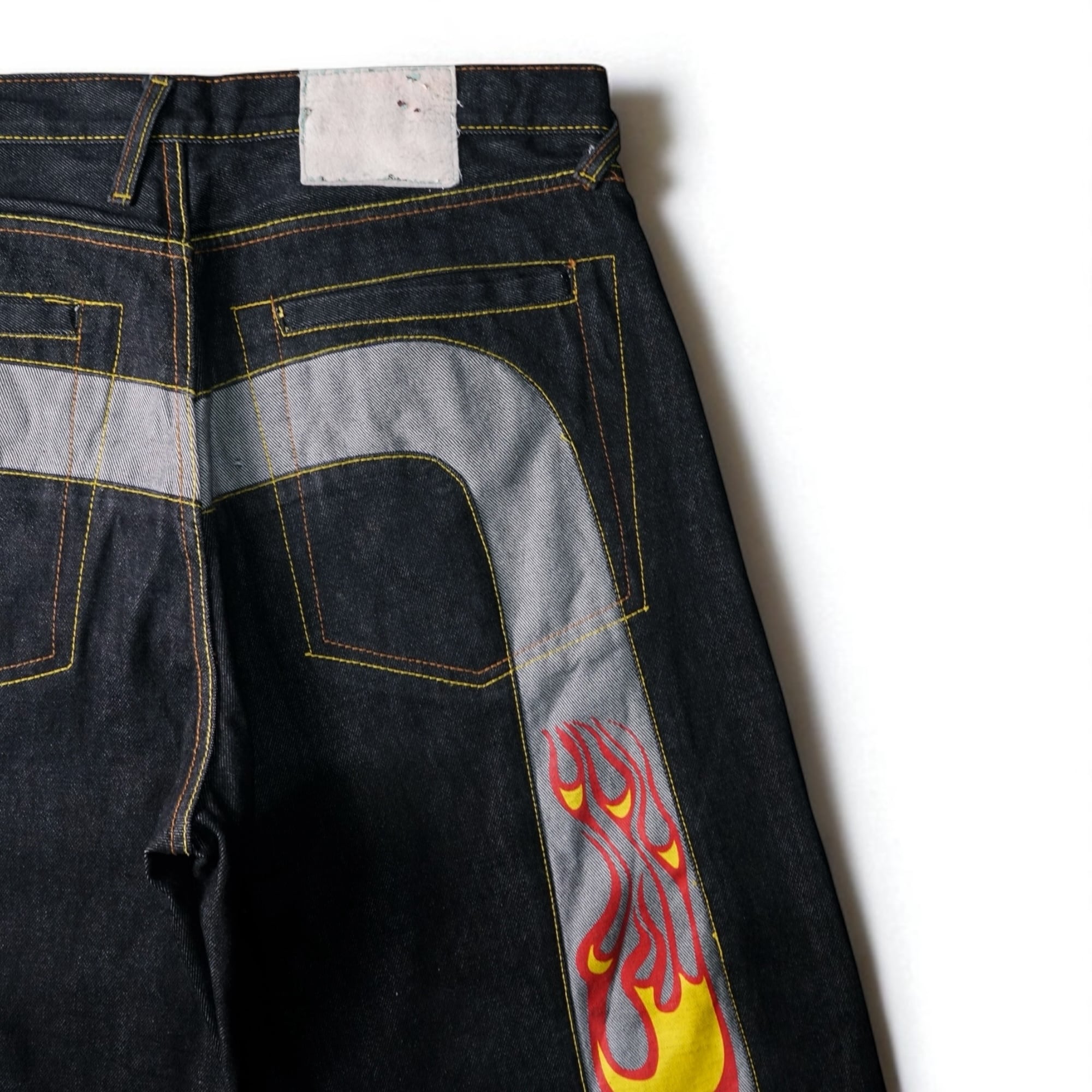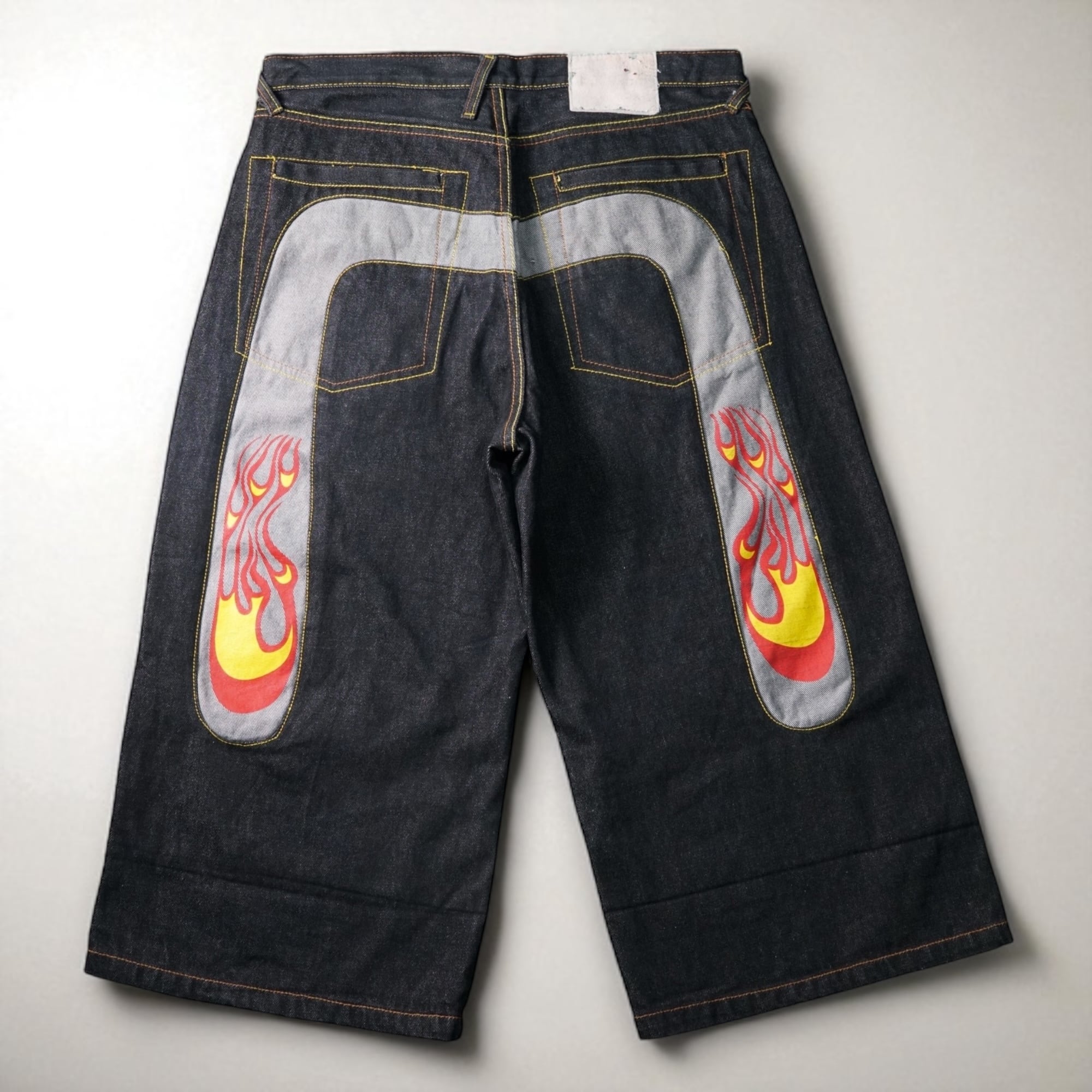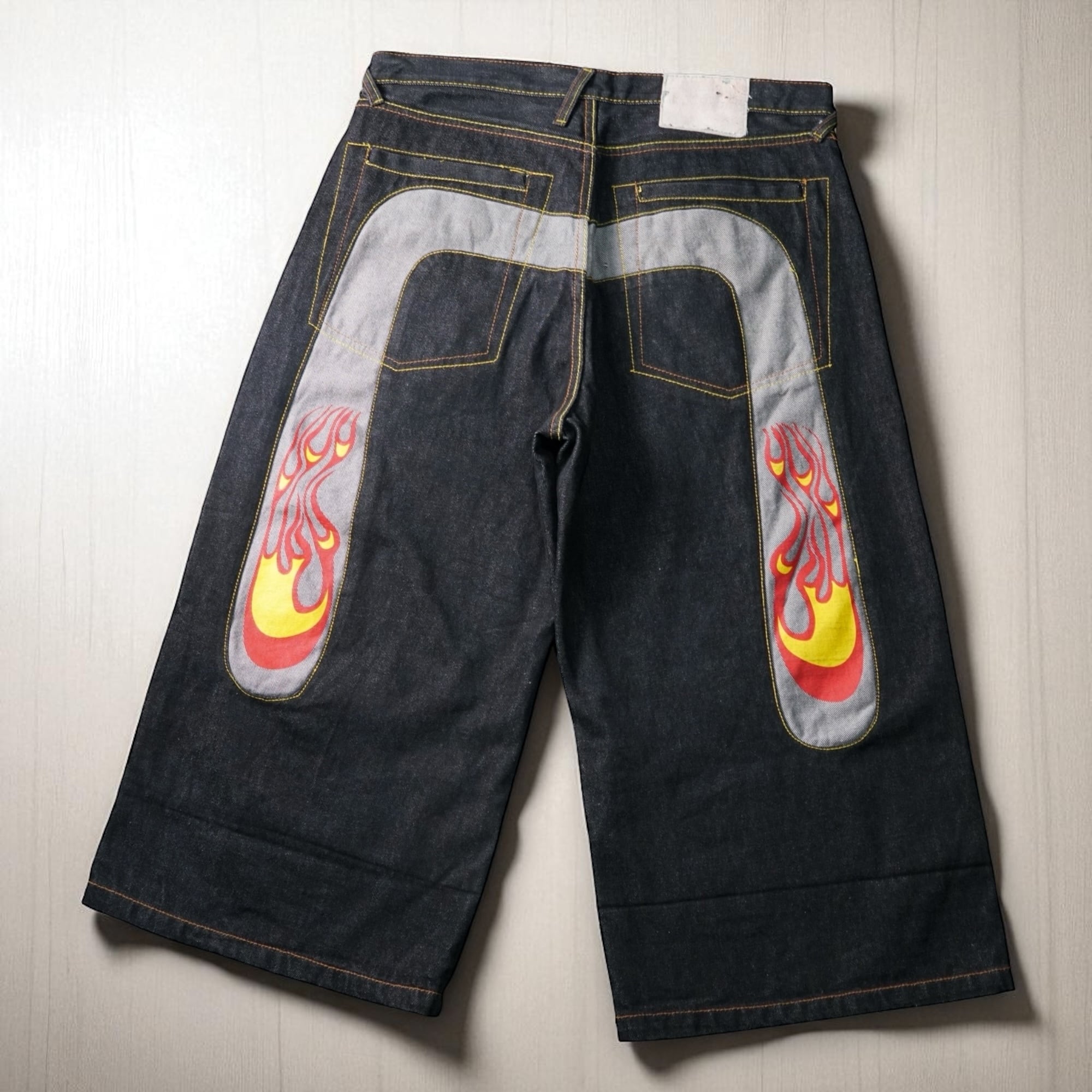 "EVISU Jeans" fire pattern cropped buggy shorts