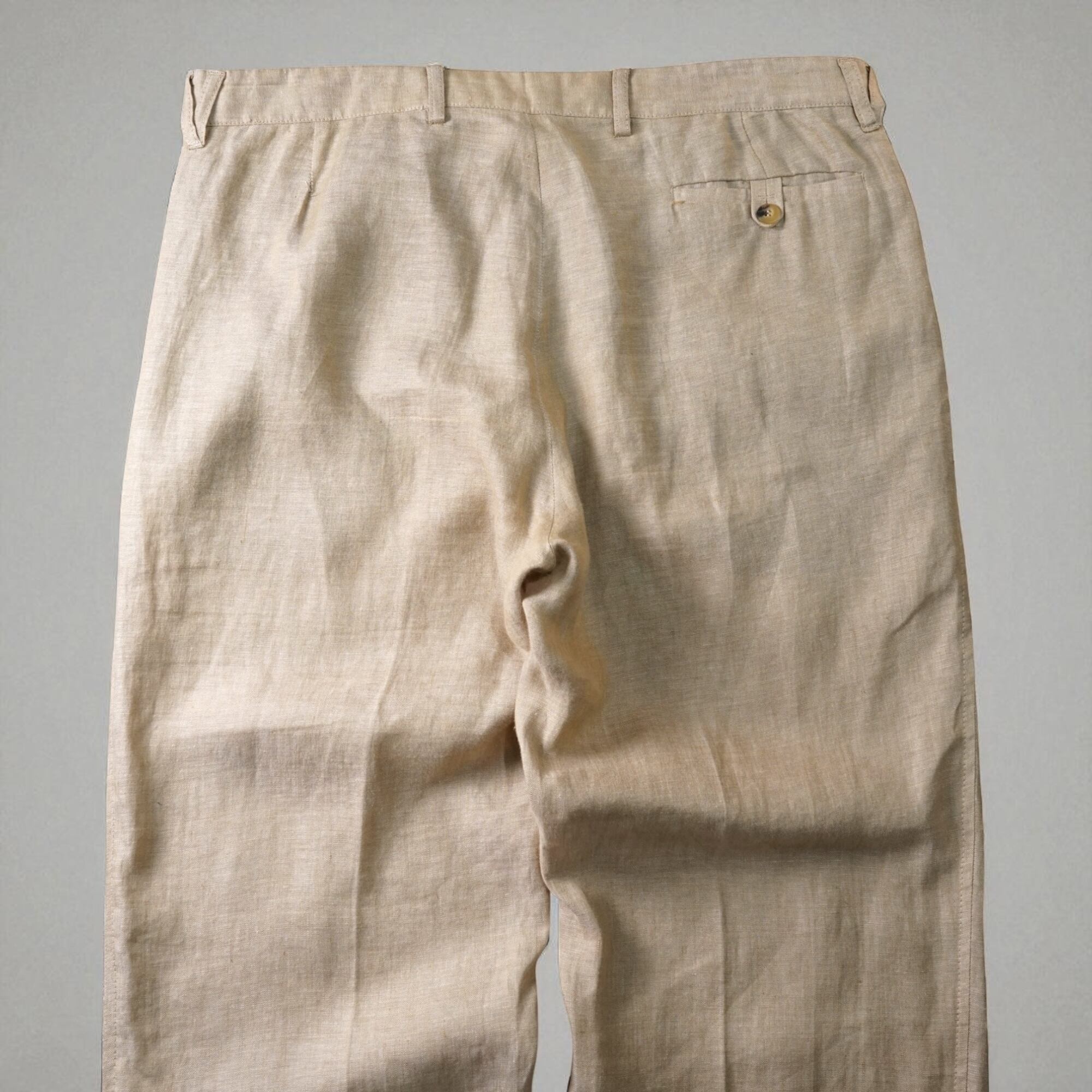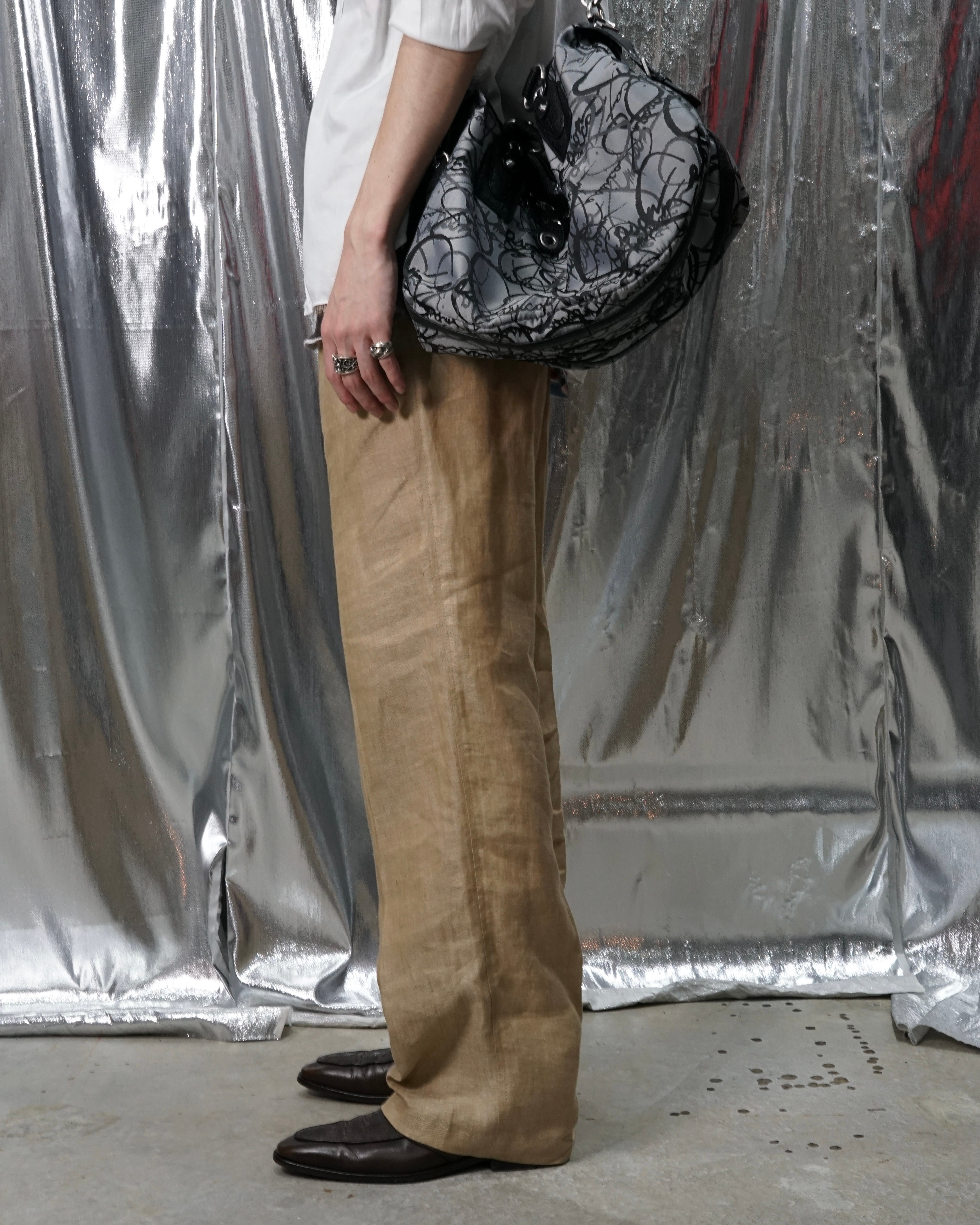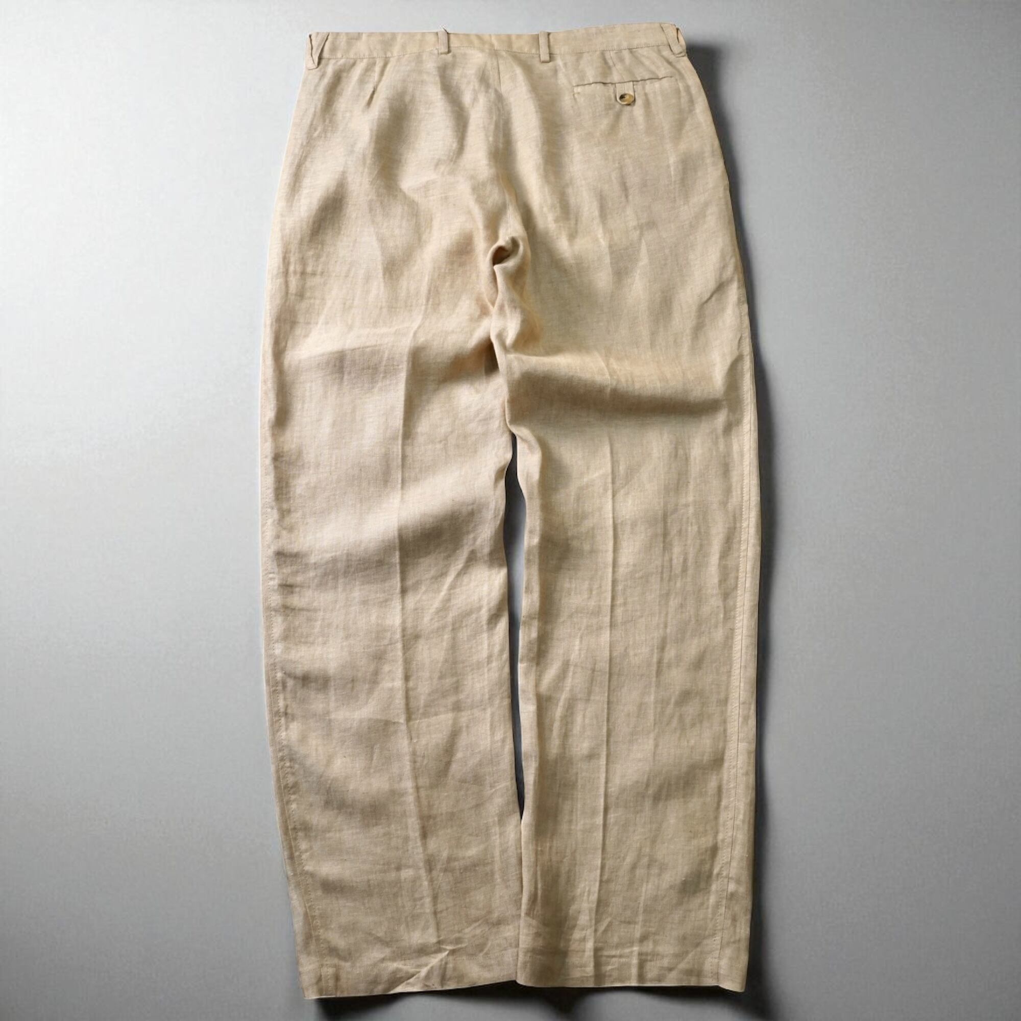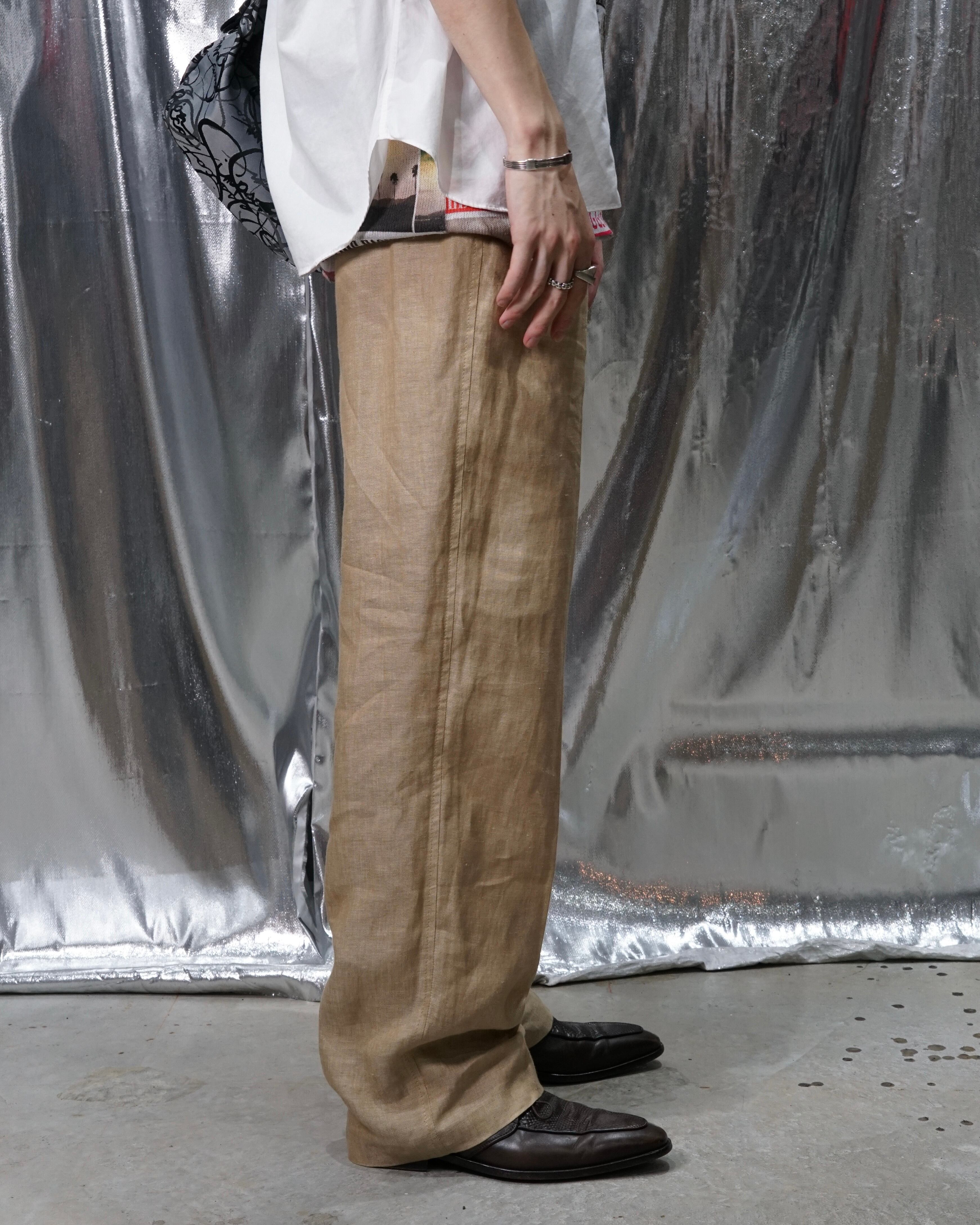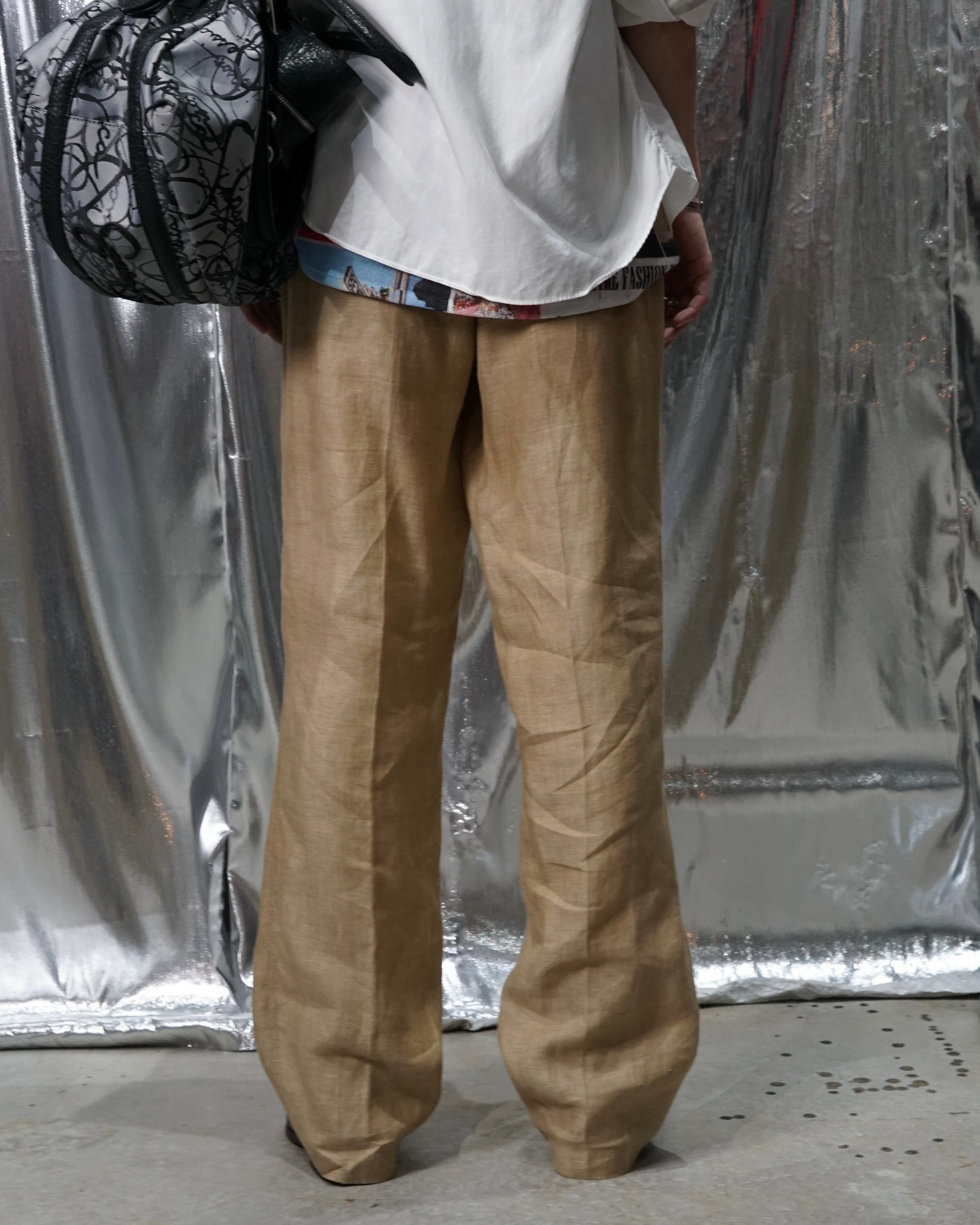ナチュラルなベージュカラーがリラックスしたムードを醸し出し、リネン特有のシワ感さえも上品なニュアンスとして成立する、洗練された一本です。