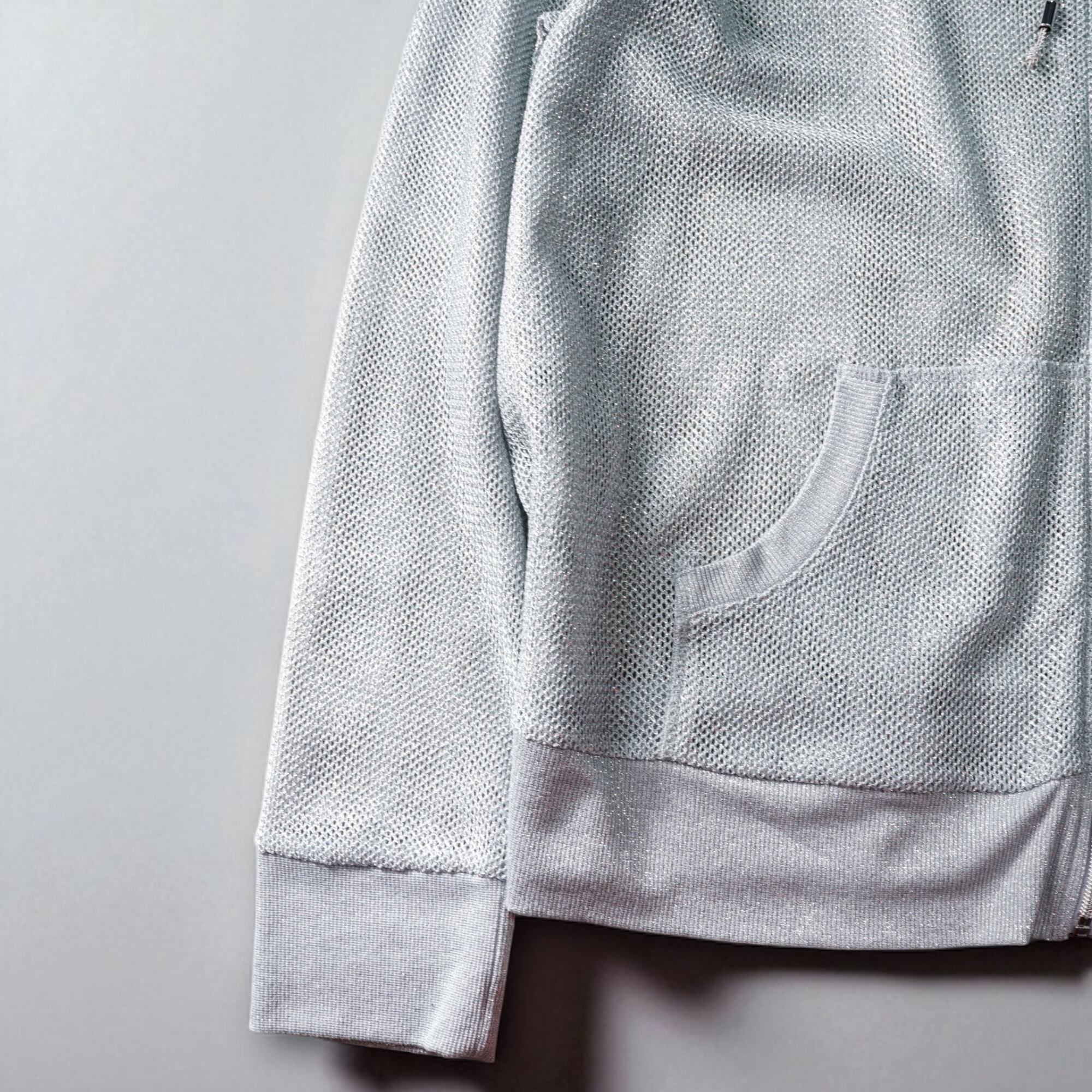 軽やかなメッシュ素材にラメ糸を織り込み、光を受けてさりげなく煌めくジップアップフーディー。