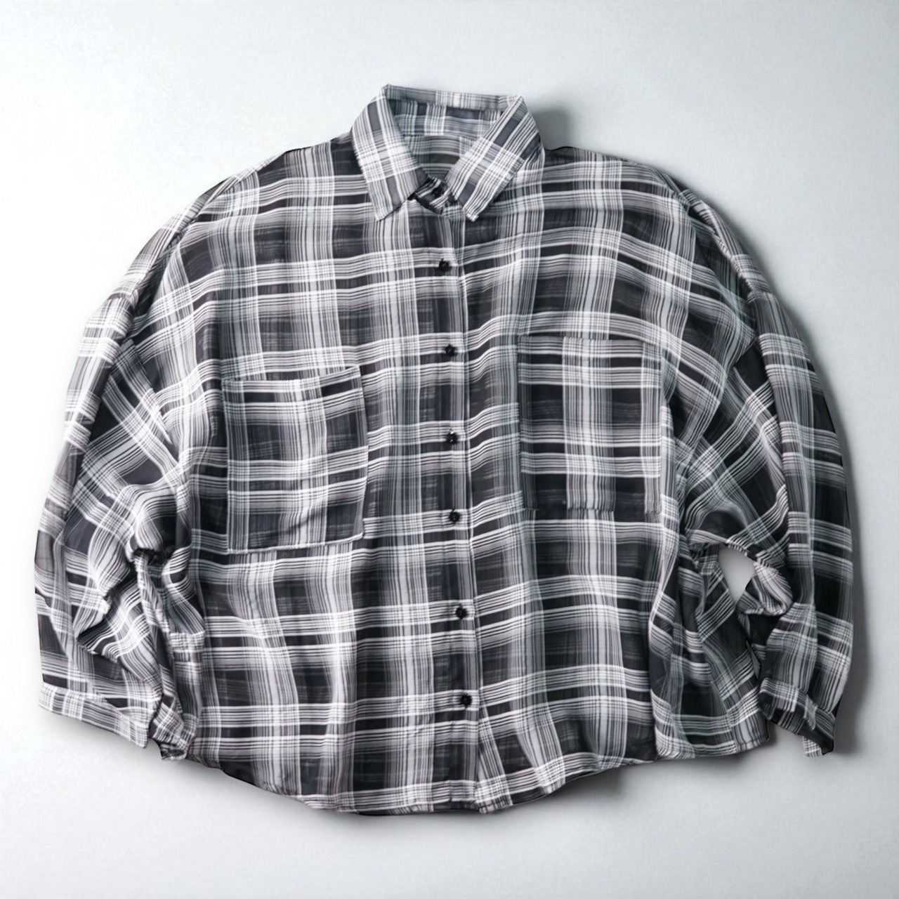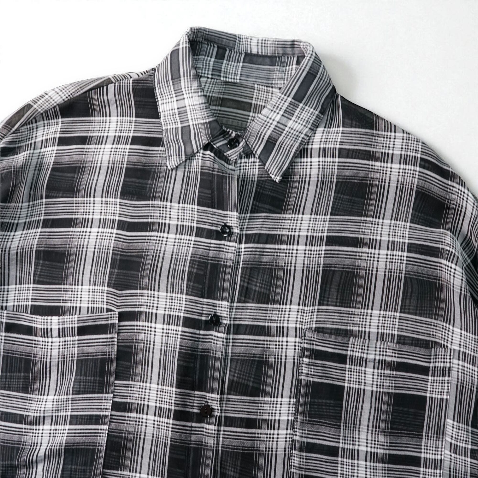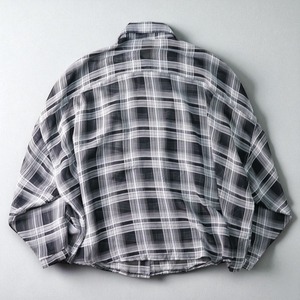 ブラックを基調にしたオンブレチェック柄のシースルーバルーンシャツ。