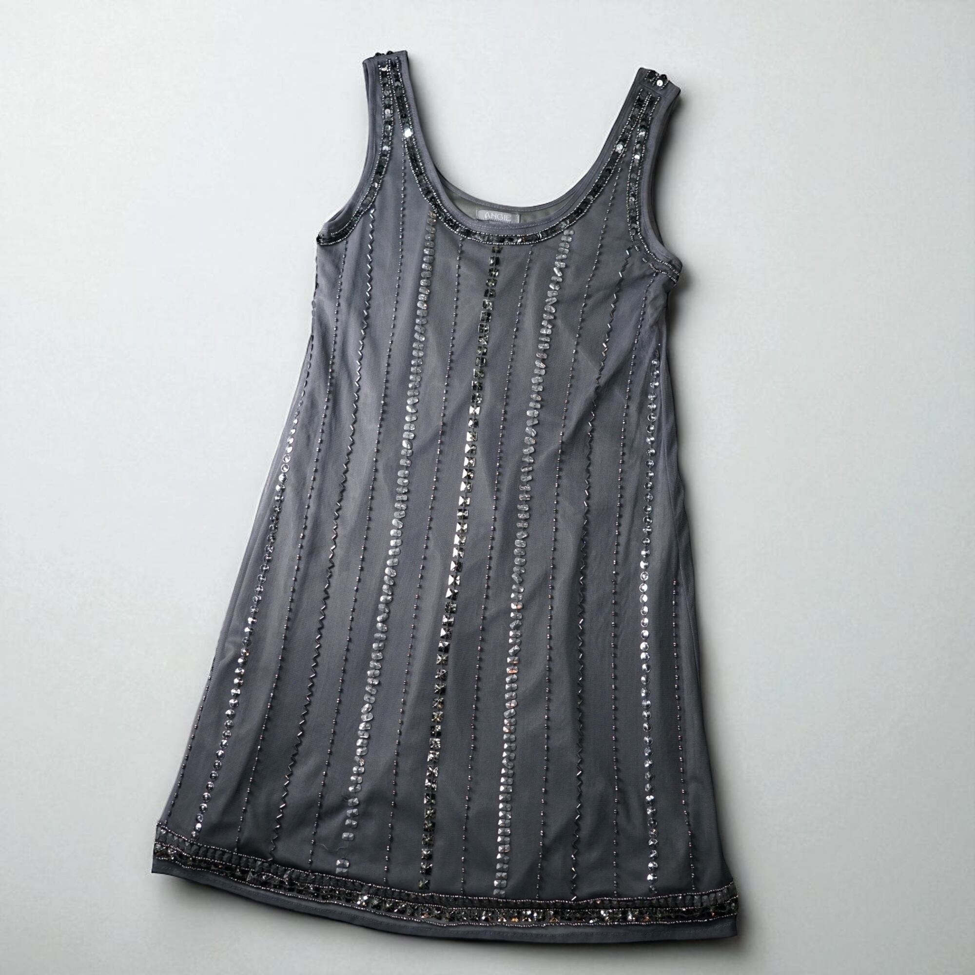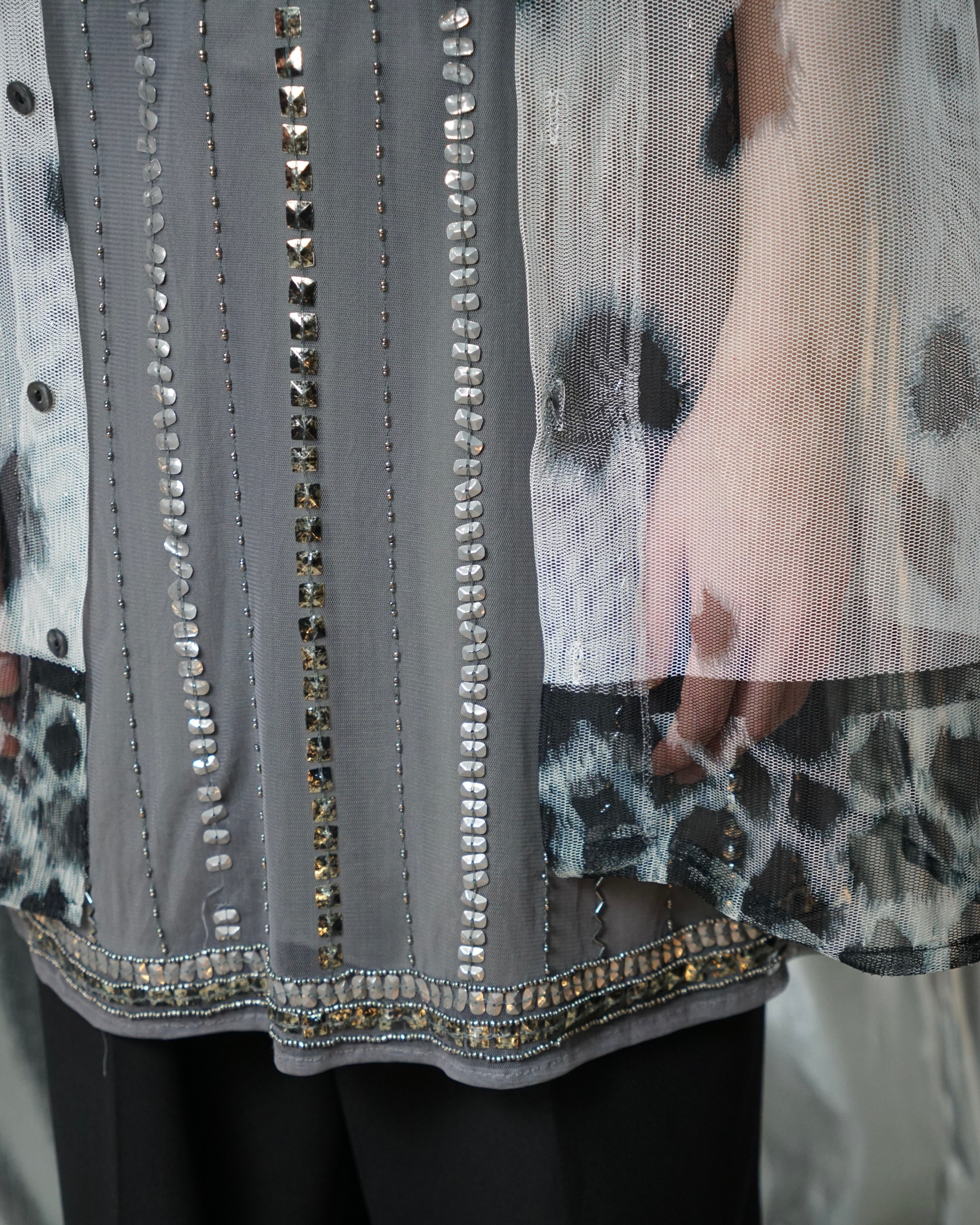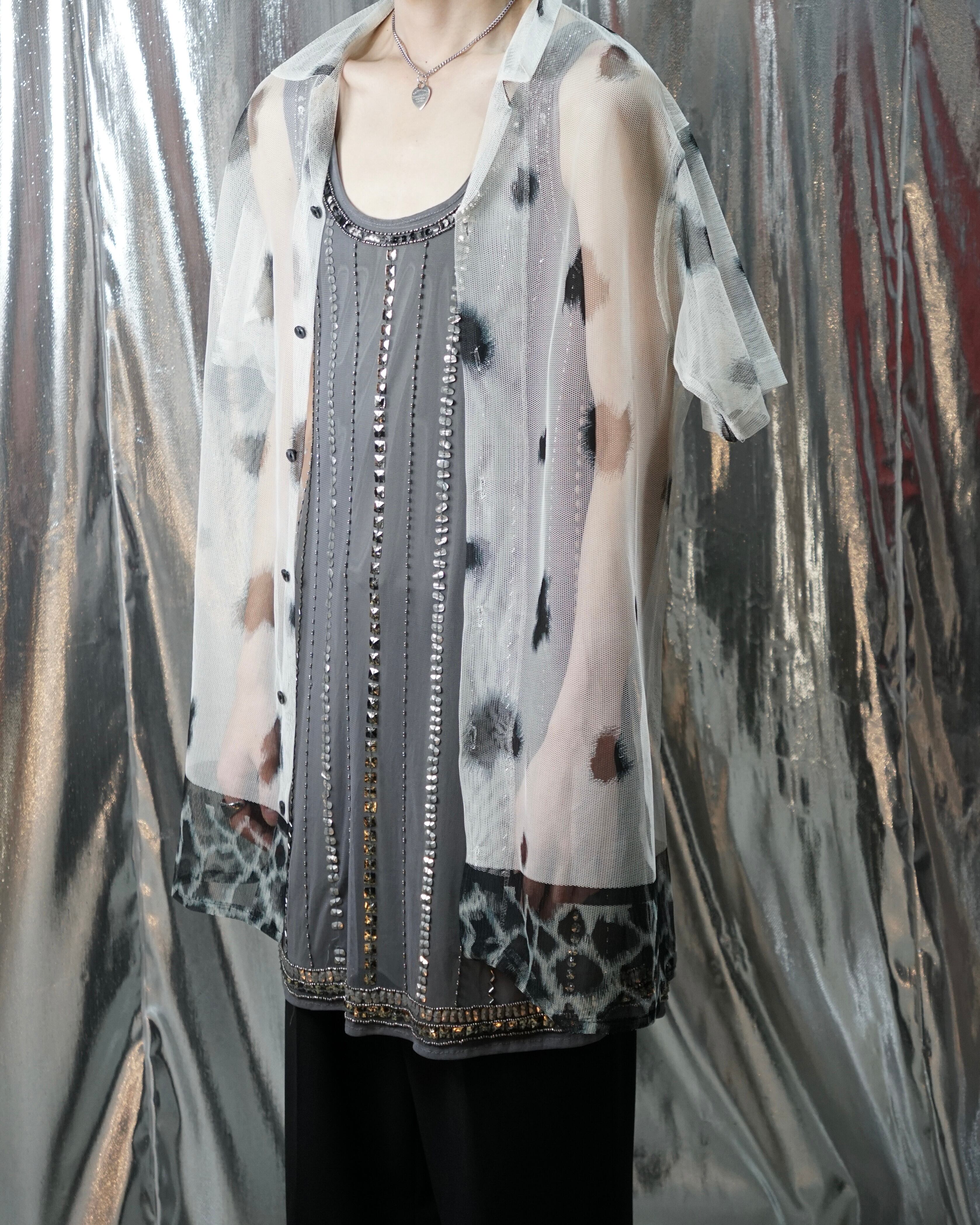 スモーキーなグレーをベースに、四隅、フロントへ配置されたビジュー装飾が輝くロングタンクトップ。