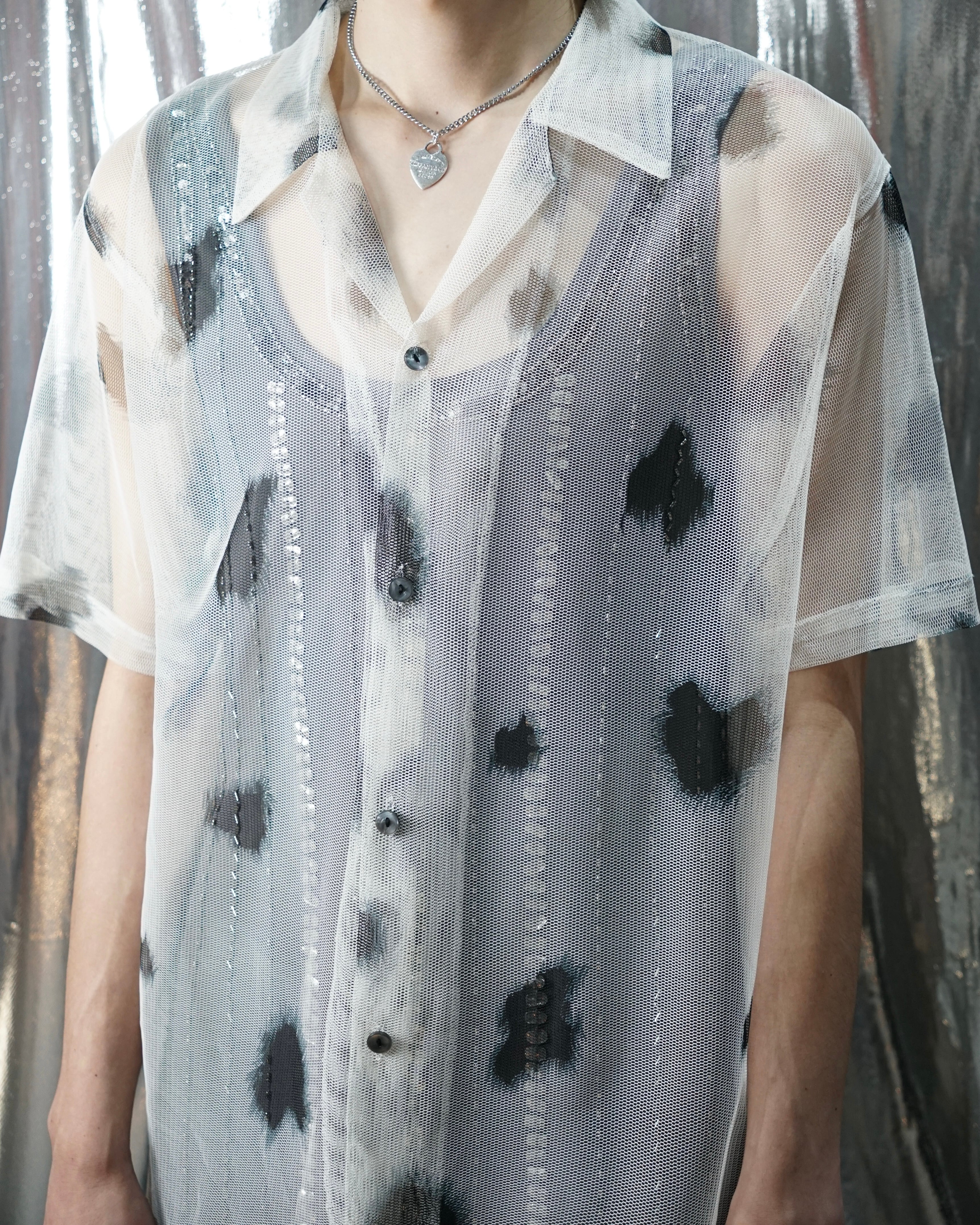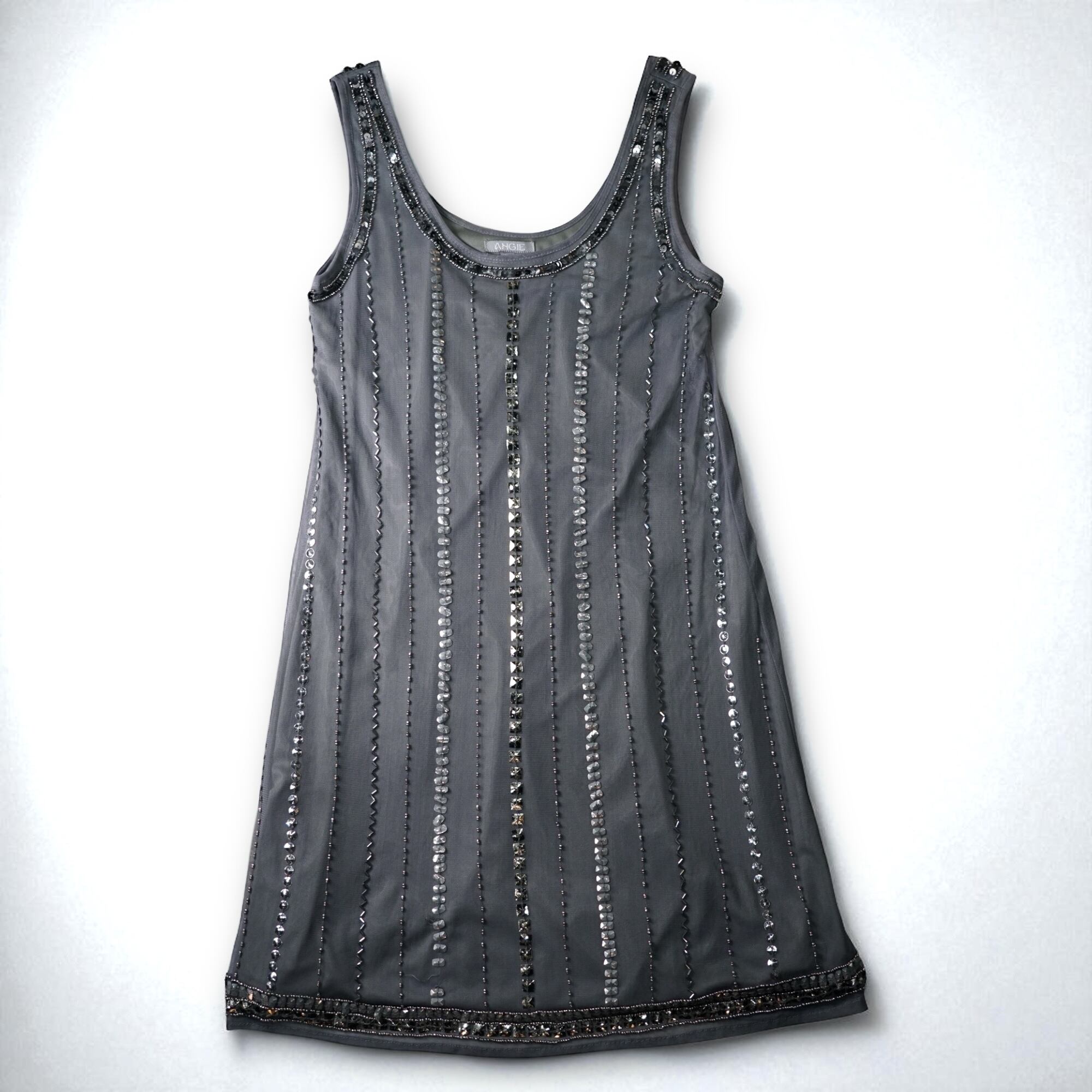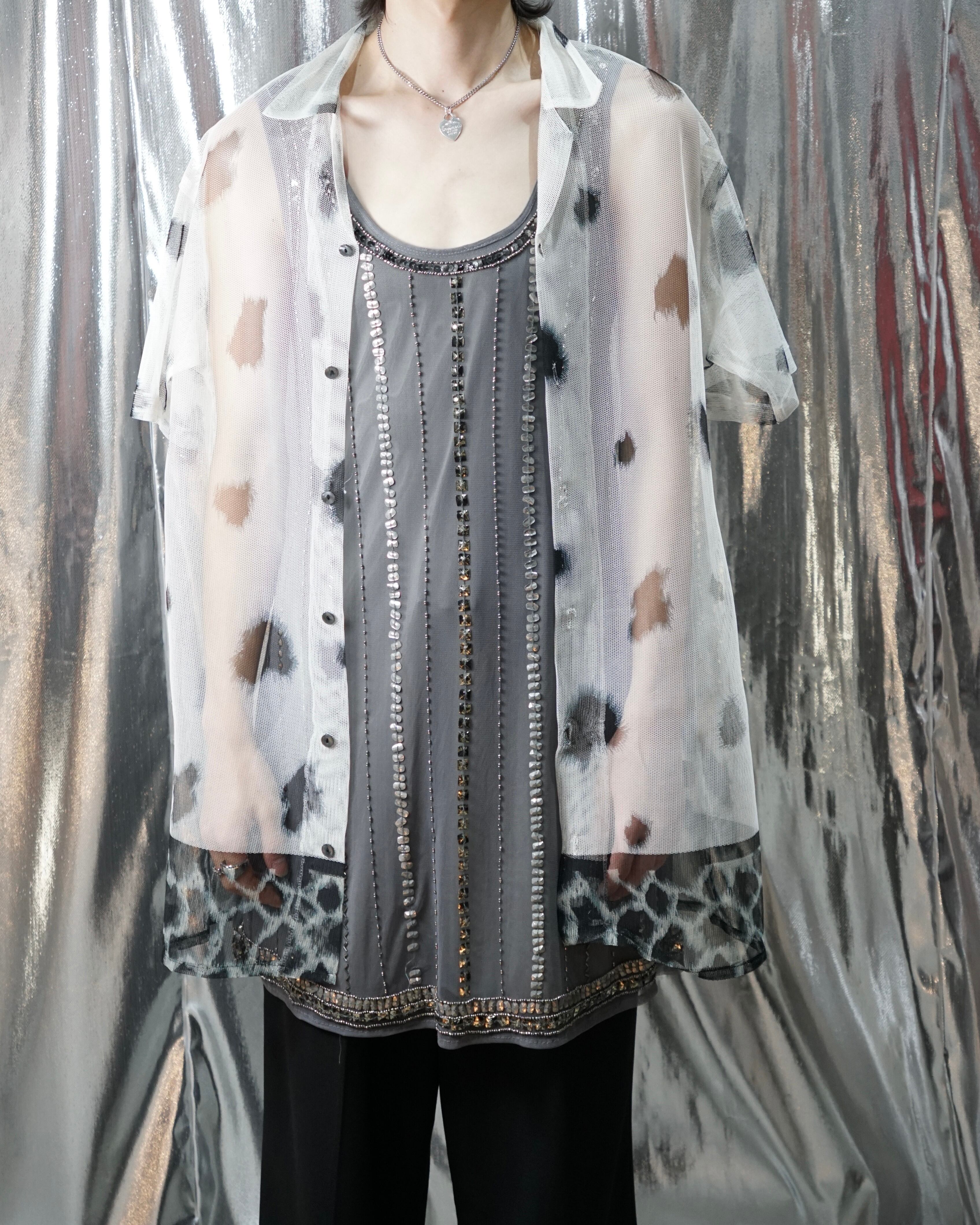 スモーキーなグレーをベースに、四隅、フロントへ配置されたビジュー装飾が輝くロングタンクトップ。