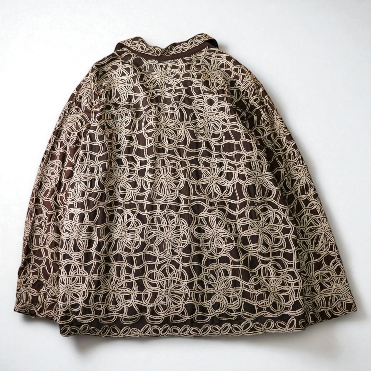 深みのあるブラウンカラーが落ち着いた印象を与えつつ、透け感と刺繍の組み合わせが上品さと抜け感を演出します。