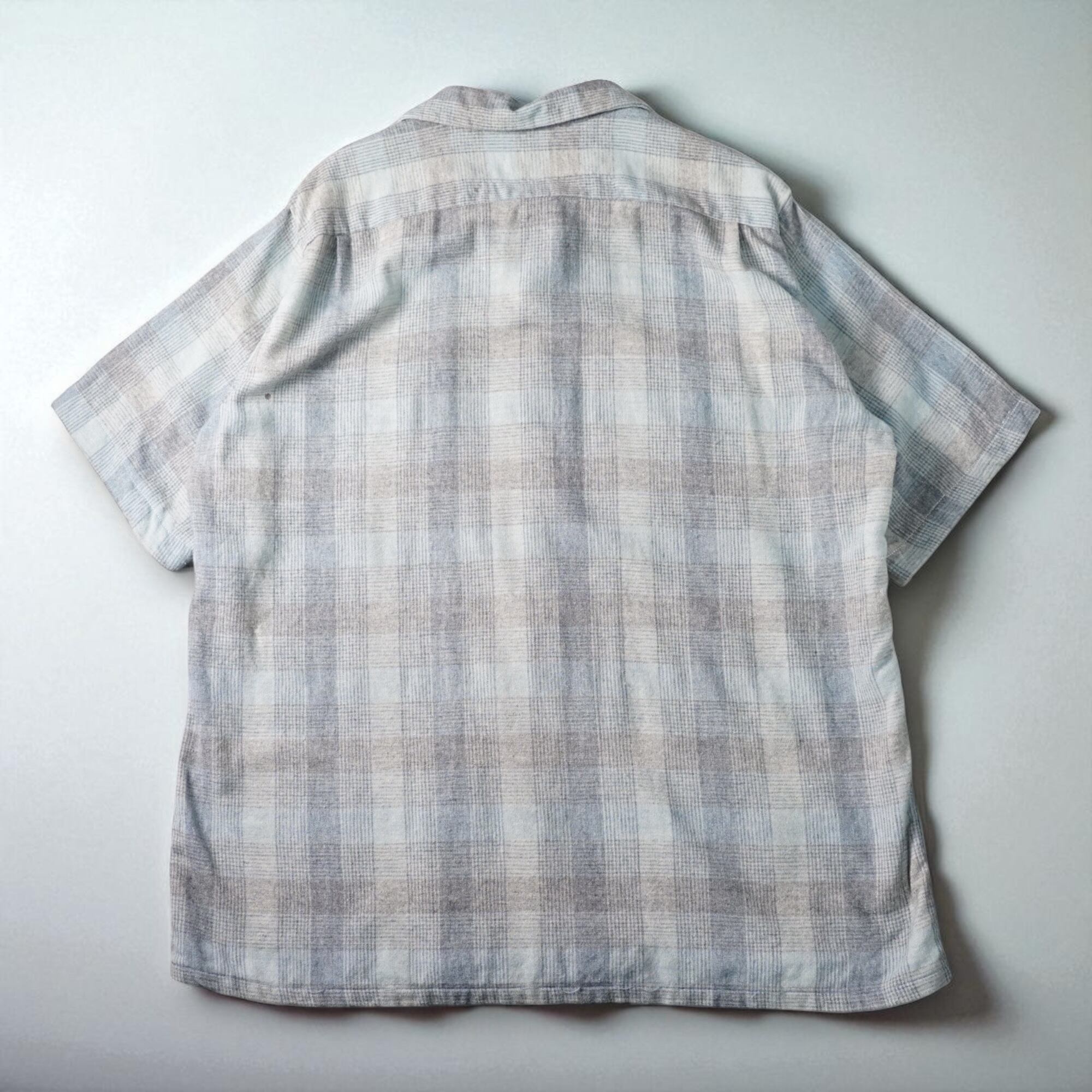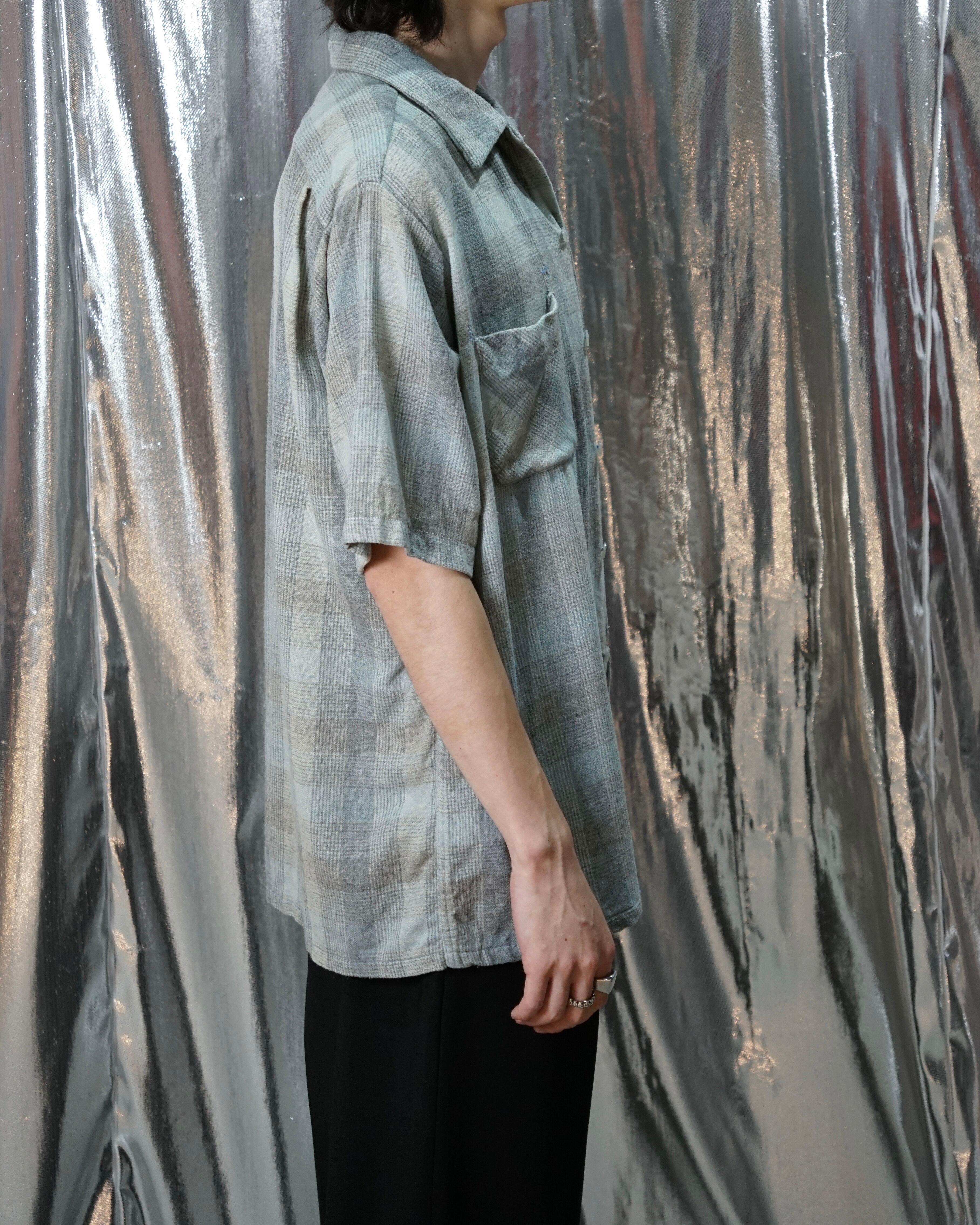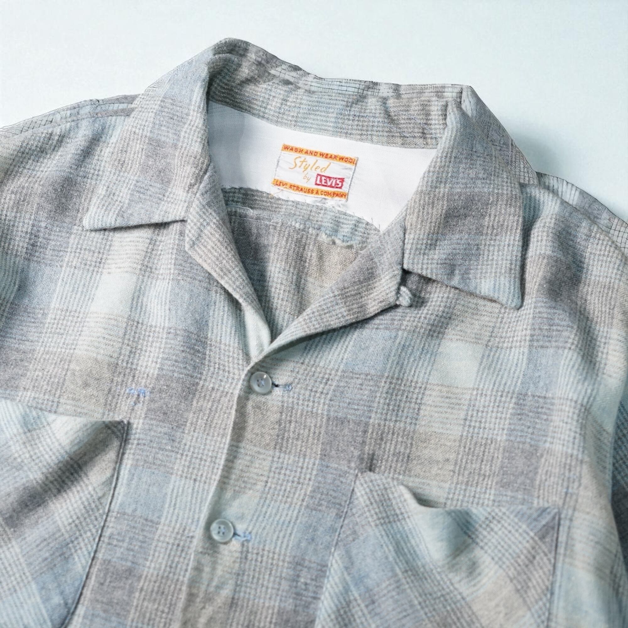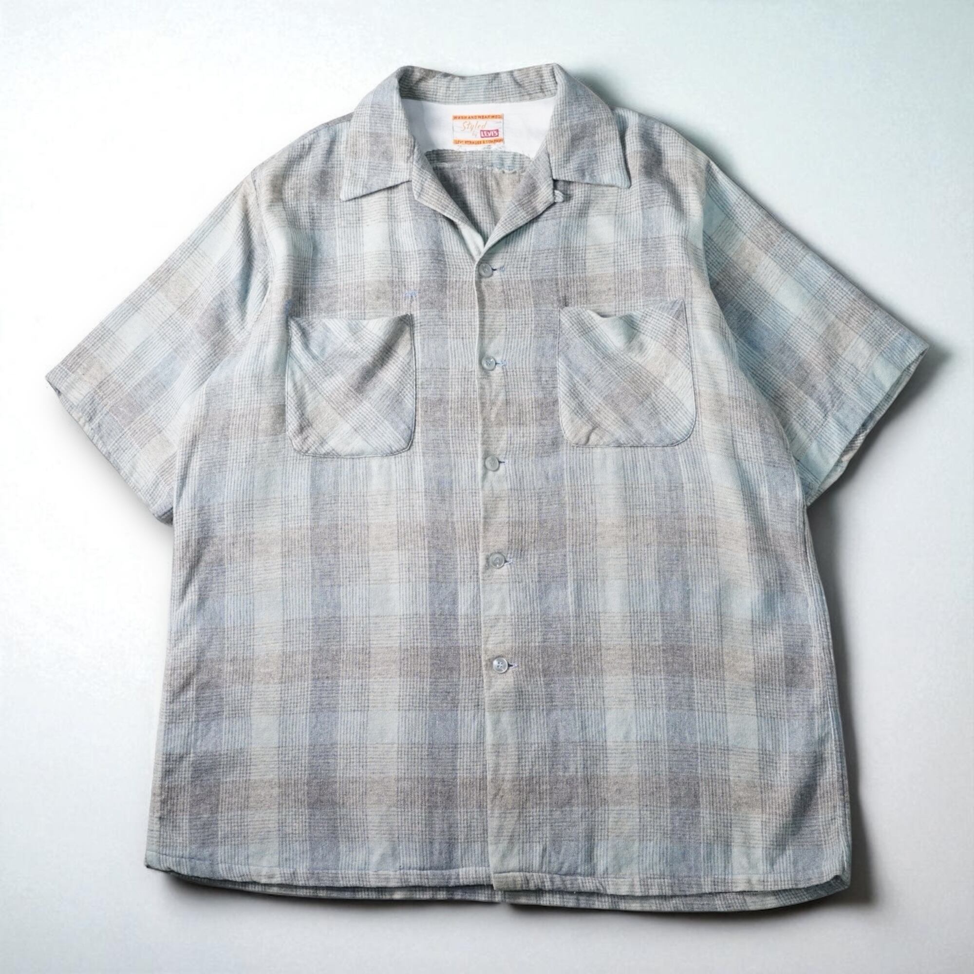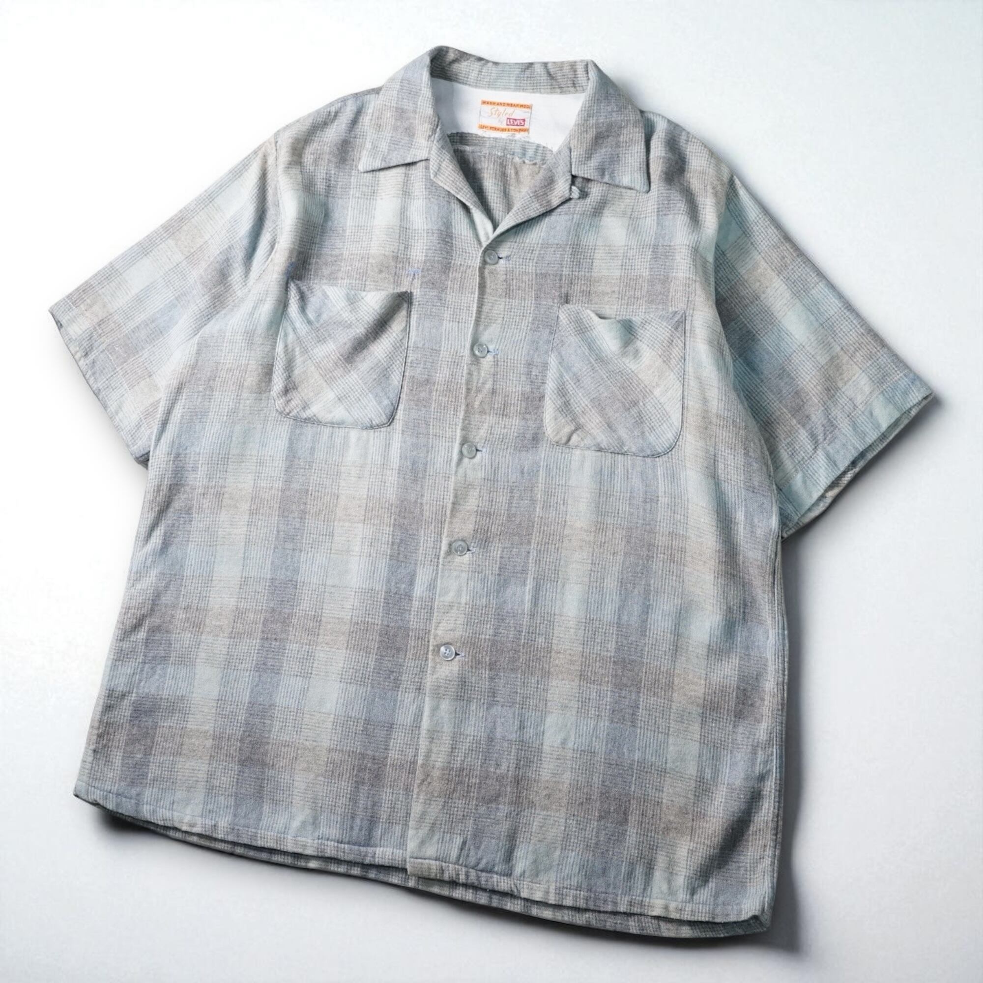 淡い水色とグレーで構成された柔らかなチェック柄が、どこか品のある佇まいを見せる1960年代のヴィンテージシャツ。