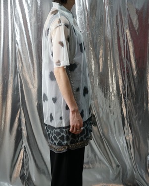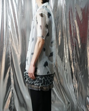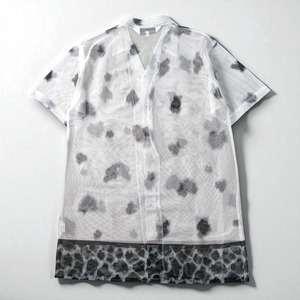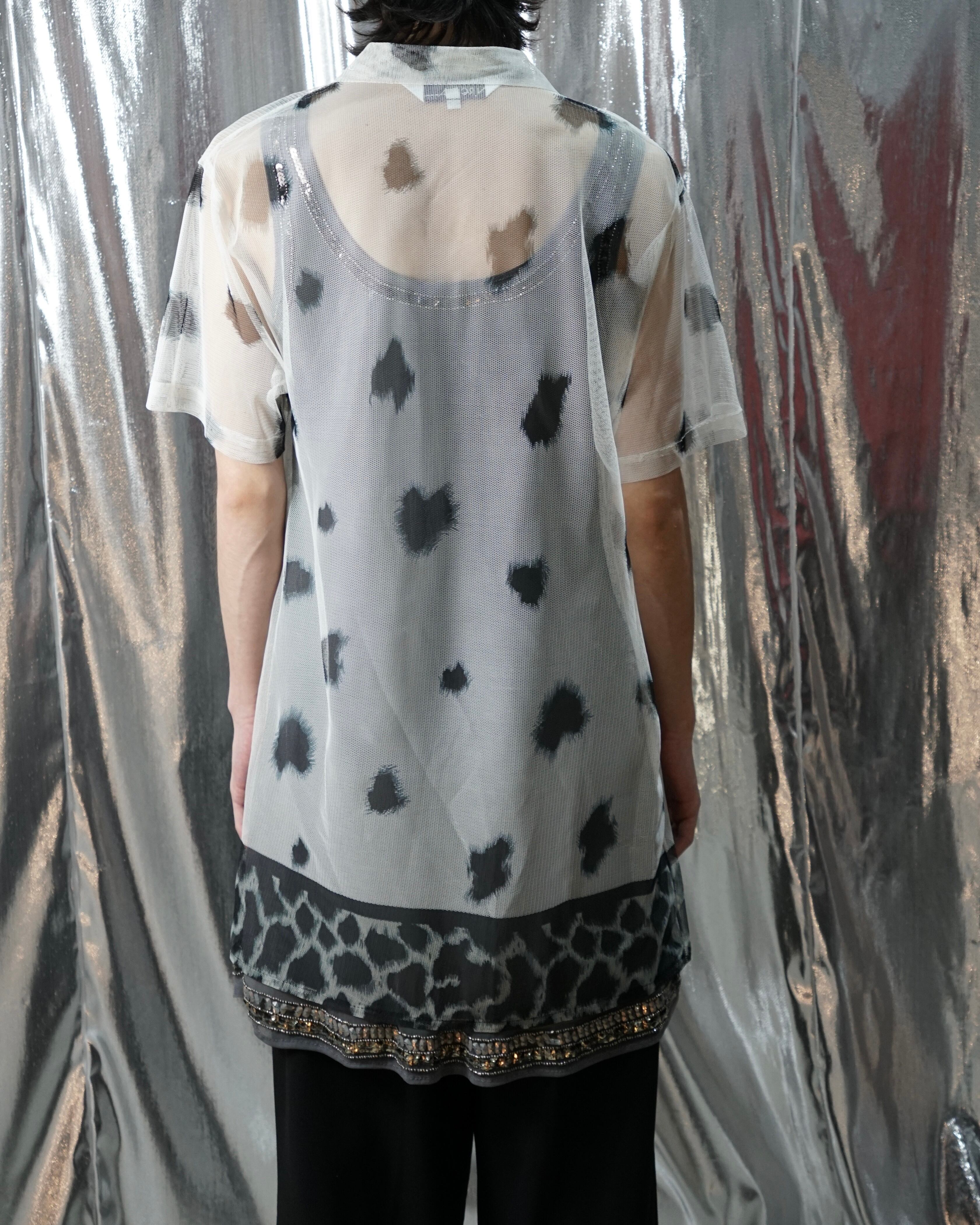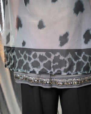裾には印象的なレオパード柄を配し、それ以外の部分はまだらなアニマルパターンで構成された独特のデザイン。