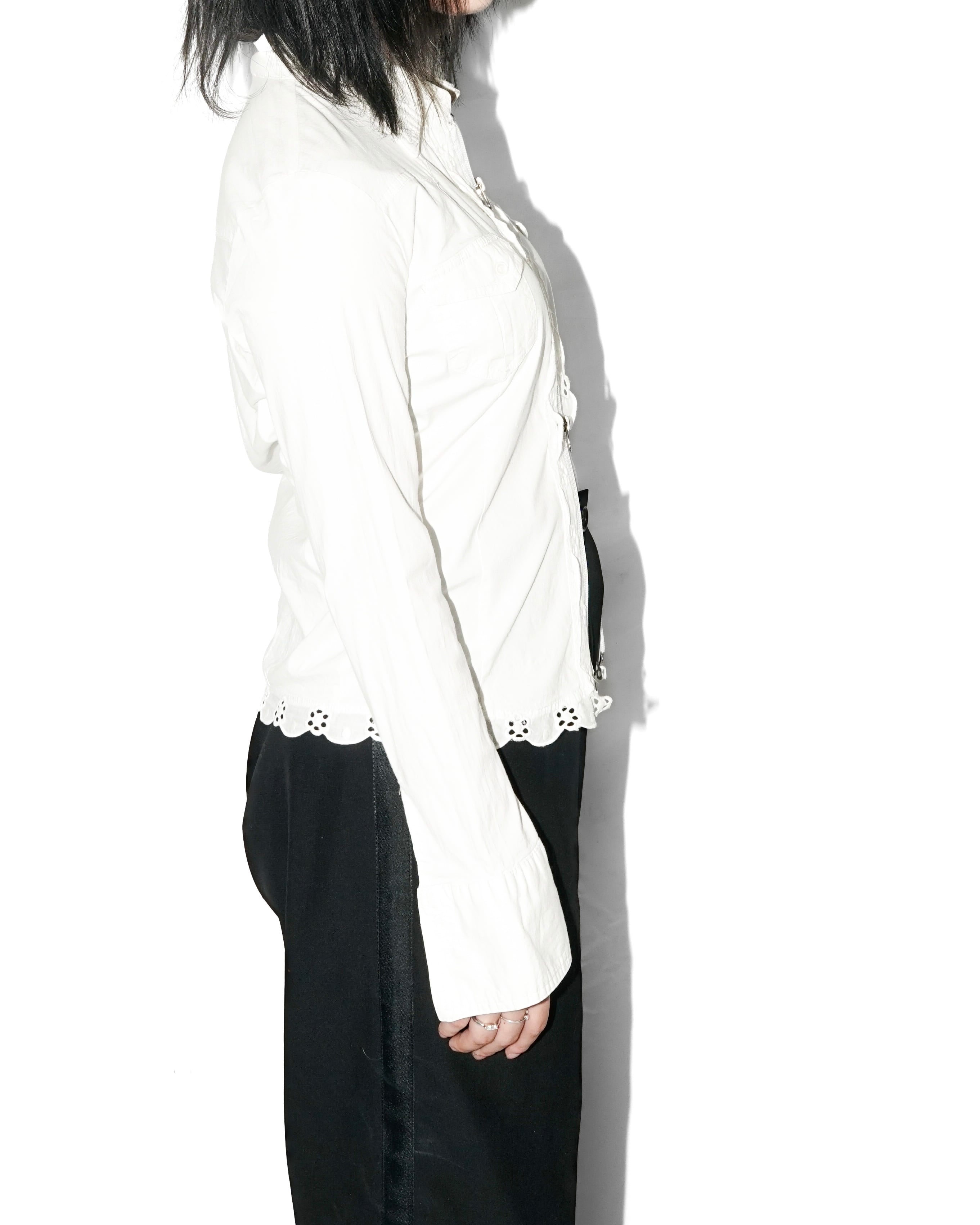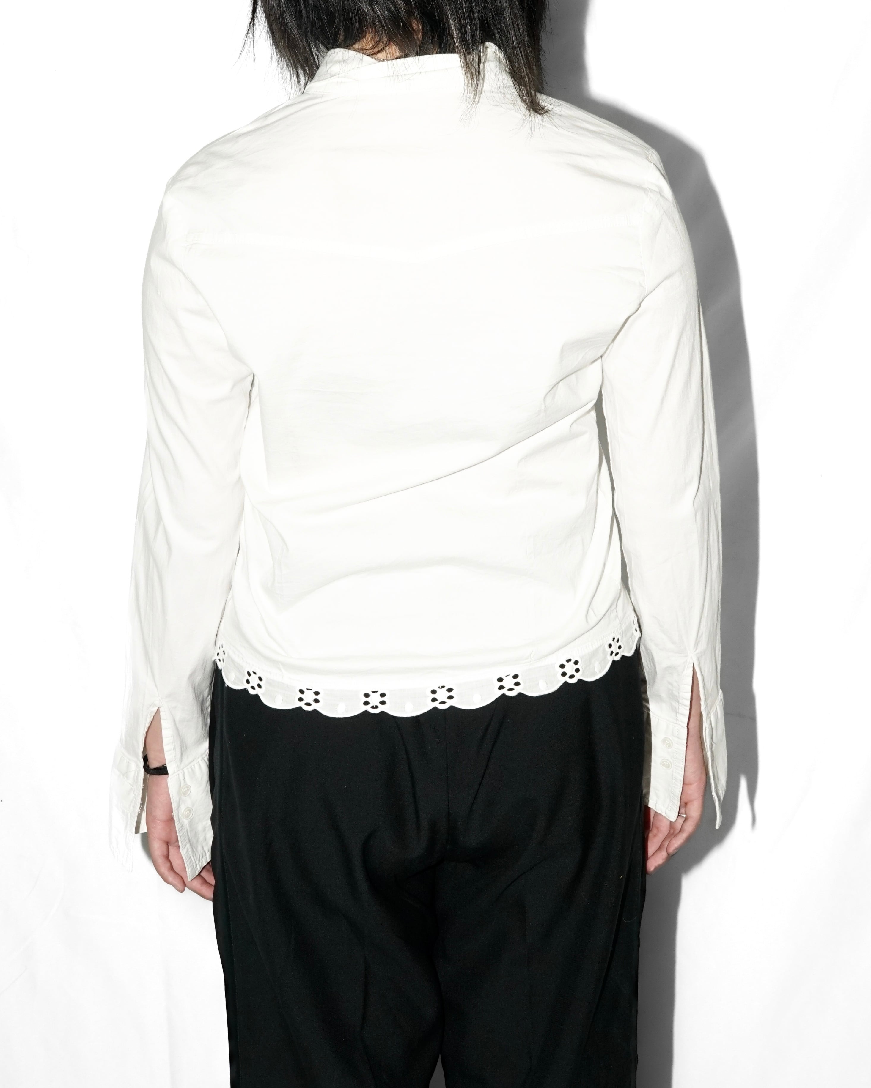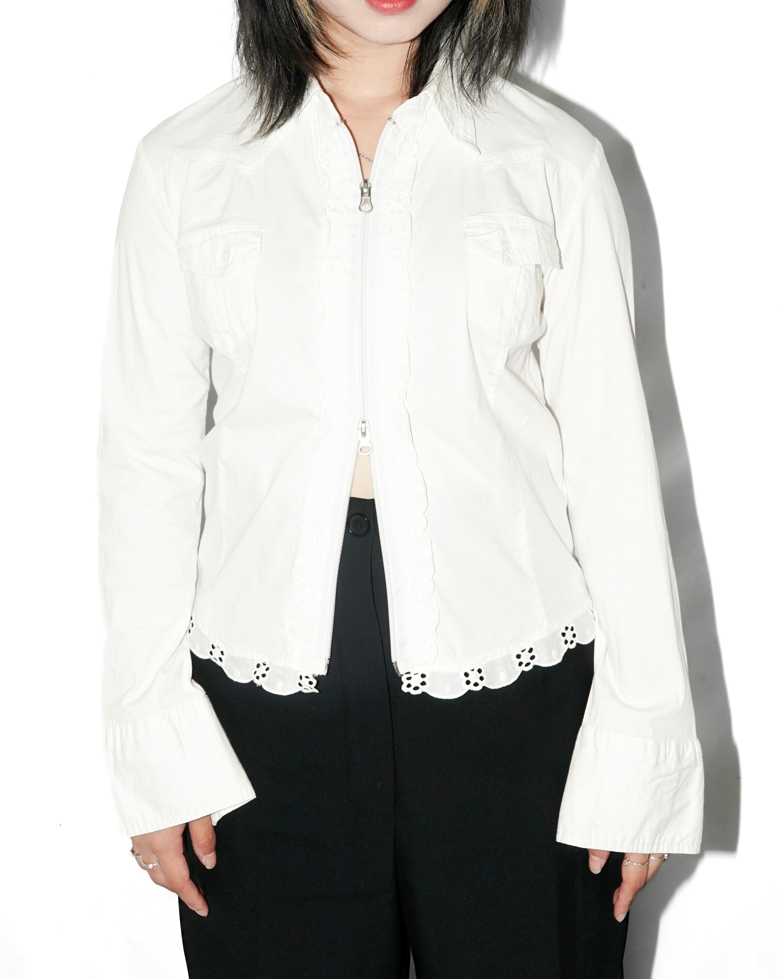 繊細なフラワースカラップを裾にあしらい、ウエスタンヨークの切り替えとダブルジップ仕様を組み合わせたショートシャツ。