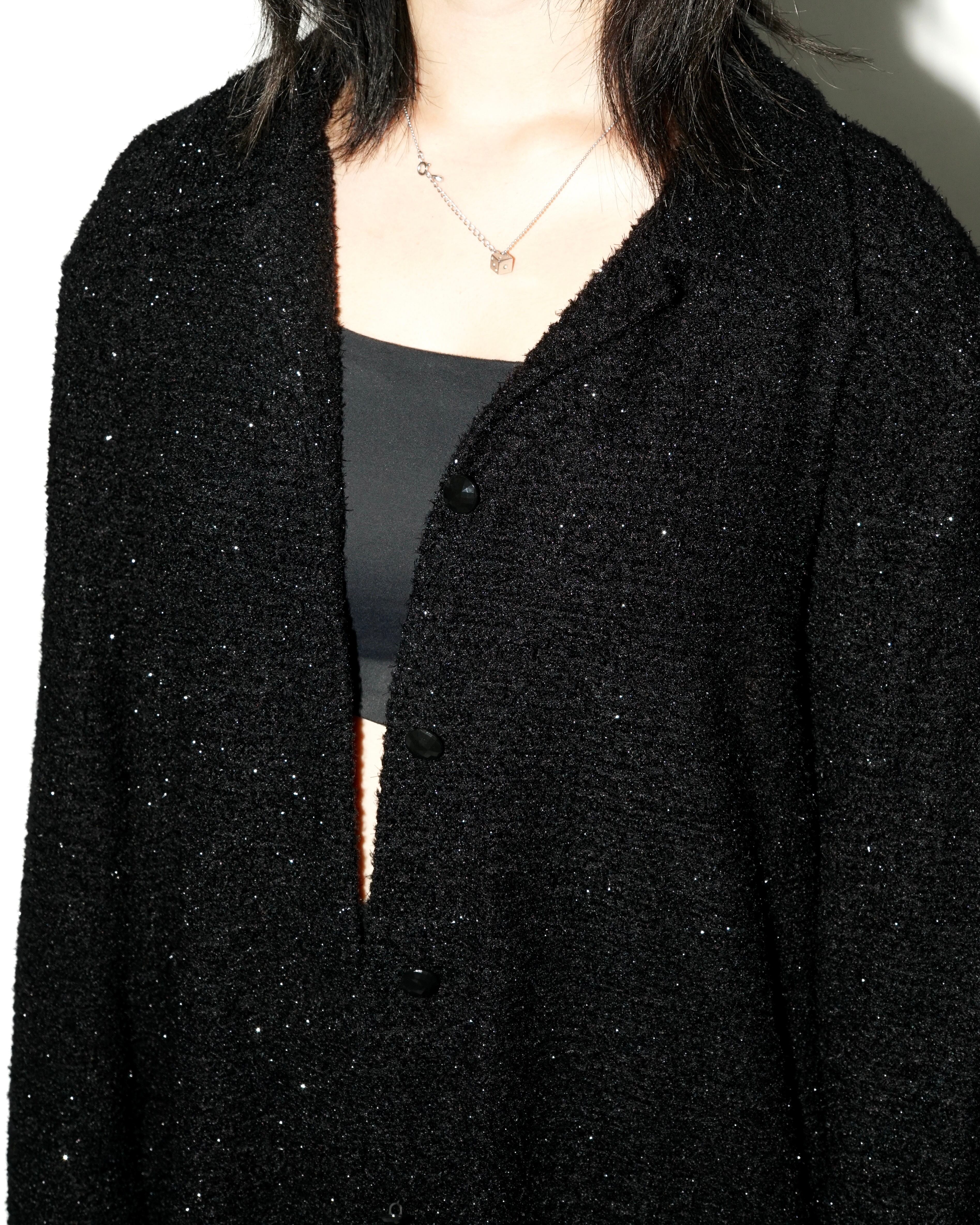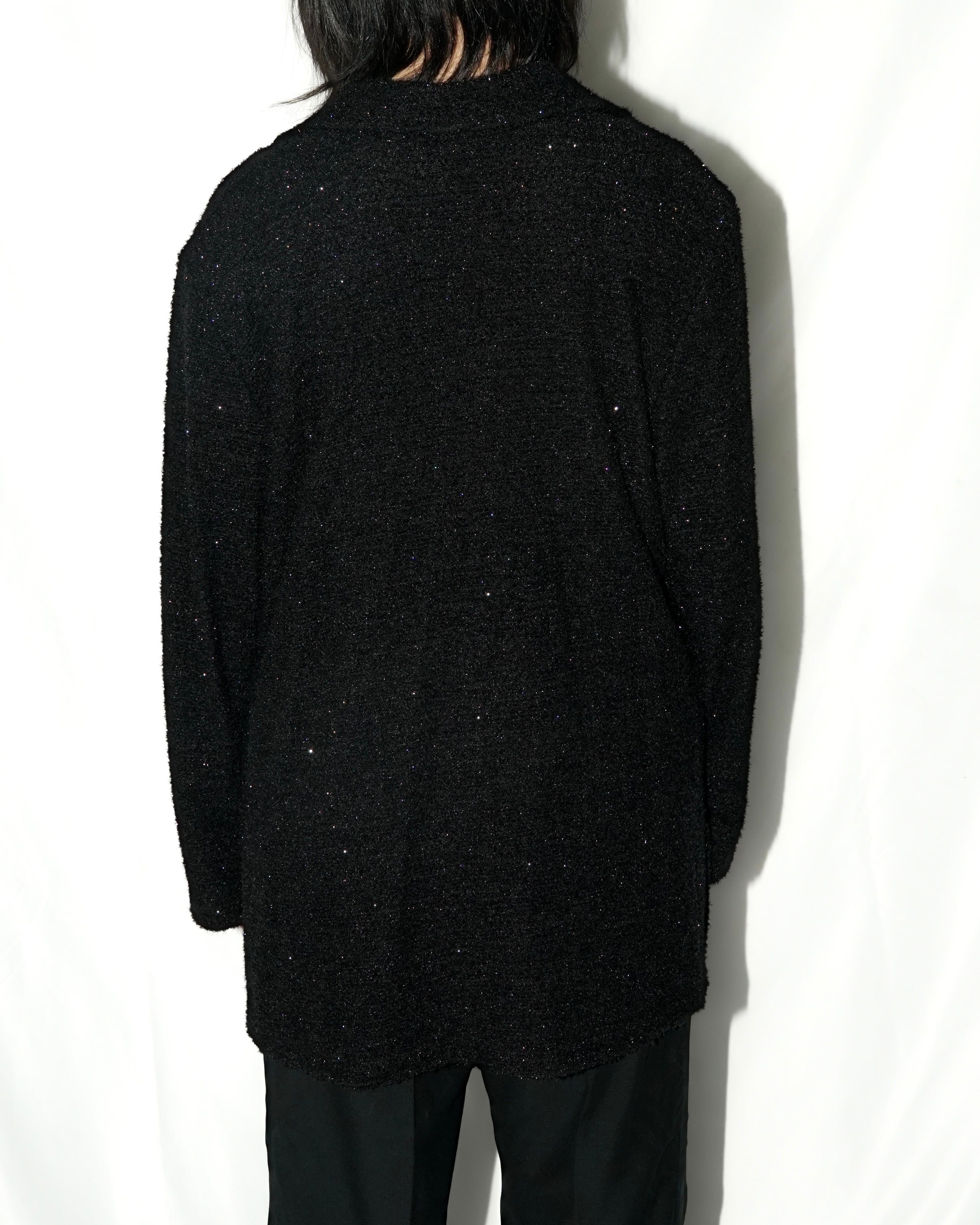 無数のラメ糸が編み込まれた深いブラックが、角度によって星屑のように輝く1枚です。