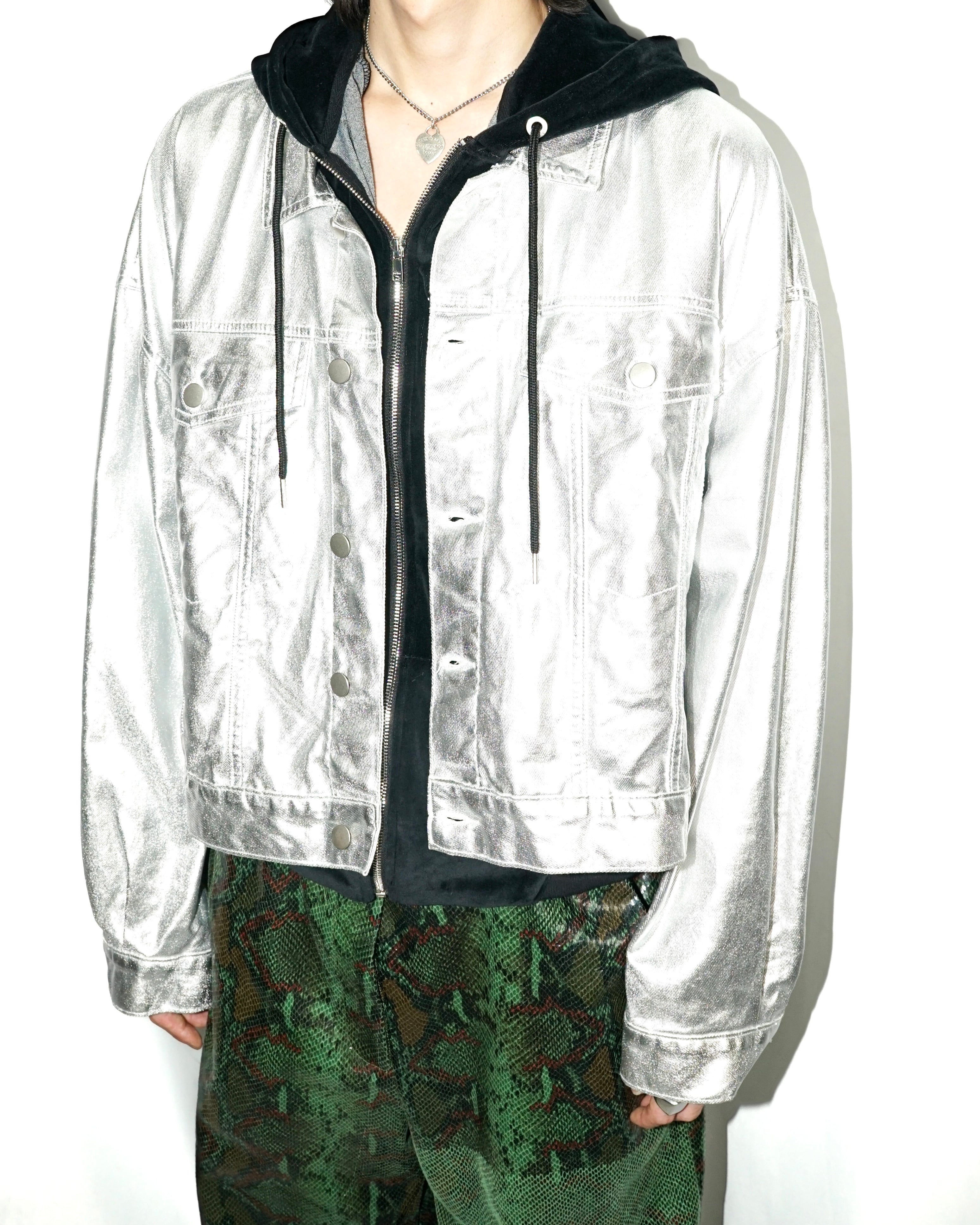 現代的なメタリック質感を持つ、PUコーティングのショートトラッカージャケット。