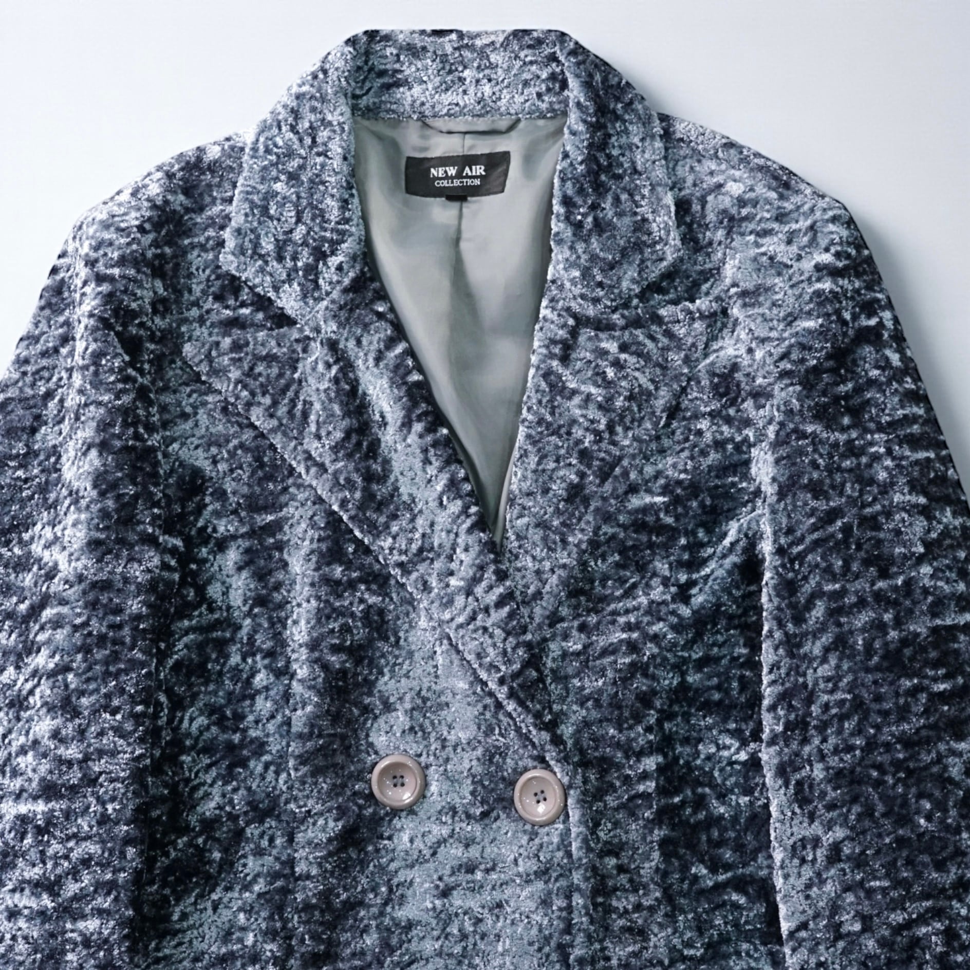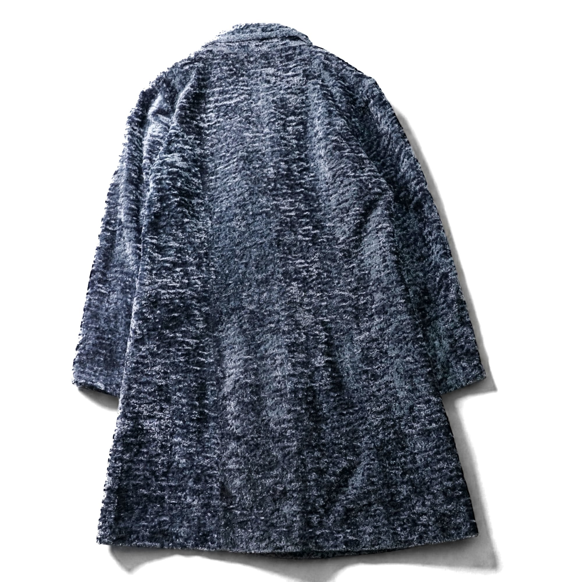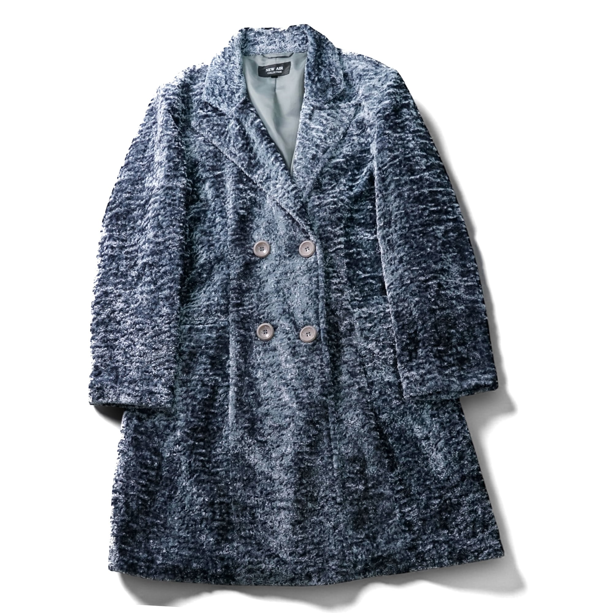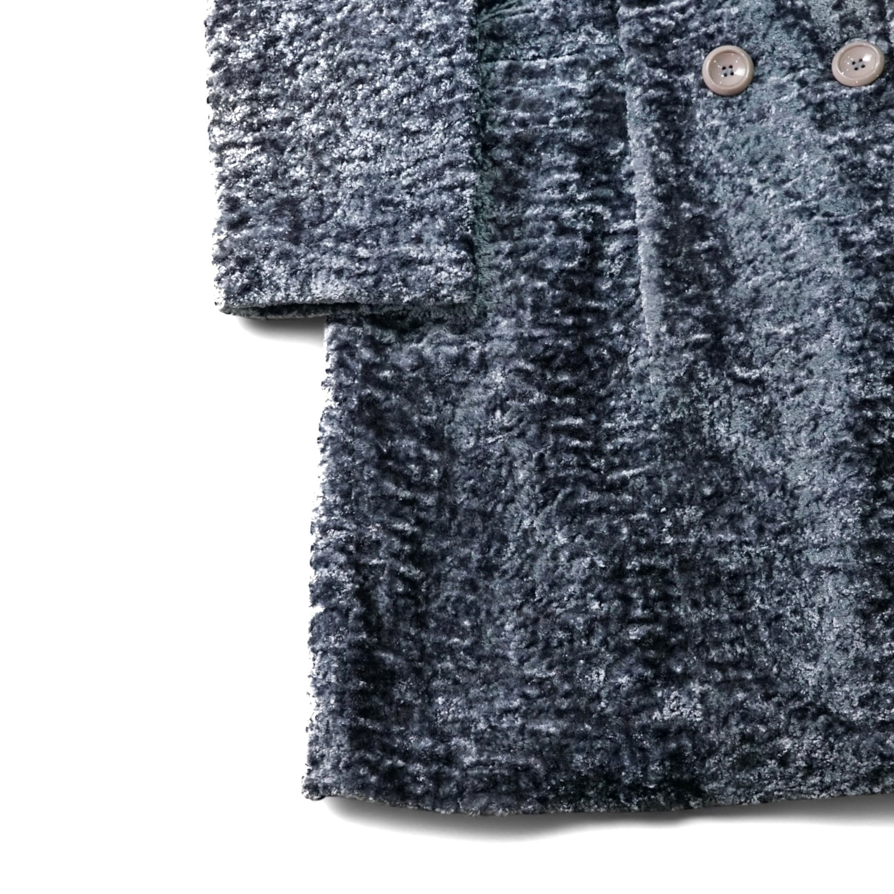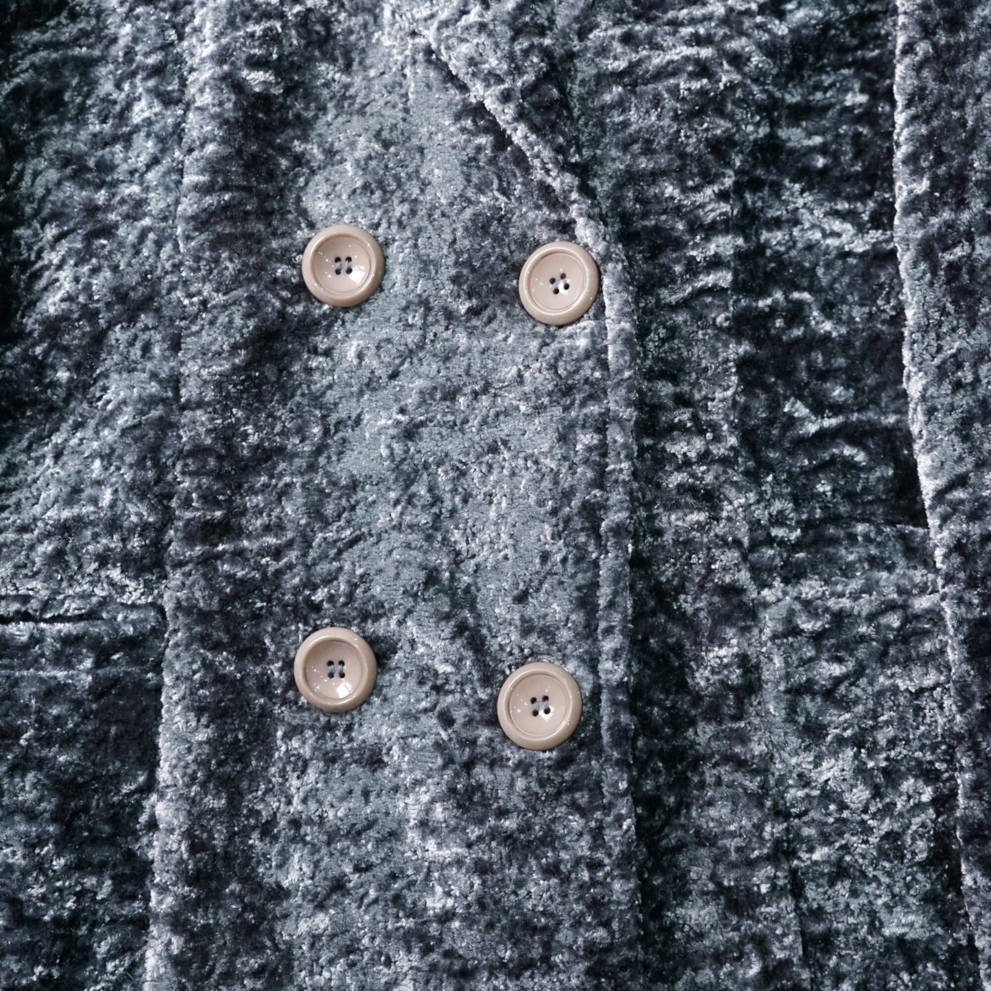 スモーキーなブルーグレーの光沢が美しい、クラッシュベロア仕立てのダブルブレストコート。