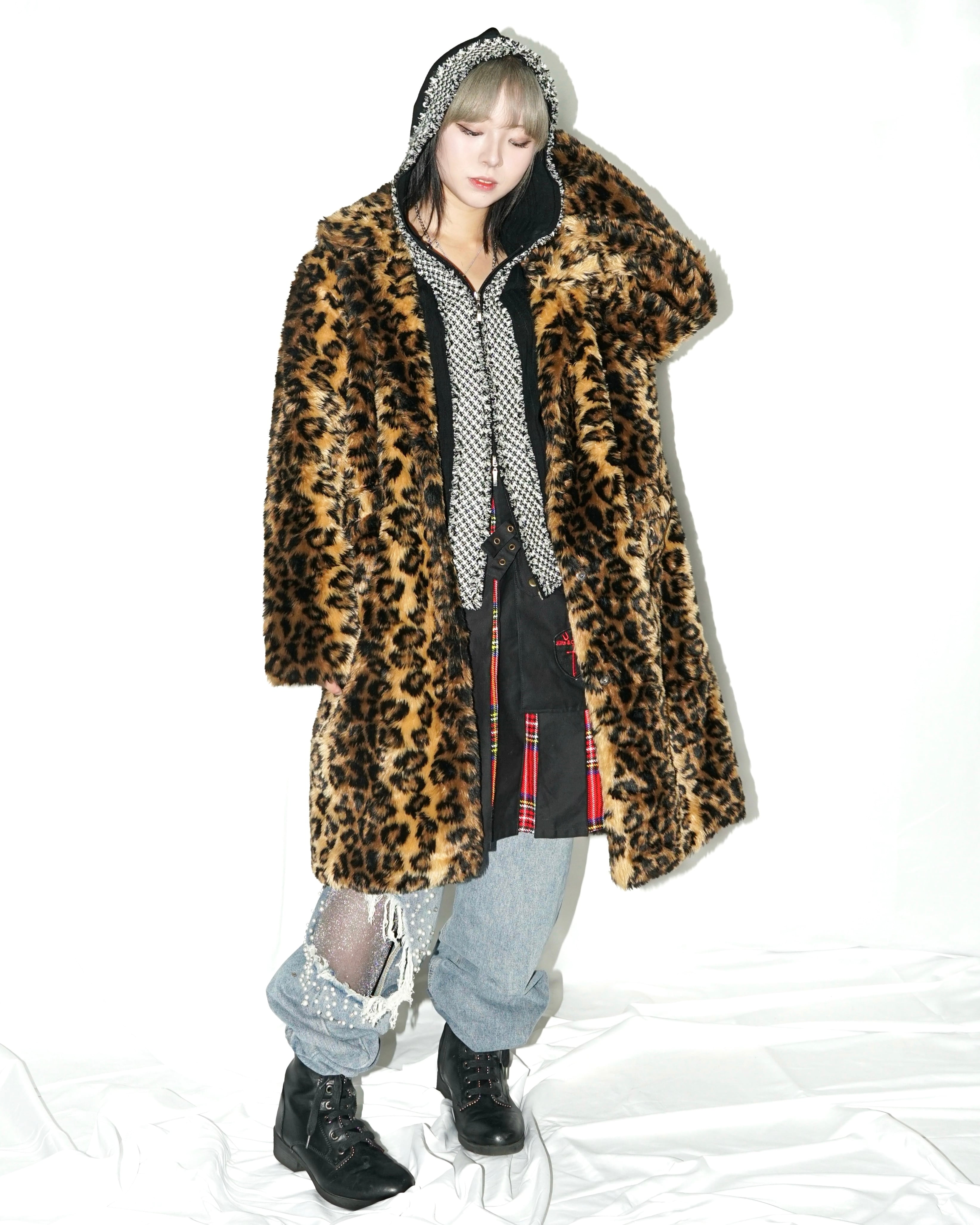 存在感抜群のレオパード柄を贅沢に使用した、ロング丈のフェイクファーコート。