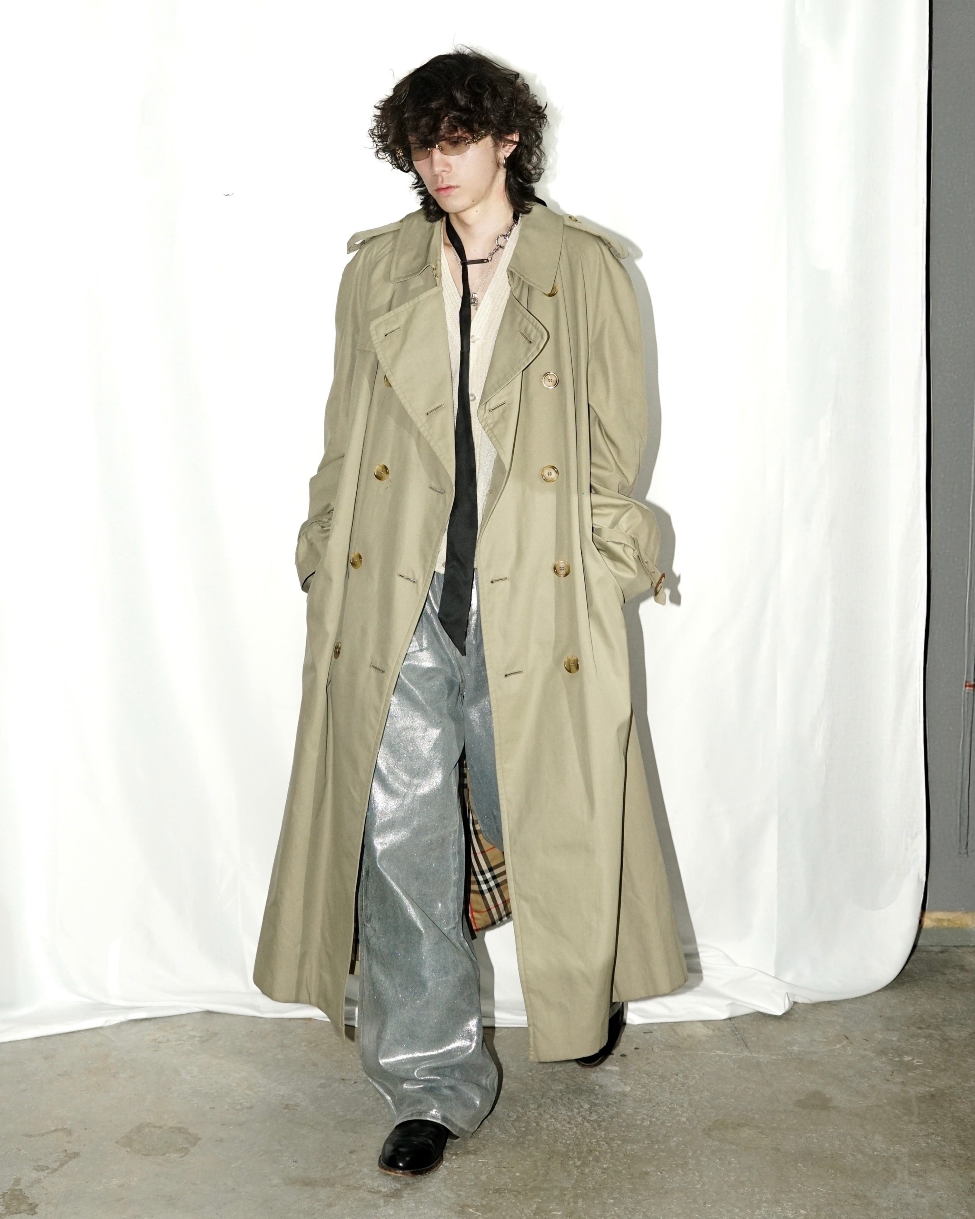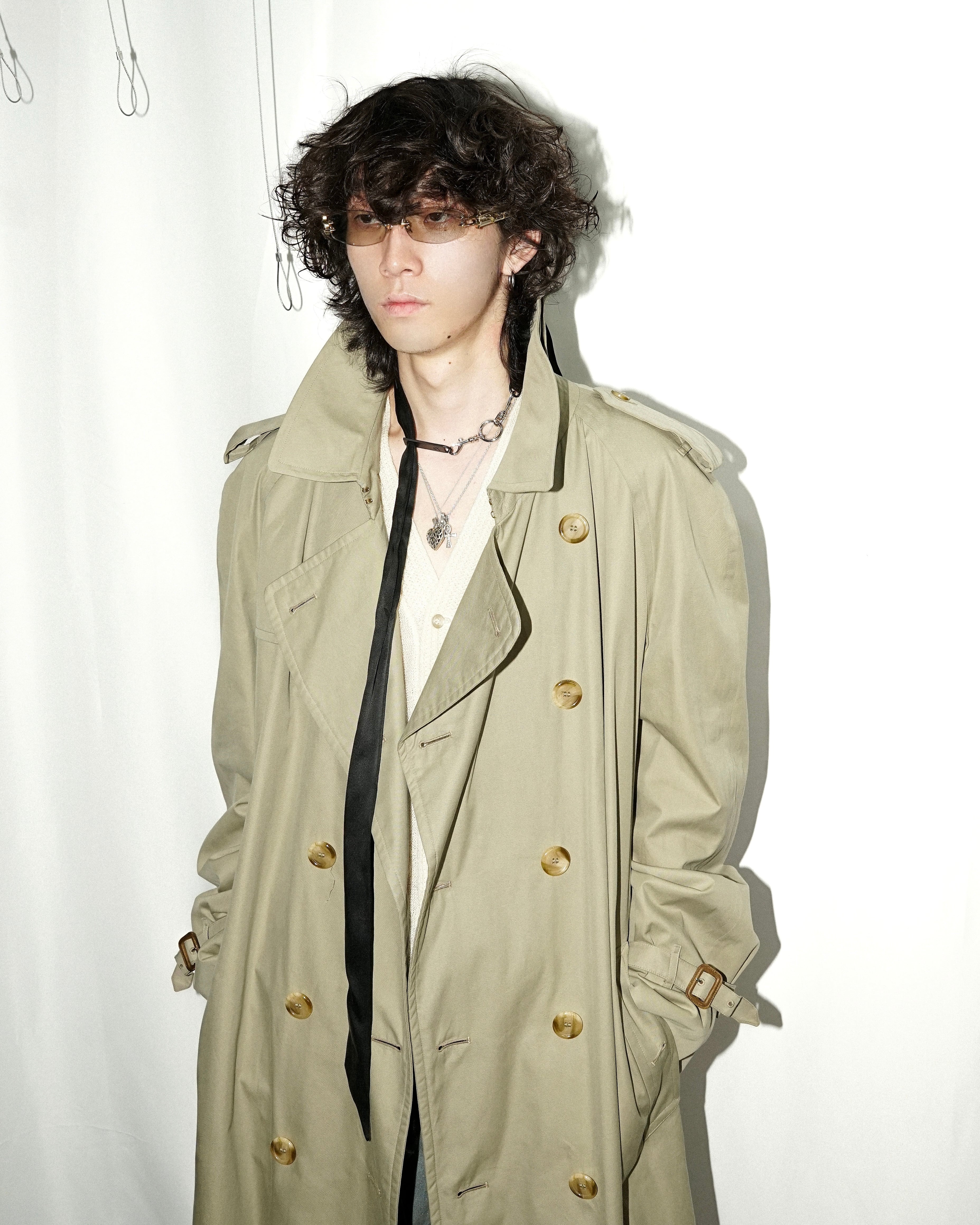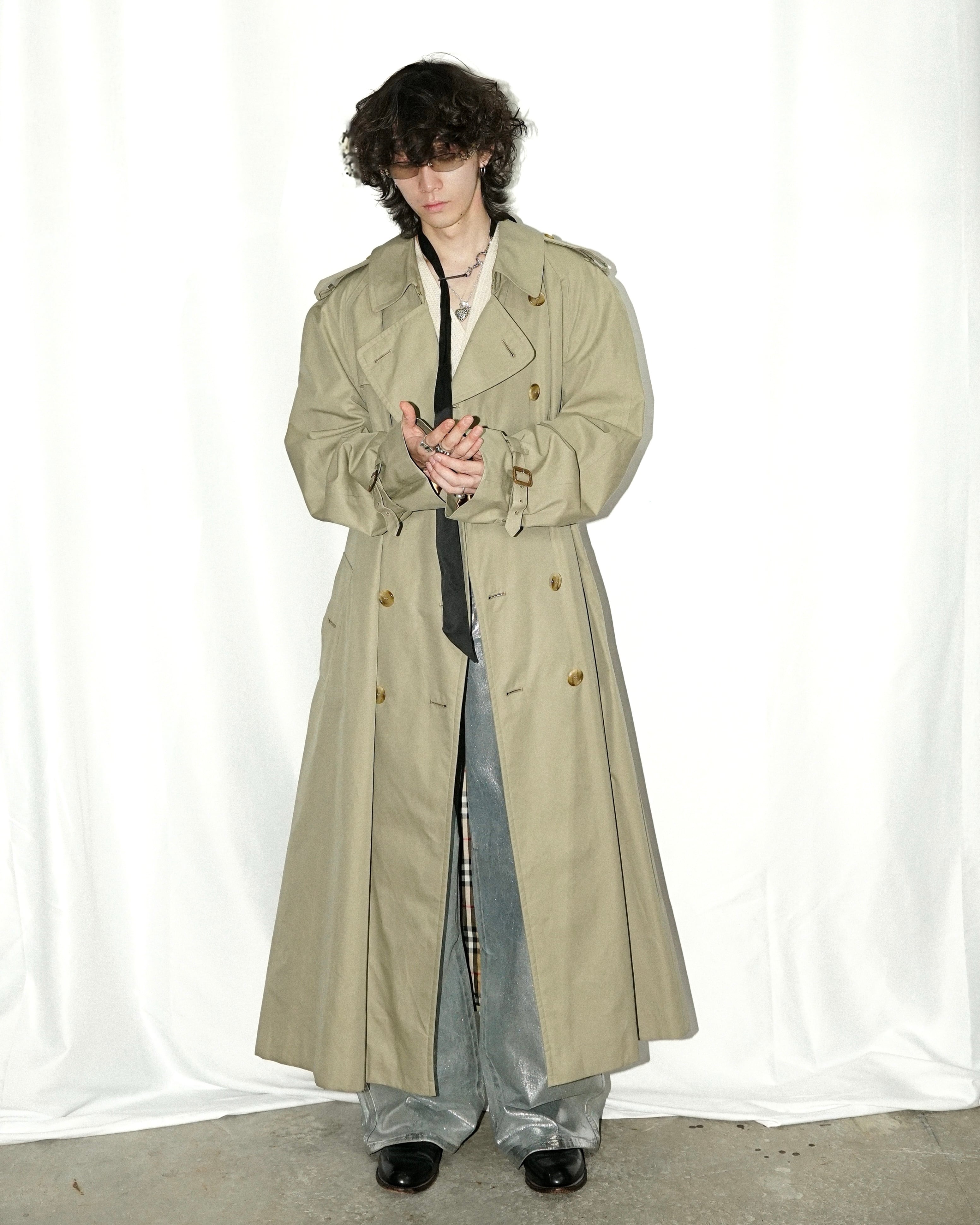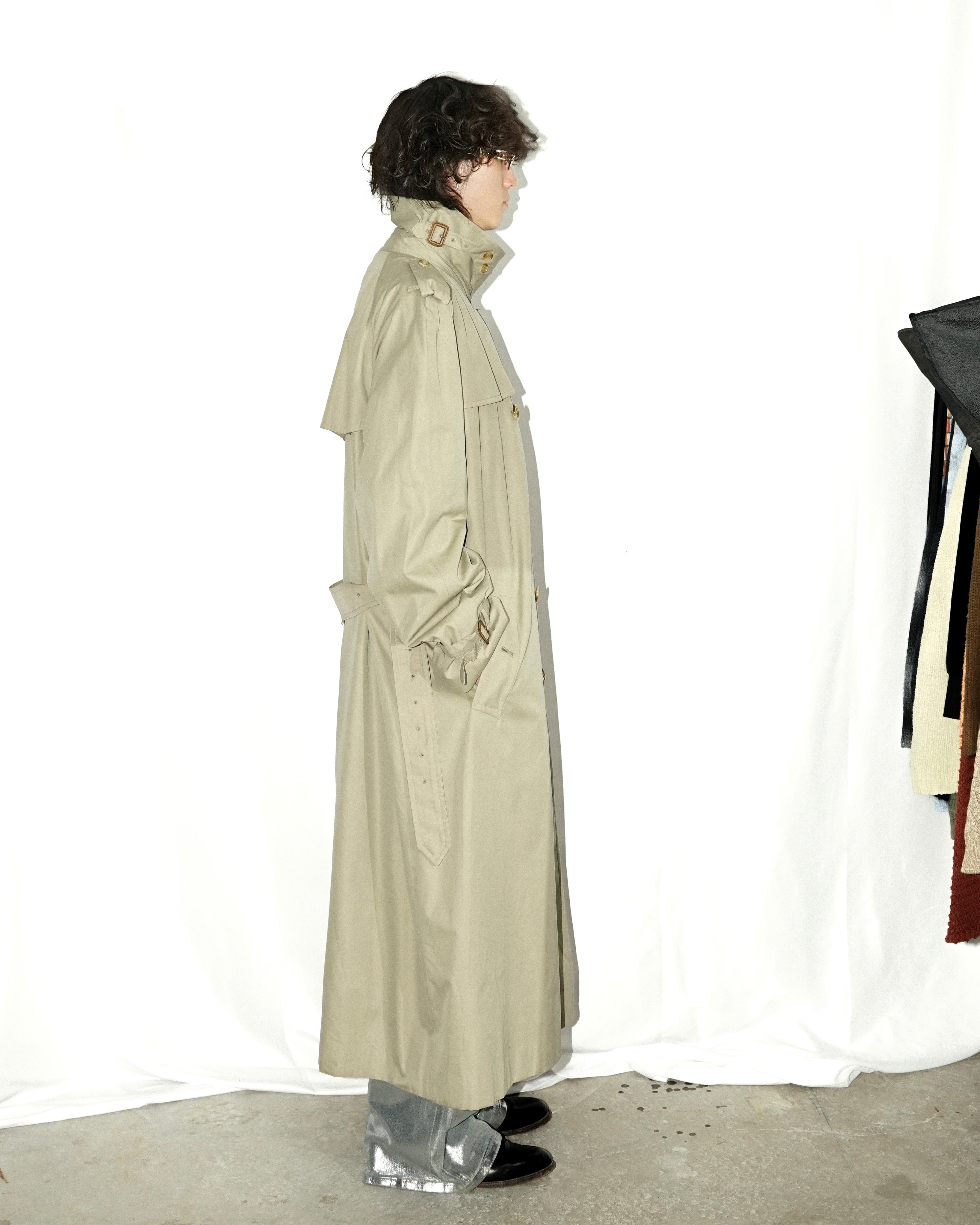 肩章やダブルブレスト仕様など、ミリタリートレンチのディテールはしっかり押さえつつ、コットンギャバジン特有の品のある落ち感が、モードなスタイリングにもよく馴染みます。