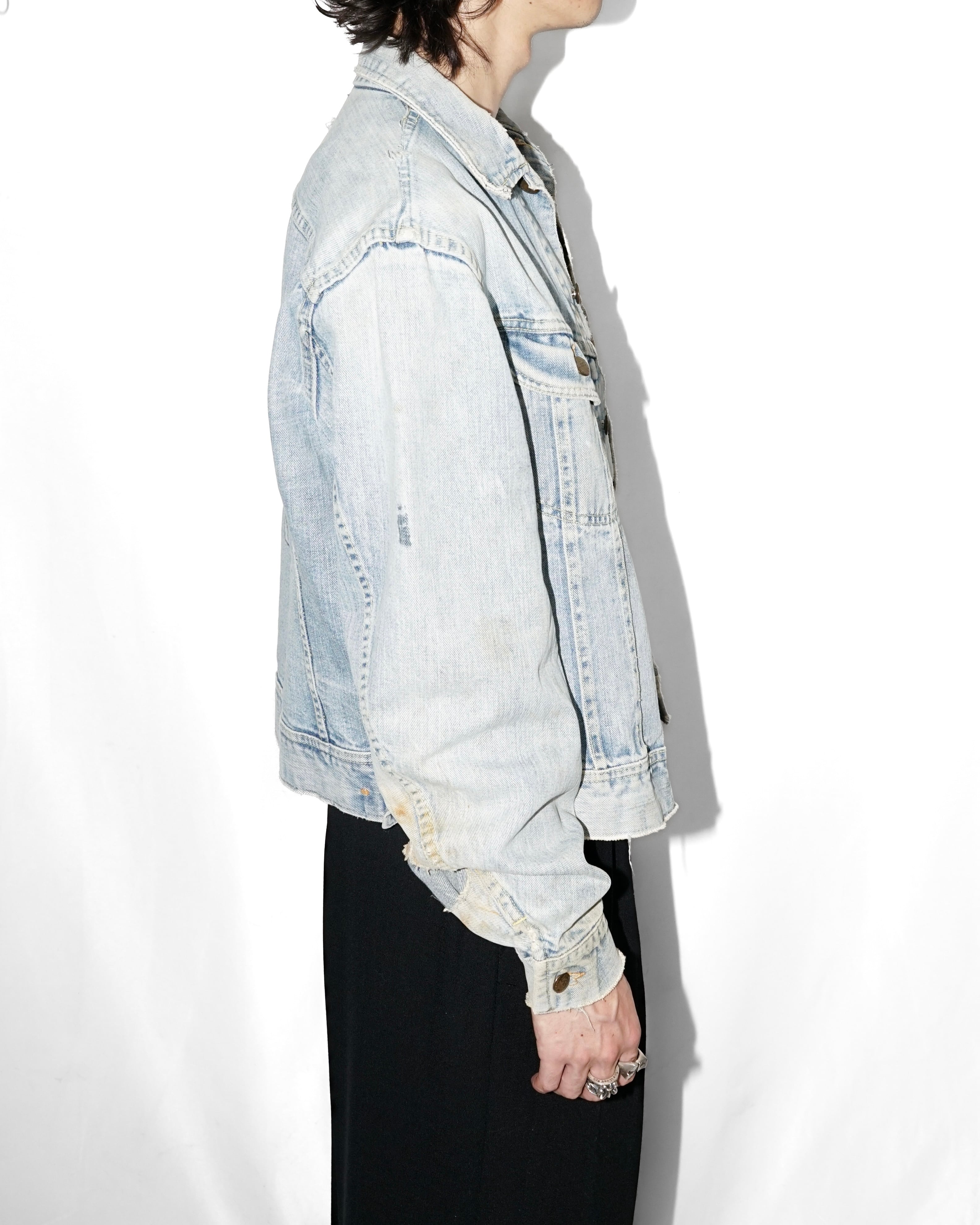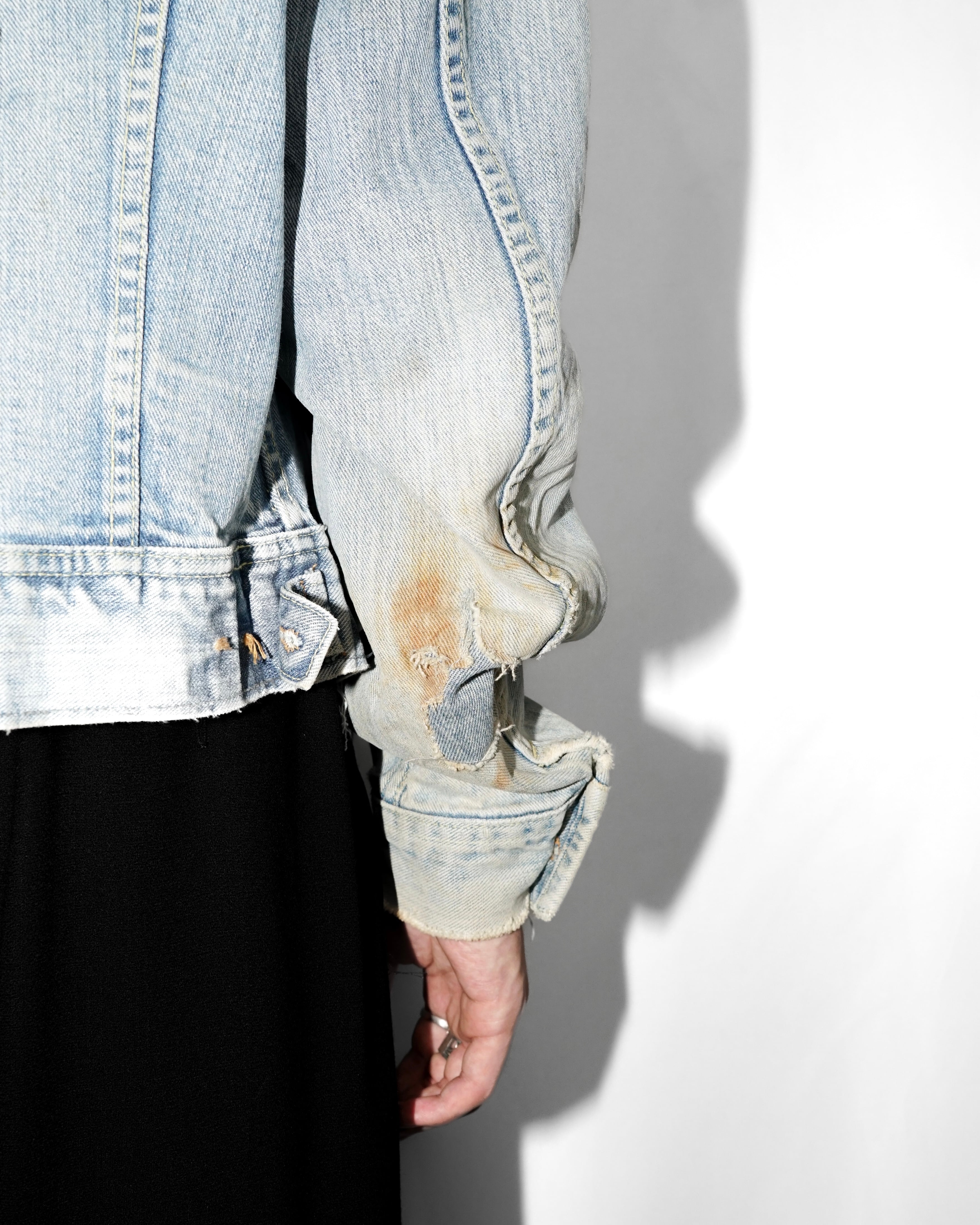 当時特有の 淡いスカイブルーの色落ち、ヒゲ、袖の汚れ・ダメージ が重なり、年代物にしか出せないドライな表情に仕上がっています。