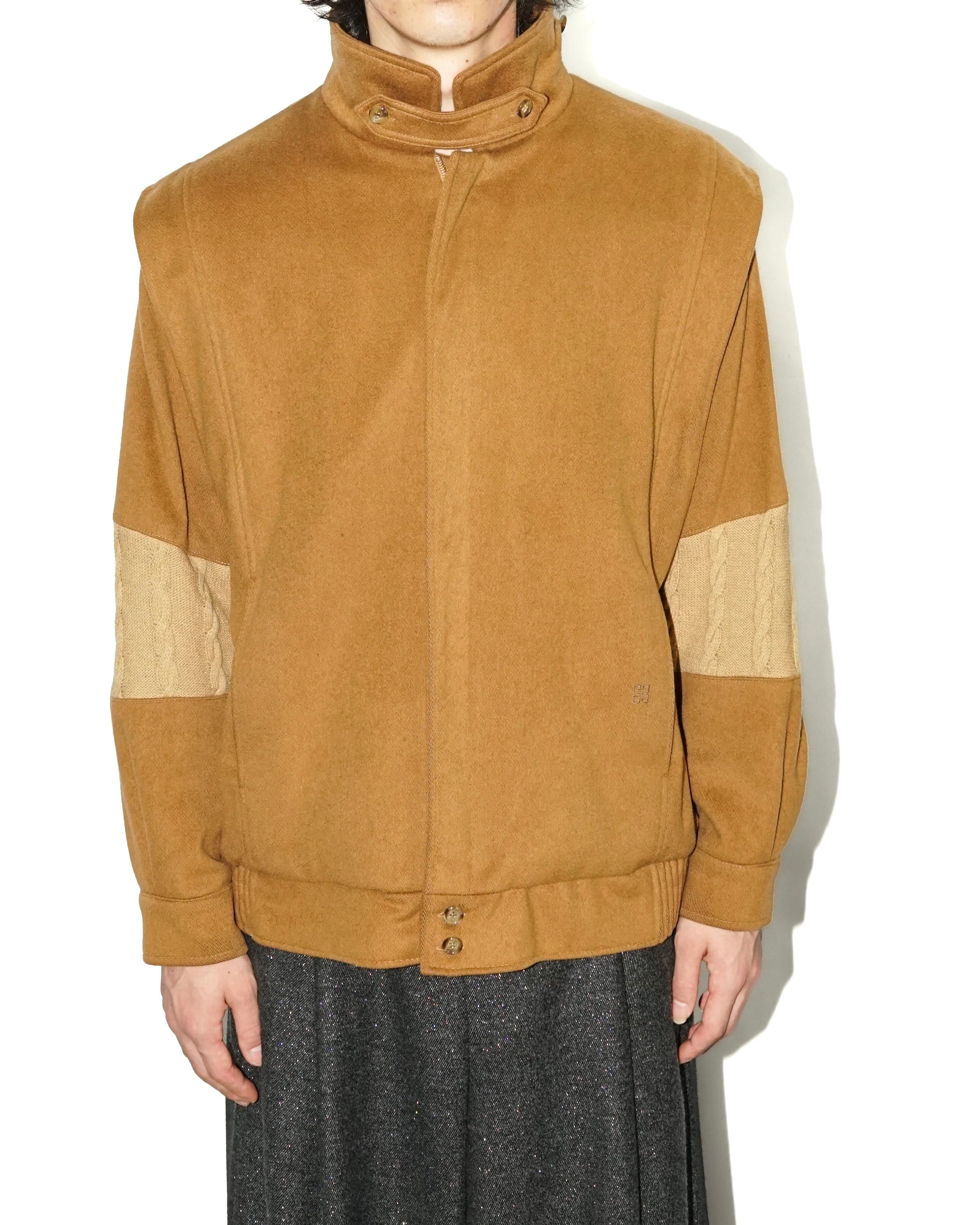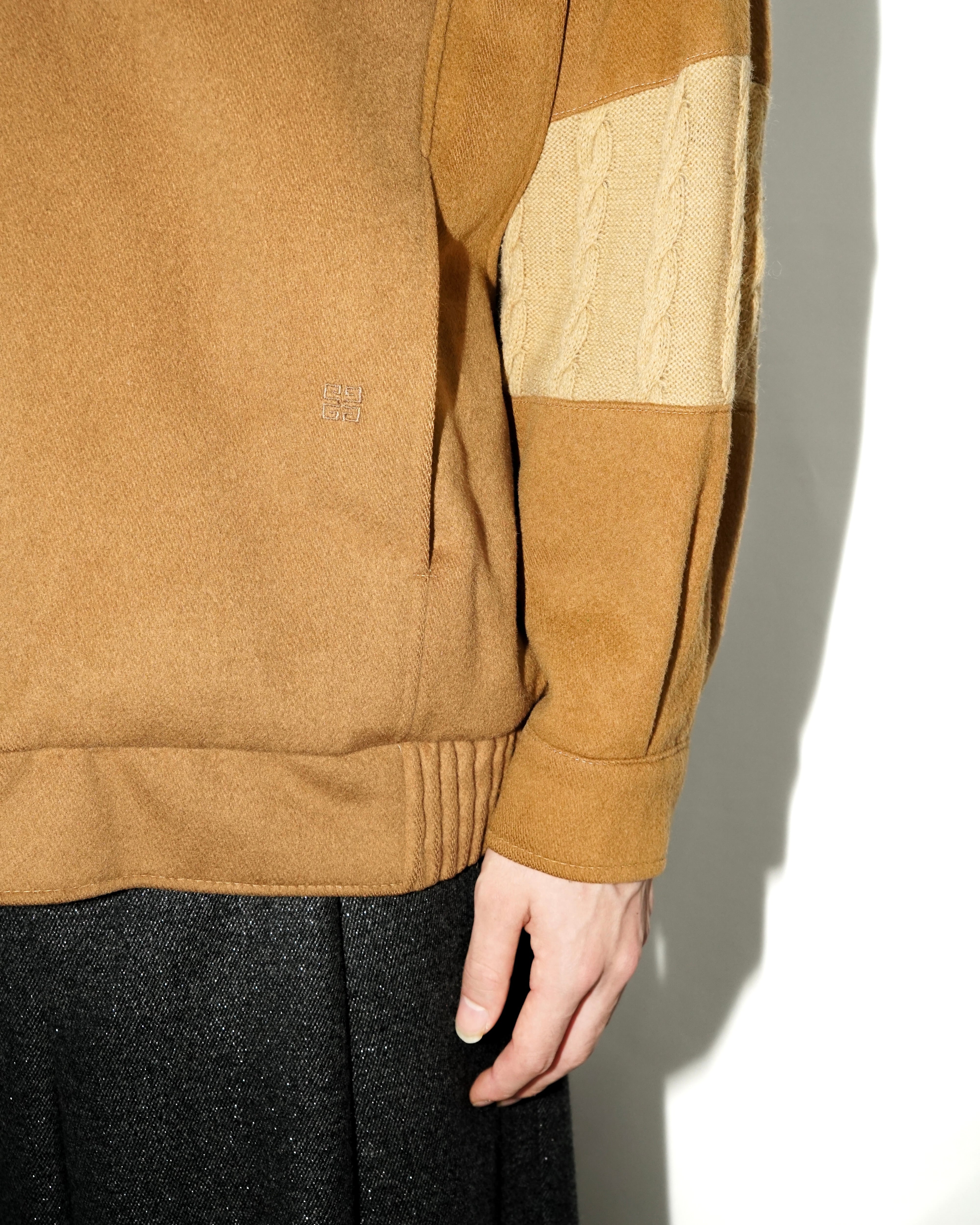 洗練されたミニマルデザインの中に、袖の ケーブルニット切り替え を組み合わせた唯一無二のアプローチが光る一着です。