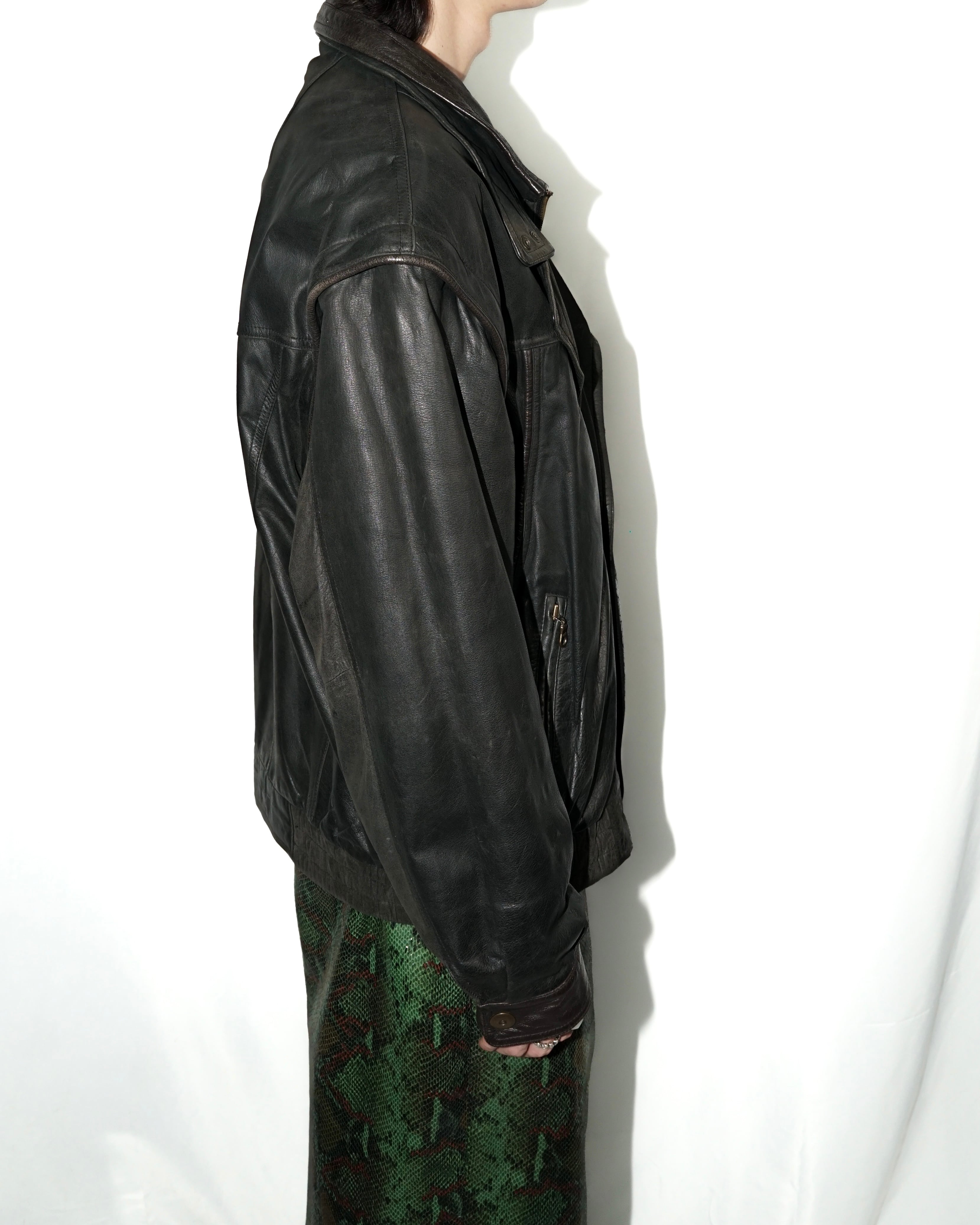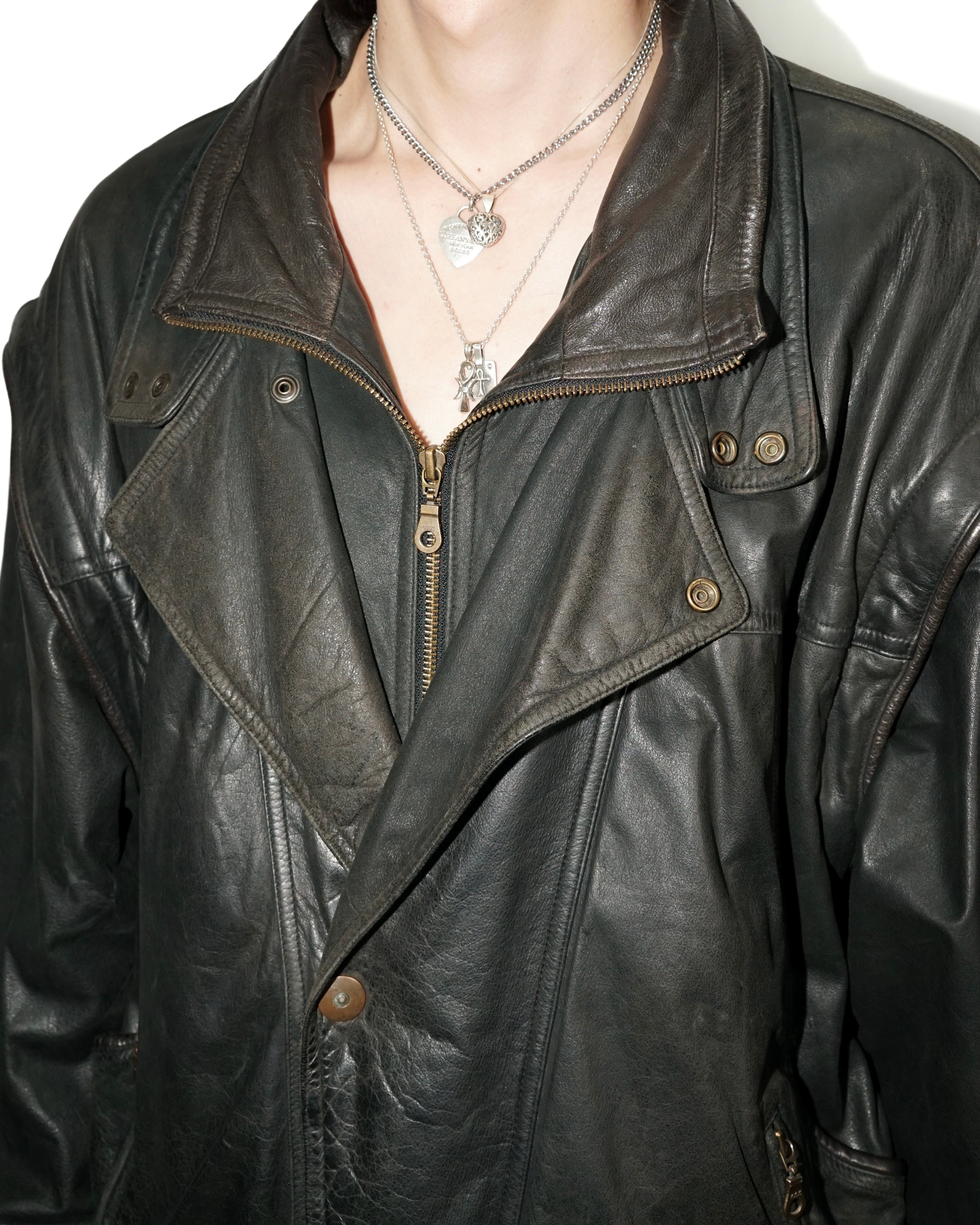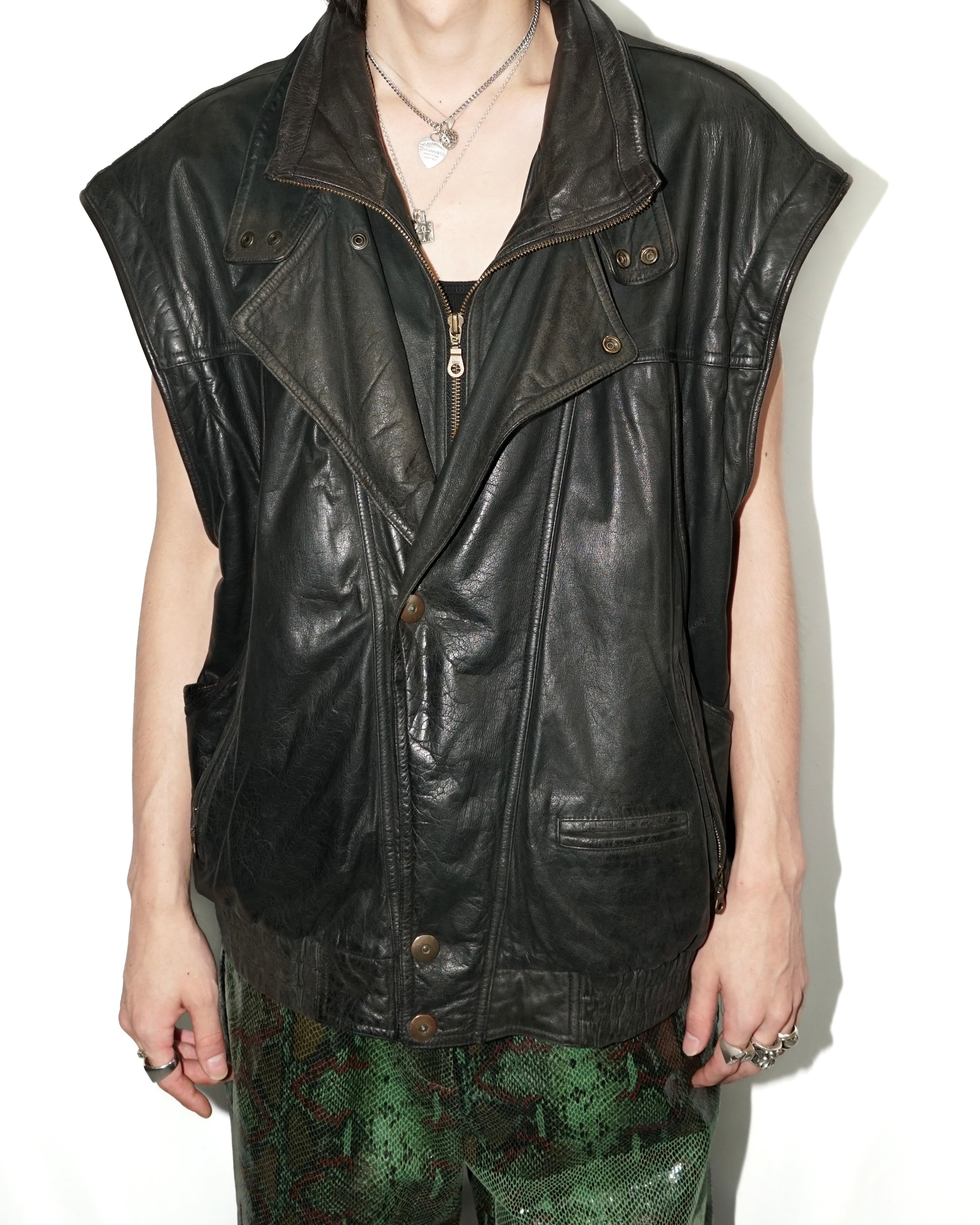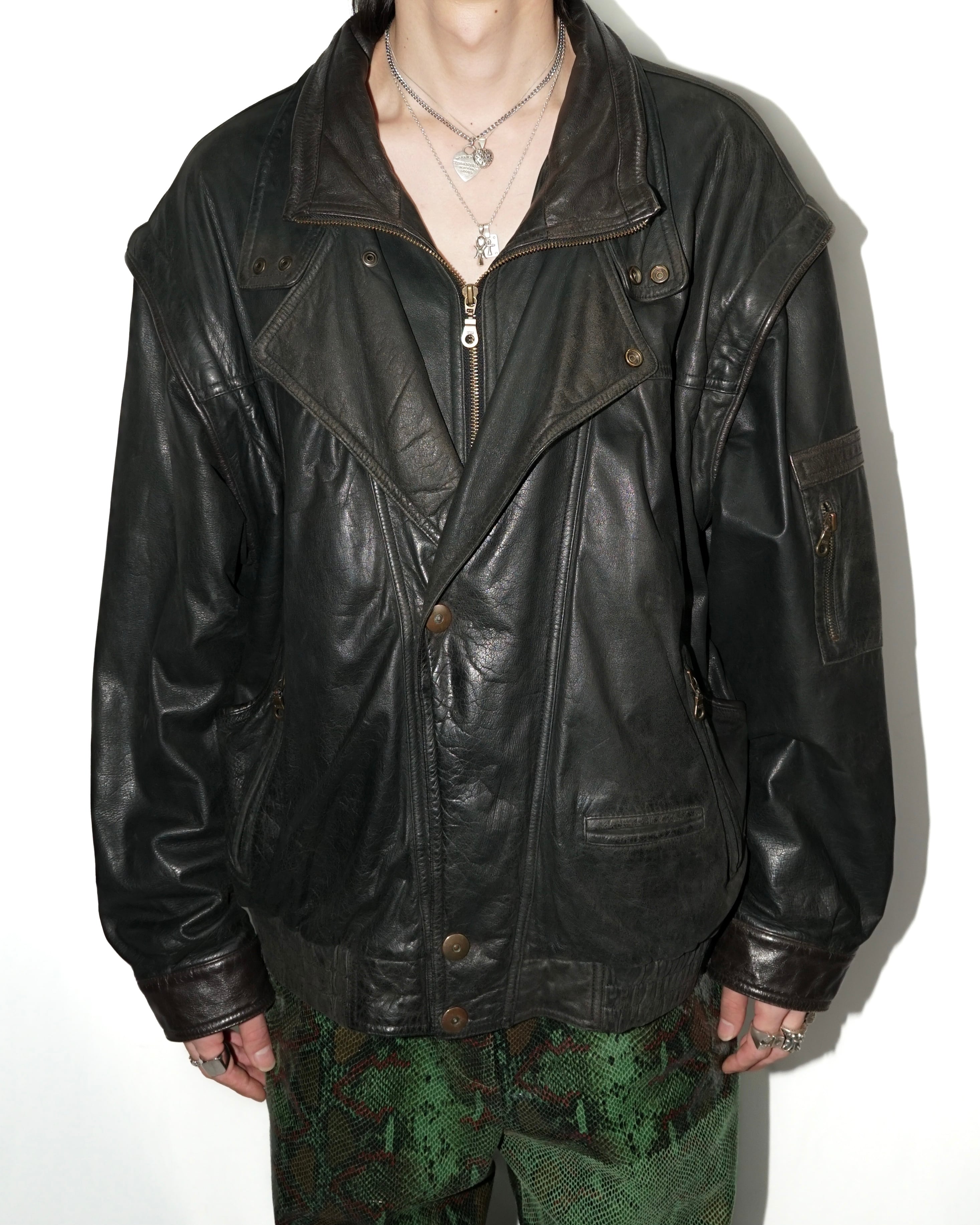 Vintage removable sleeve layered gimmick design loose short leather jacket "BLACK"