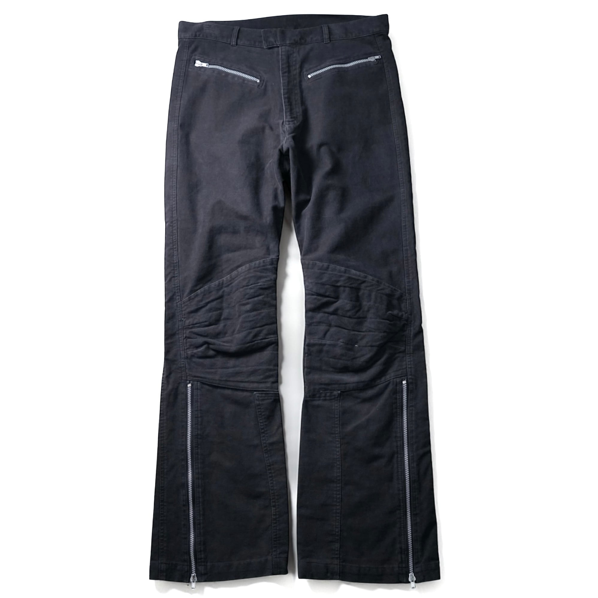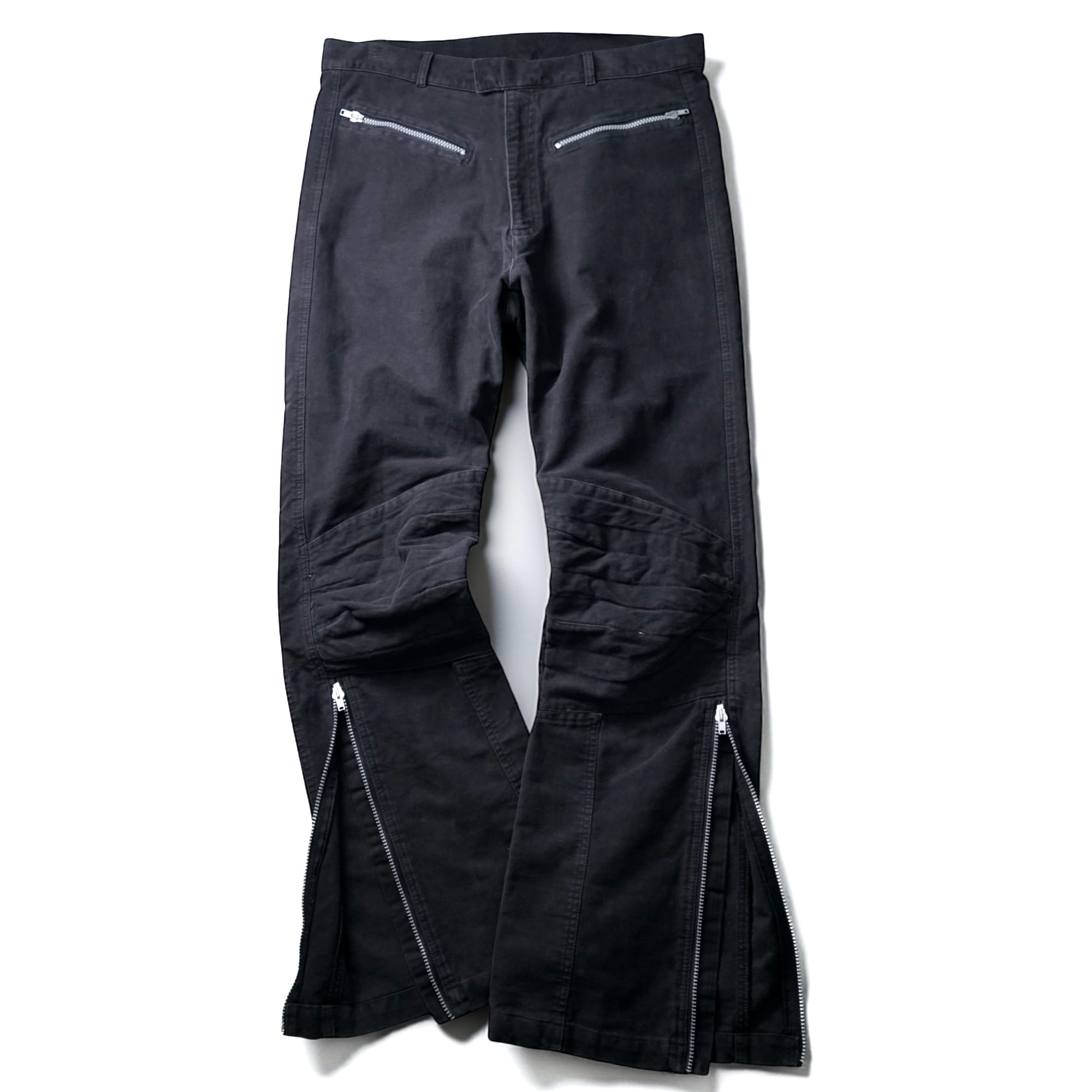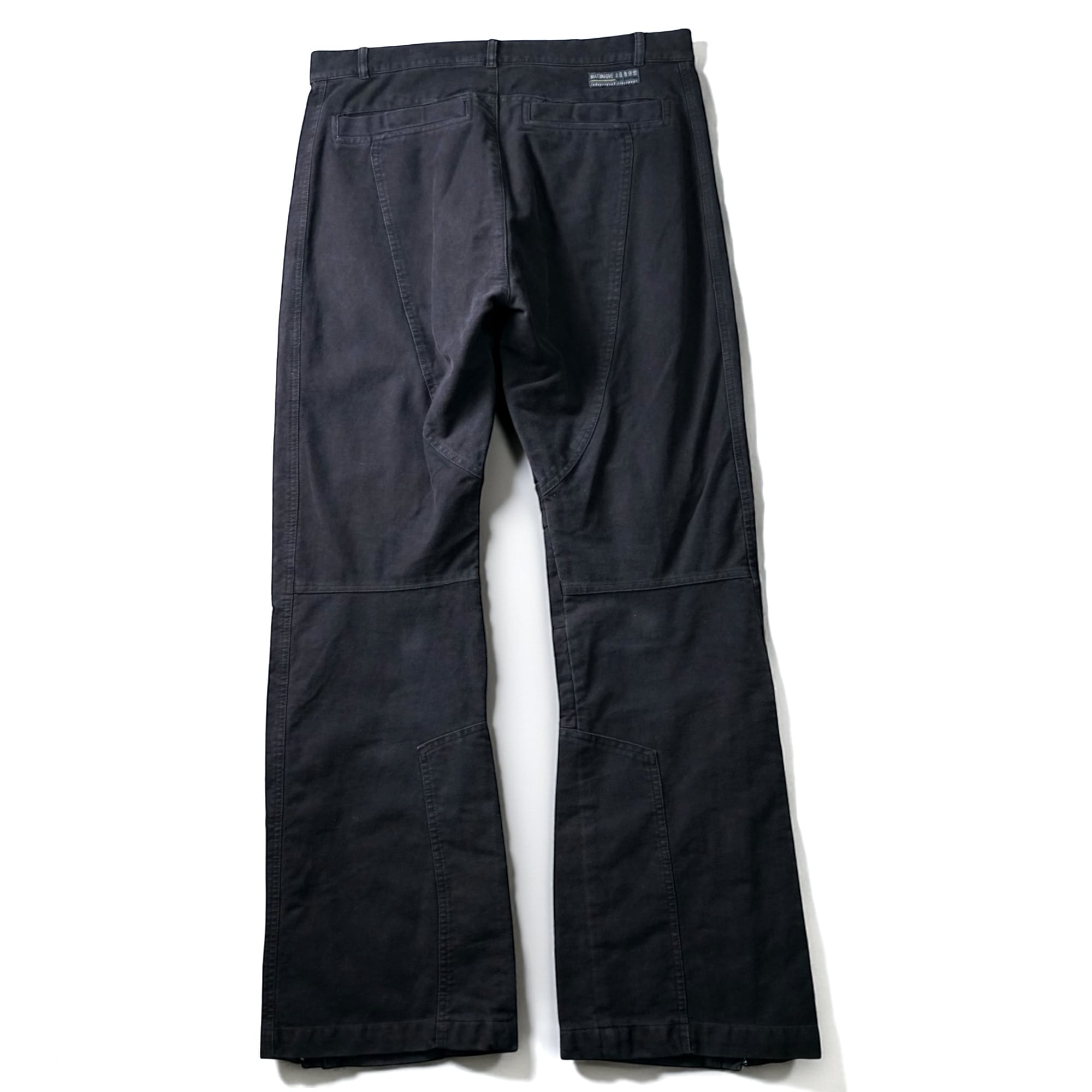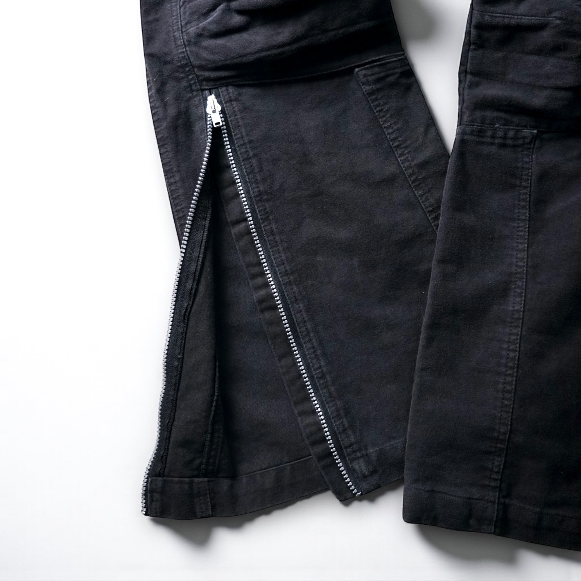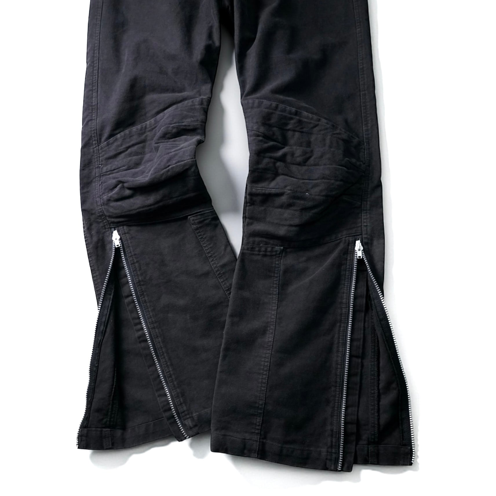 立体裁断の膝パネル、ハードなメタルジップ、可変式のフレアシルエットなど、"Rick Owens のバイカーパンツ、Dior Homme 04–07 の立体構築、Balenciaga biker のハードエッジな切り替え、Helmut Lang denim/tech のテックワーク" を想起させるディテールワークが随所に光ります。