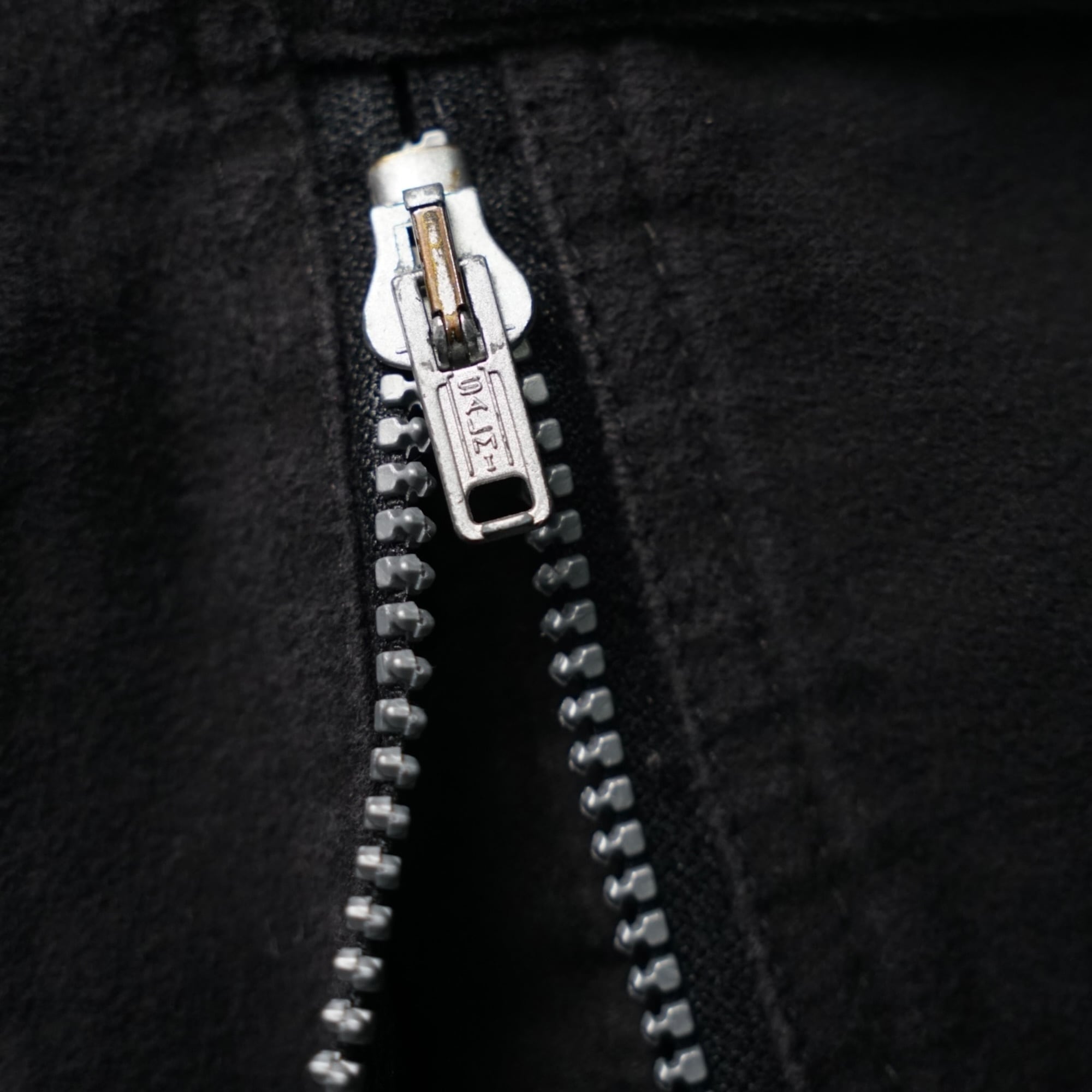 フロントのオフセットジップポケットは、無骨さとモードさを併せ持つアクセント。