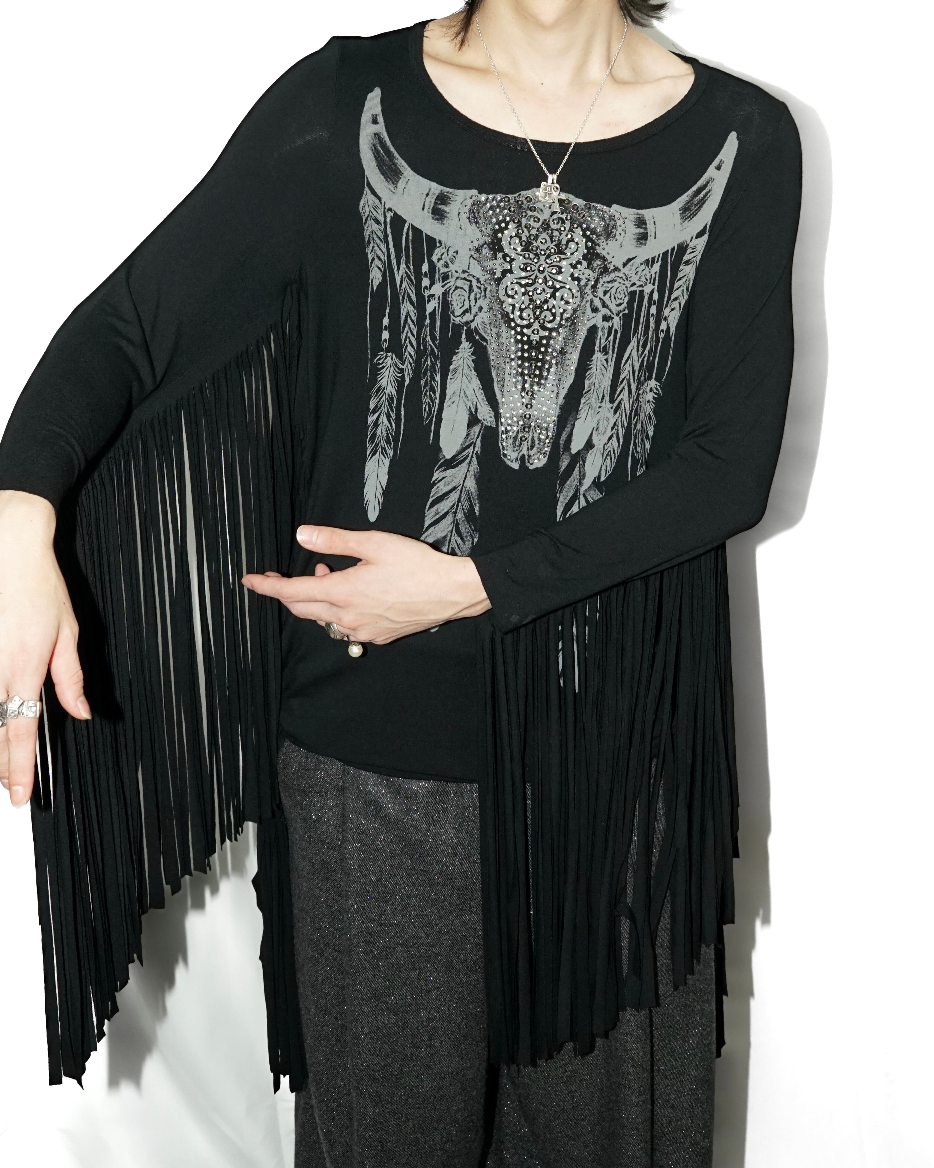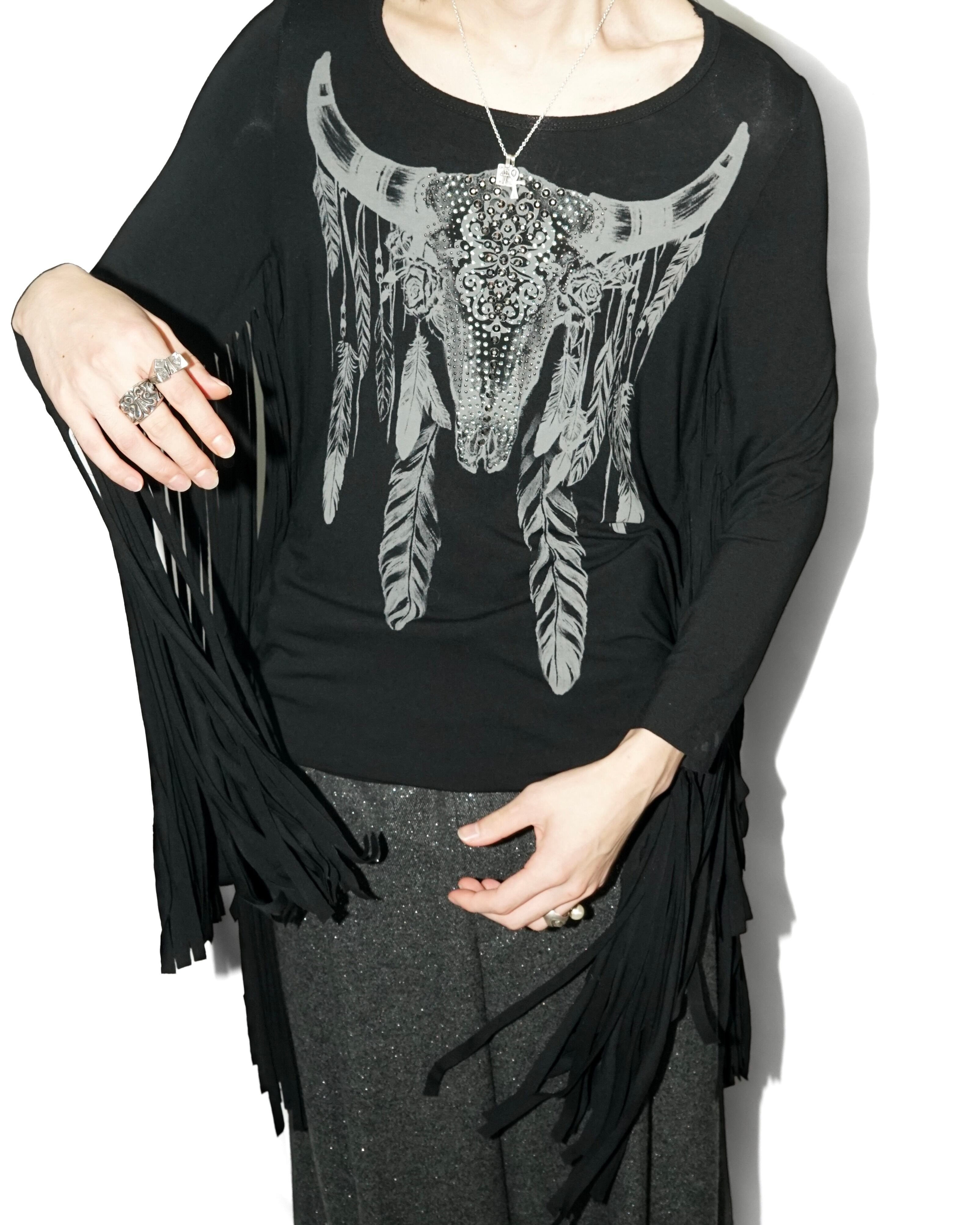 フリンジを大胆に配したスリーブデザインとフロント&バックに施されたバッファロースカルのプリントが目を惹く、フリンジカットソー。