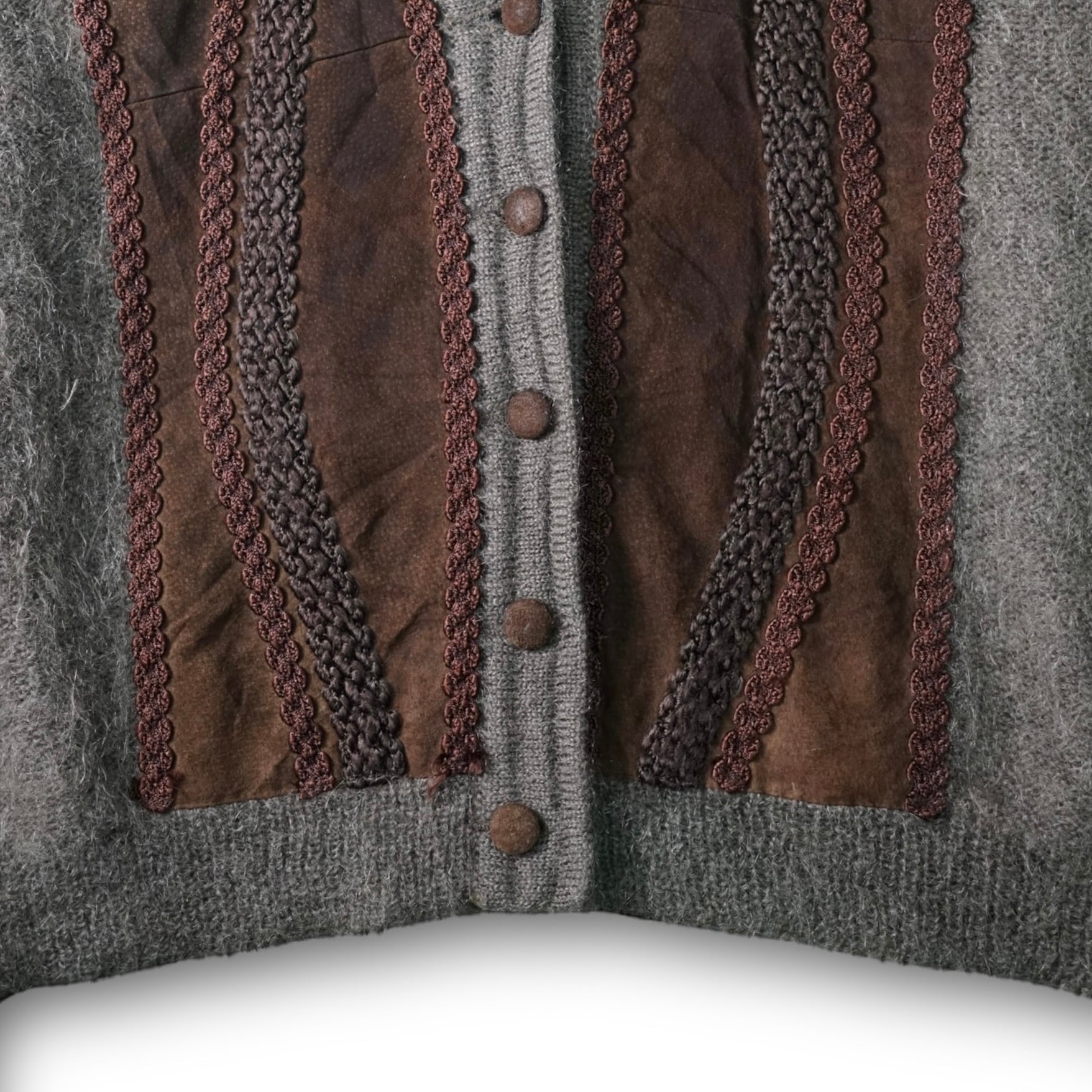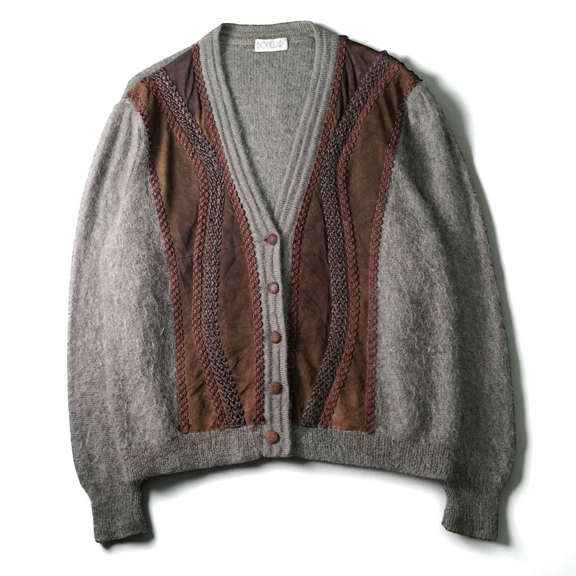ユーロヴィンテージらしいクラフト感と素材使いが際立つ、切り替えレザーデザインのシャギーモヘアカーディガン。