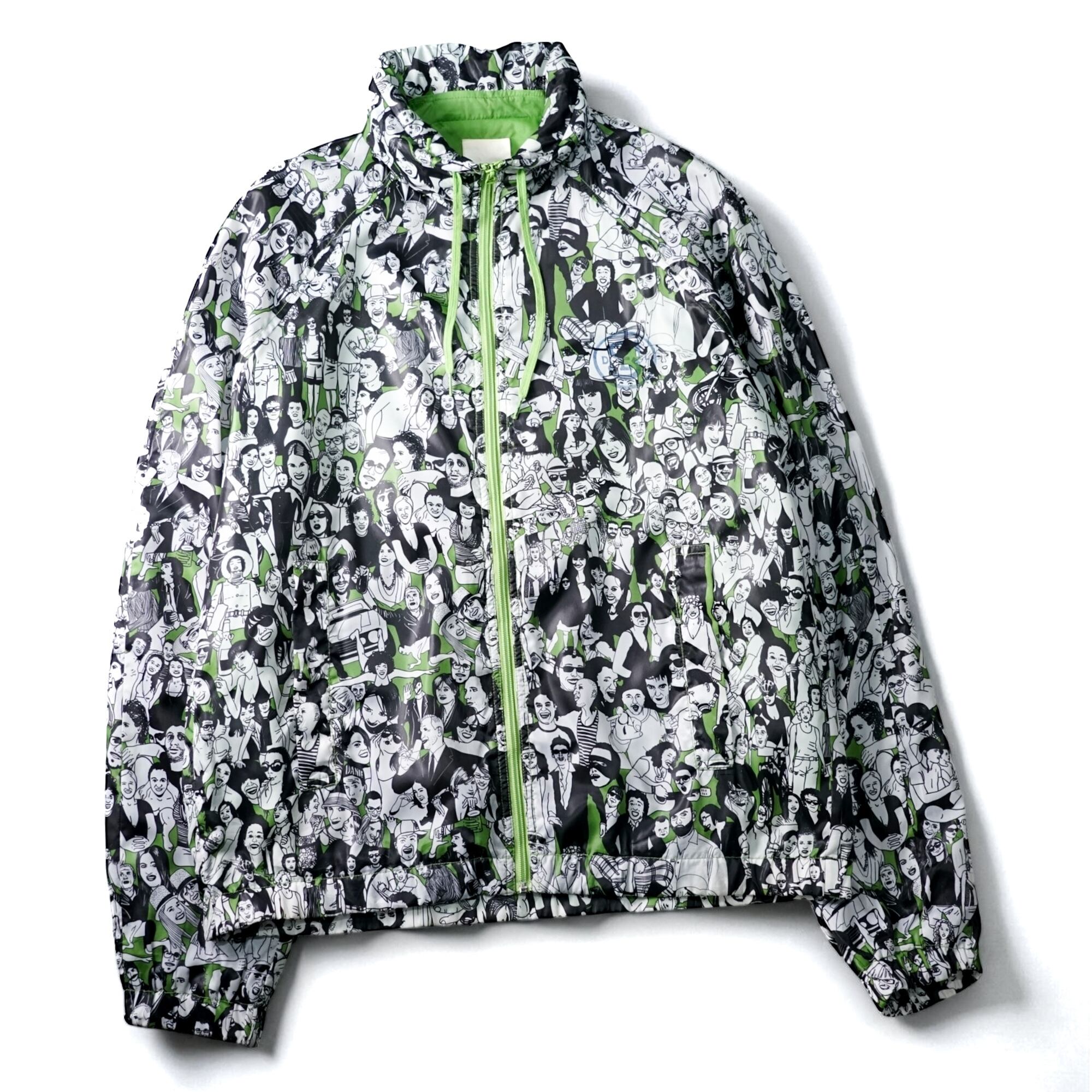 90〜00年代らしいエネルギッシュな空気をまとった、人物イラストを全面に散りばめた総柄ナイロンジップジャケット。