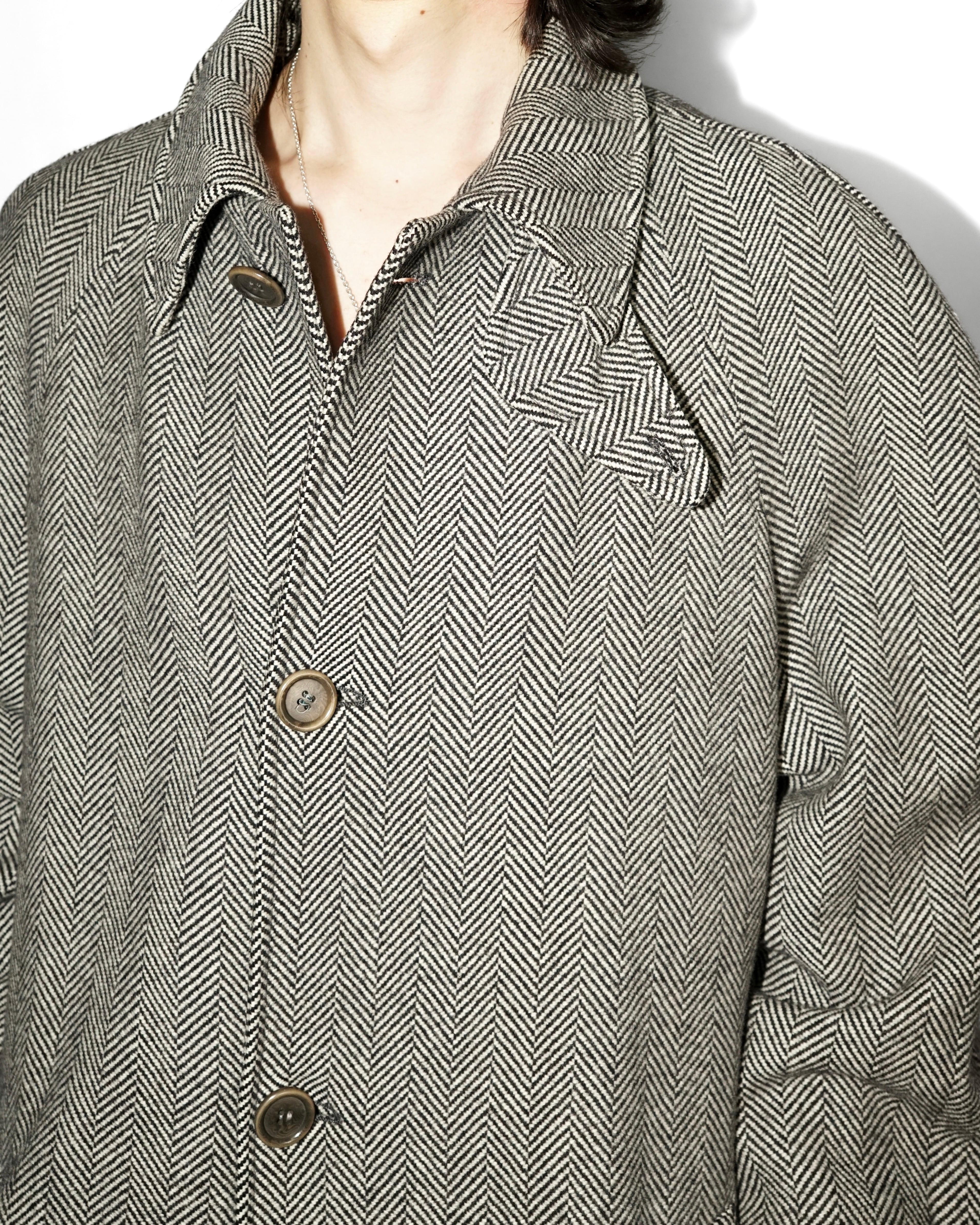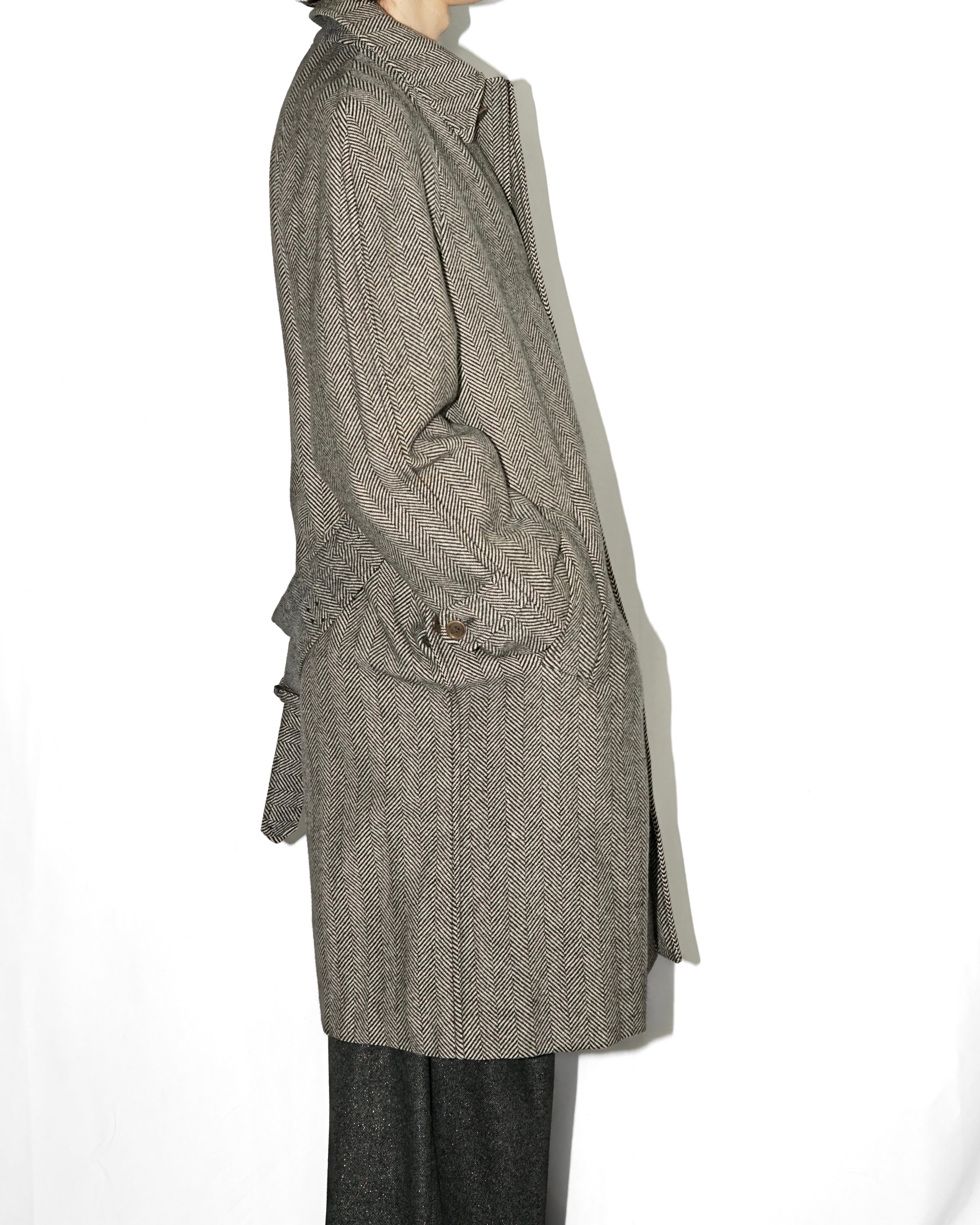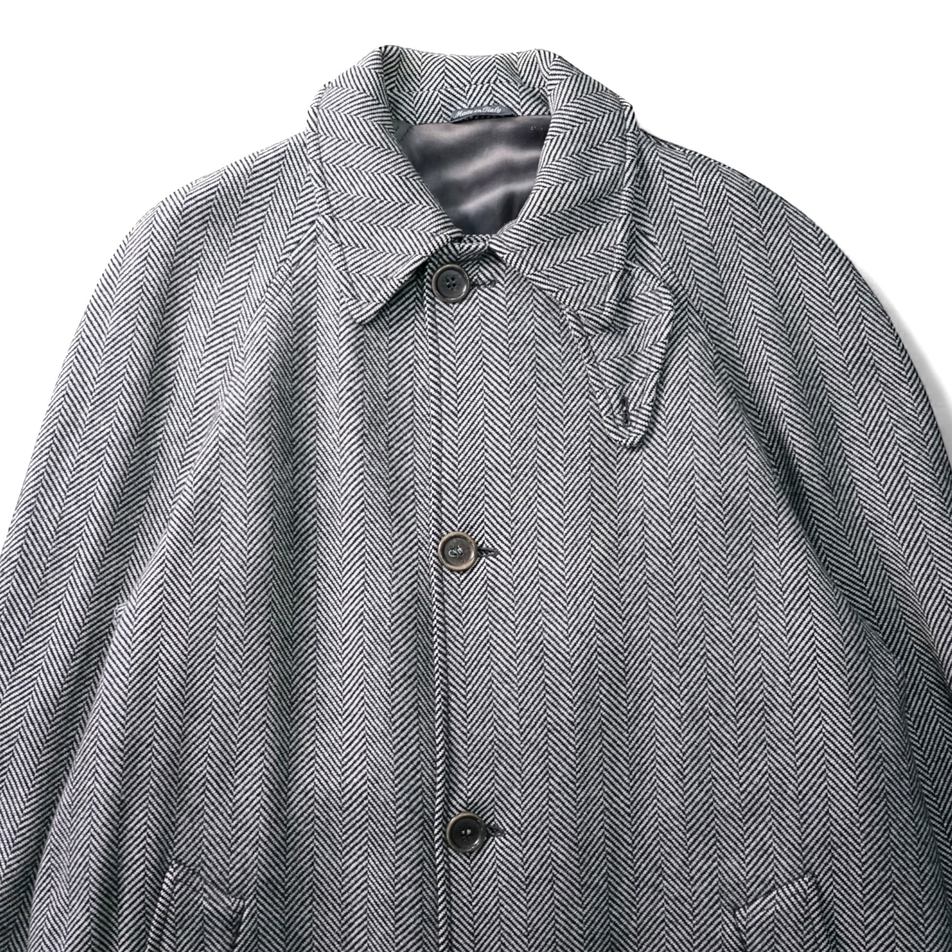 生地は ウール70% × カシミヤ30% の上質な混紡で、カシミヤ特有のしなやかな落ち感と柔らかな光沢が特徴のヘリンボーン織り。
