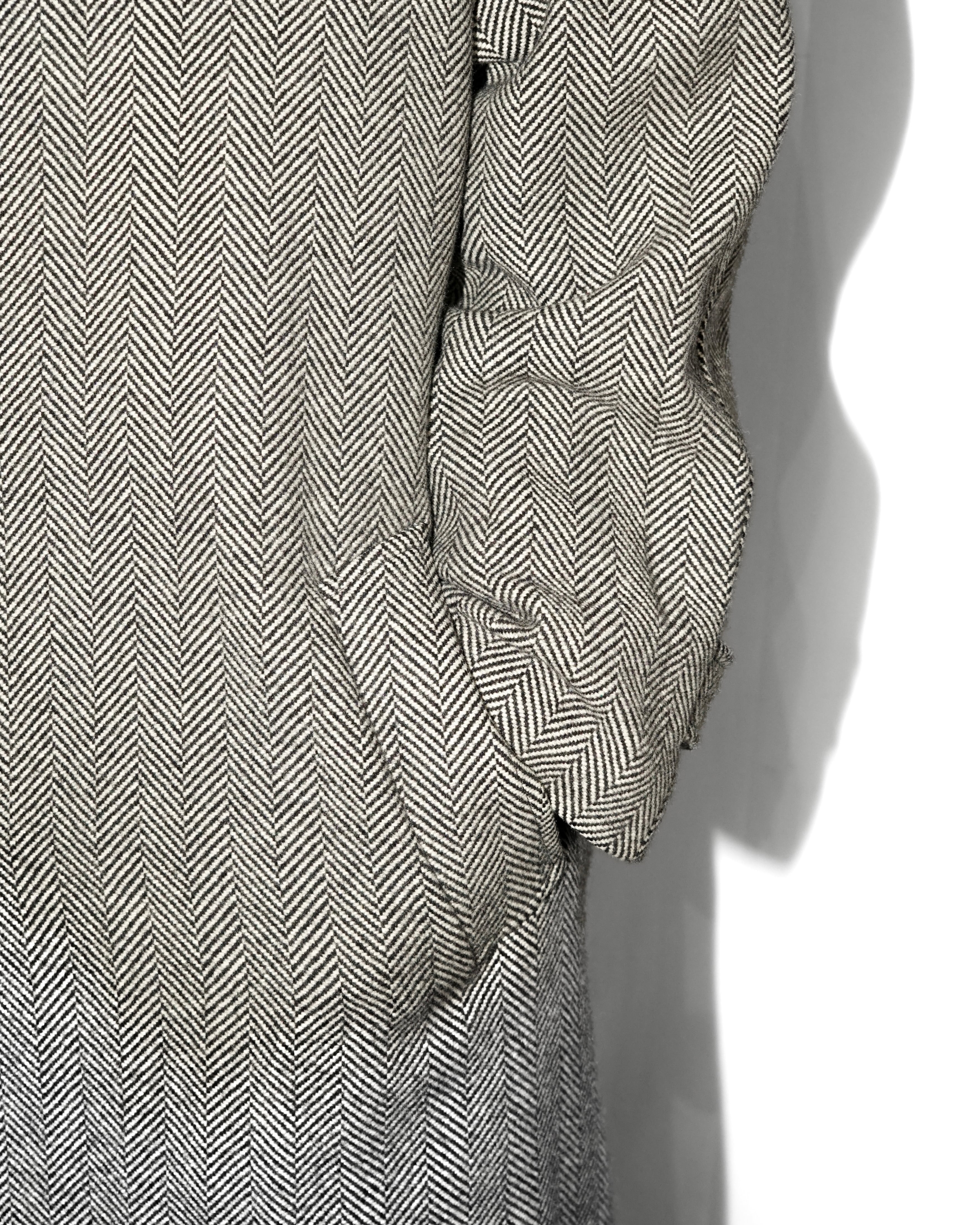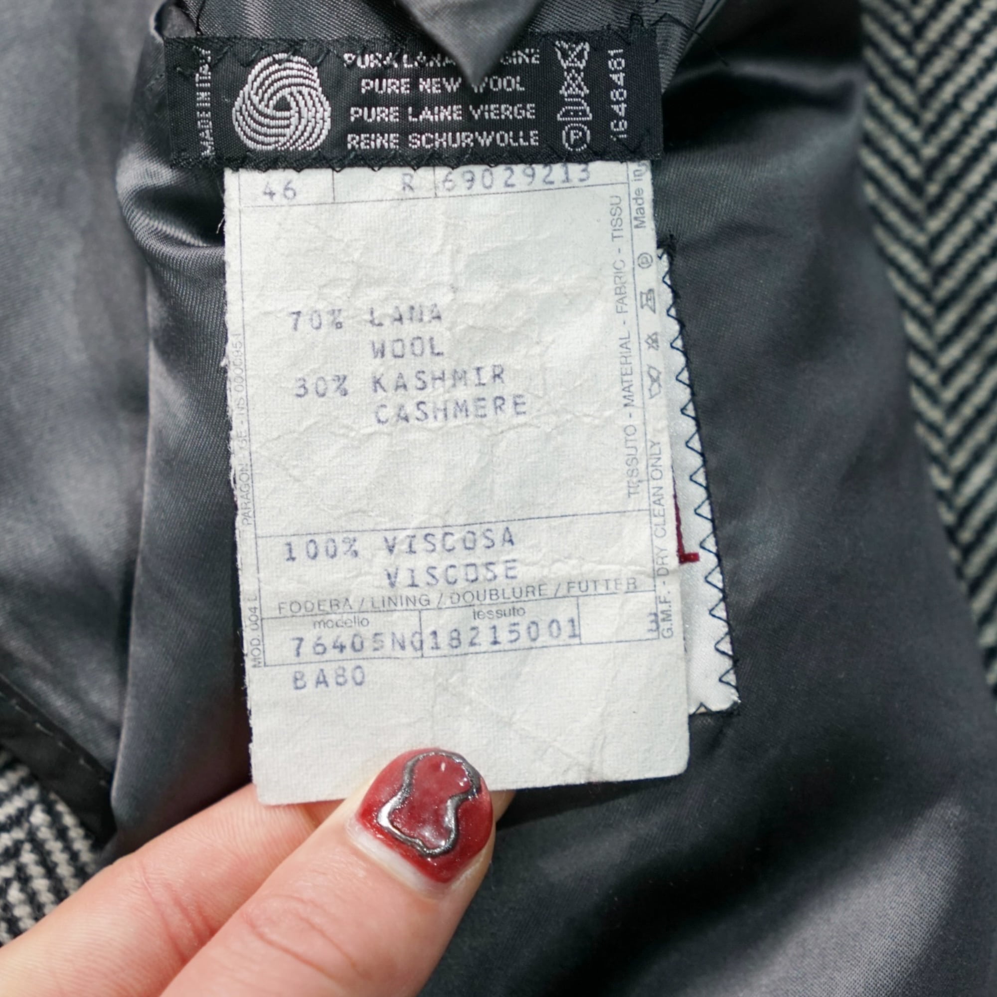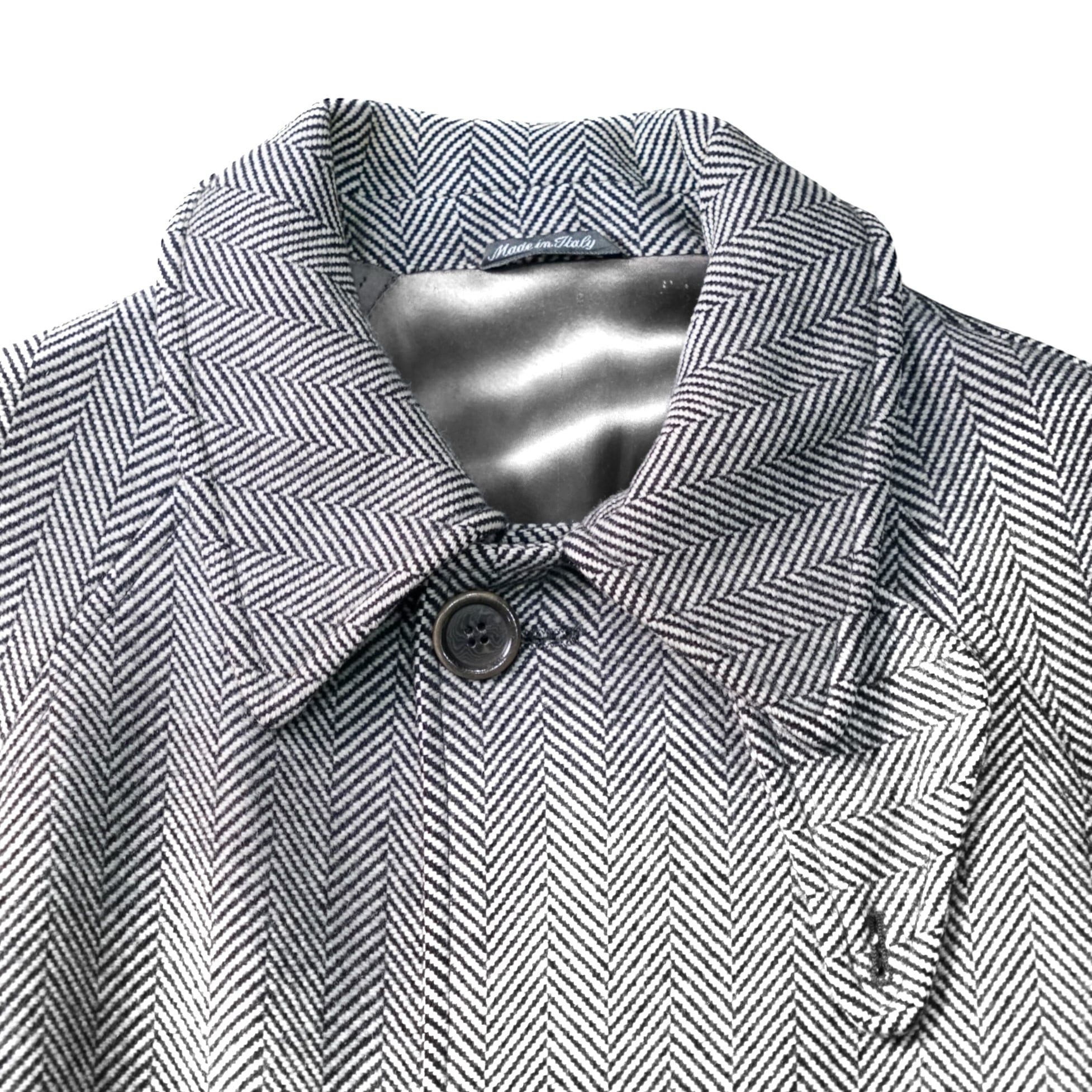 生地は ウール70% × カシミヤ30% の上質な混紡で、カシミヤ特有のしなやかな落ち感と柔らかな光沢が特徴のヘリンボーン織り。