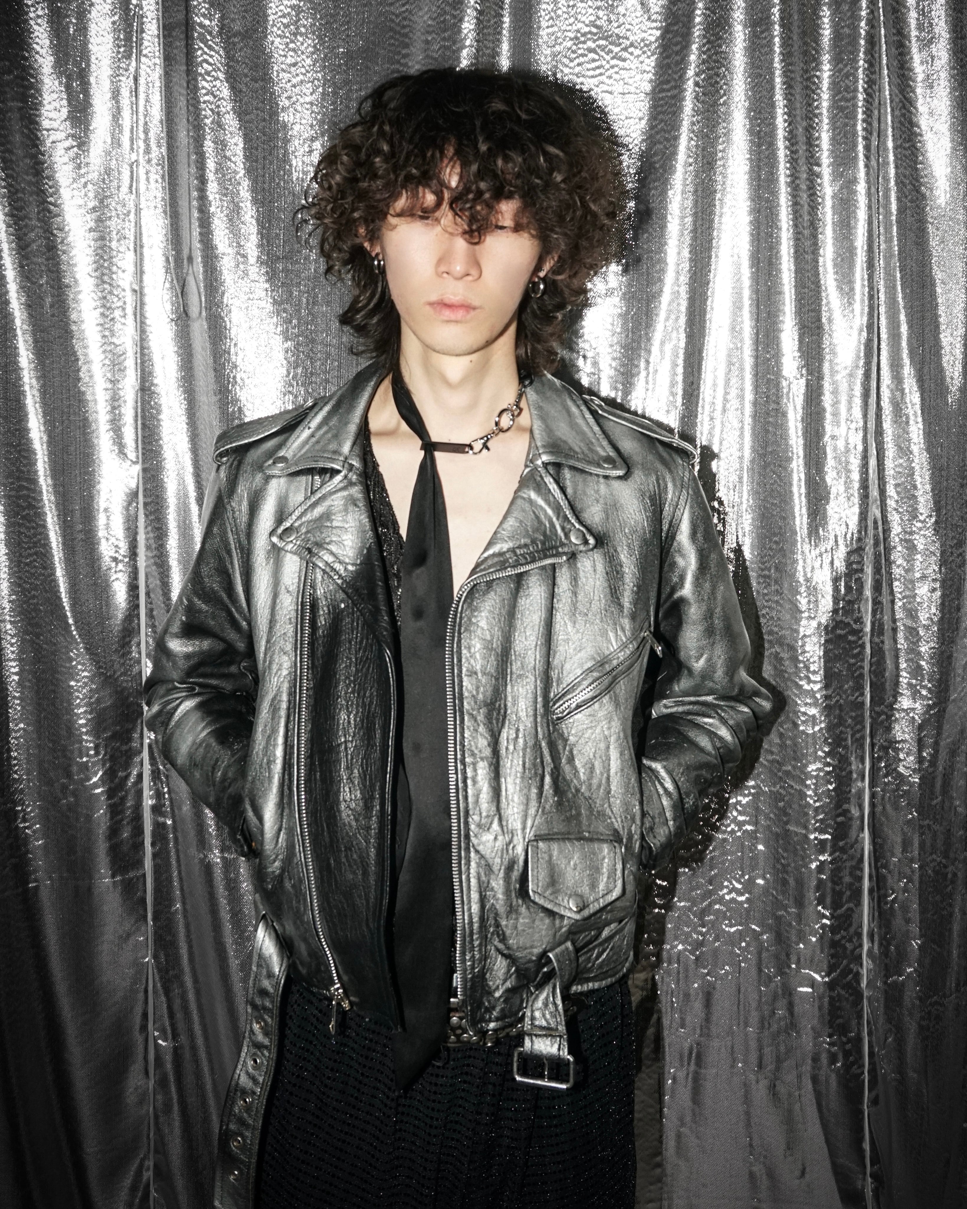 重厚なレザーの質感に、シルバーのスモーキーな霧がかかったような独特の表情が特徴で、経年変化と加工表現が交錯することで唯一無二の奥行きが生まれています。