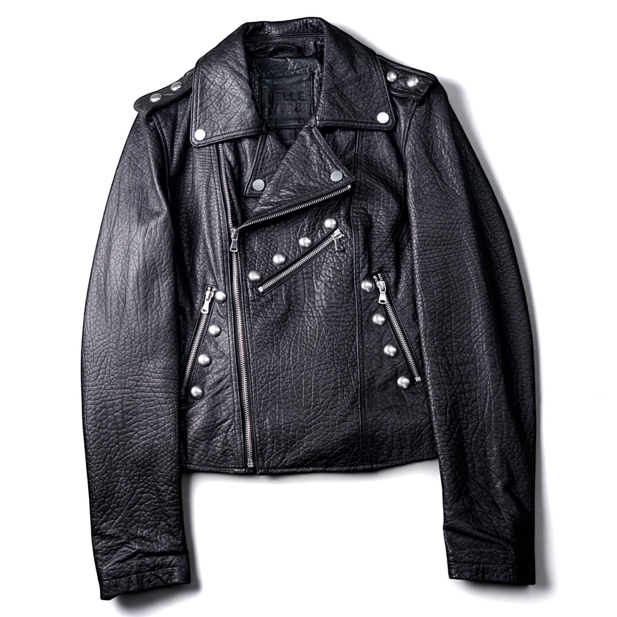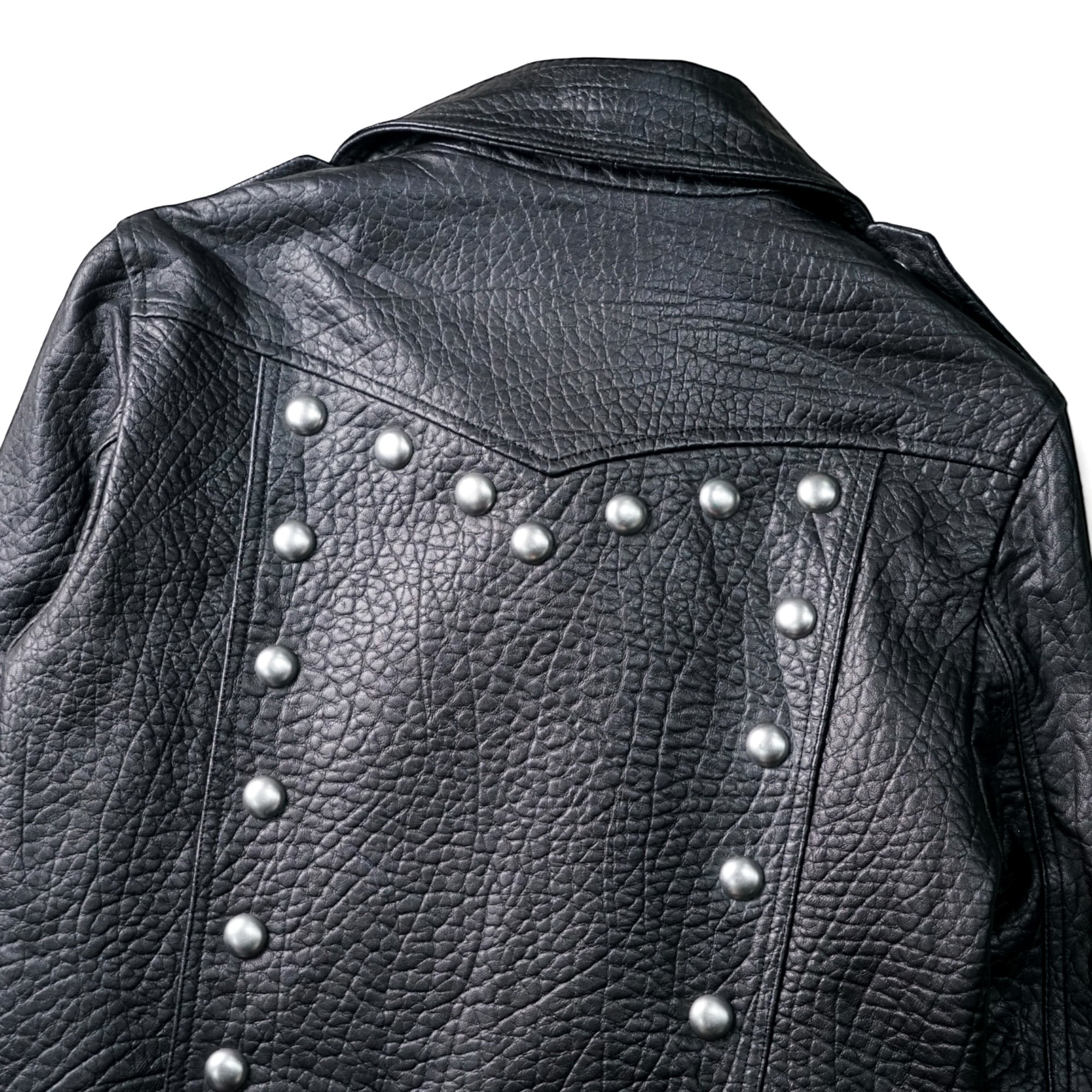 ショートレングスのダブルライダースに、大粒のスタッズを直線的に配置したミニマルかつロックな一着。