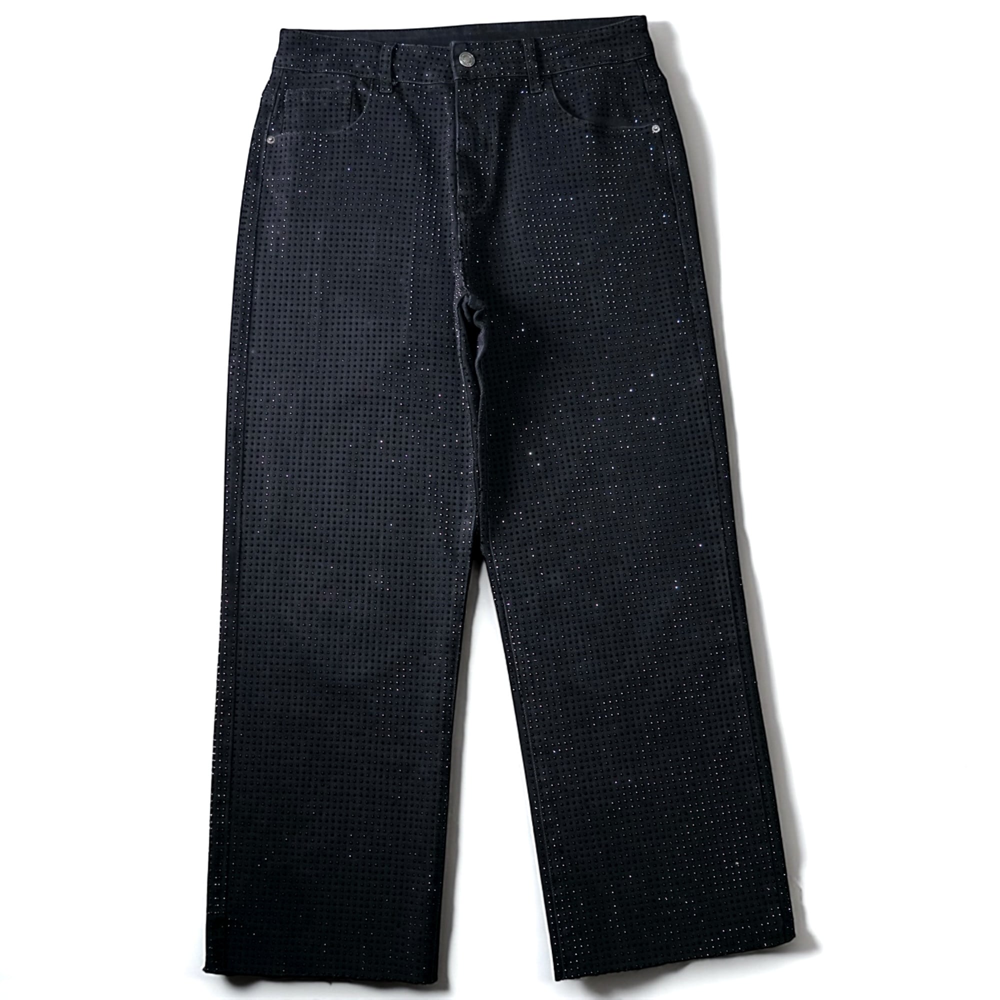 漆黒のデニムをベースに、全面にきらめくラインストーンを散りばめたグラマラスな一本。