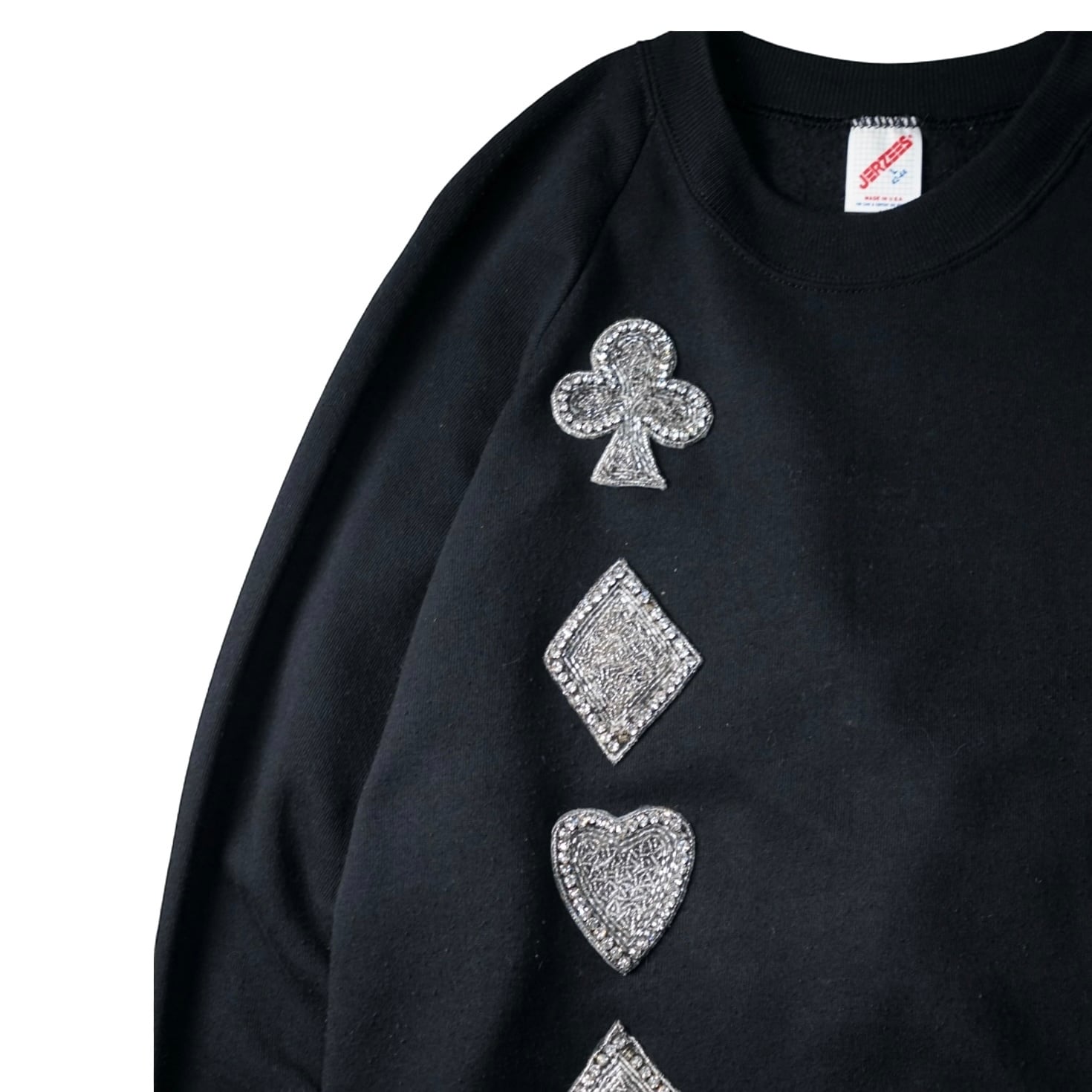 1990年代カナダ製のヴィンテージスウェットに、メタリック調で表現された**トランプモチーフ(クラブ・ダイヤ・ハート・スペード)**を縦に配置した、存在感抜群のデザインスウェット。