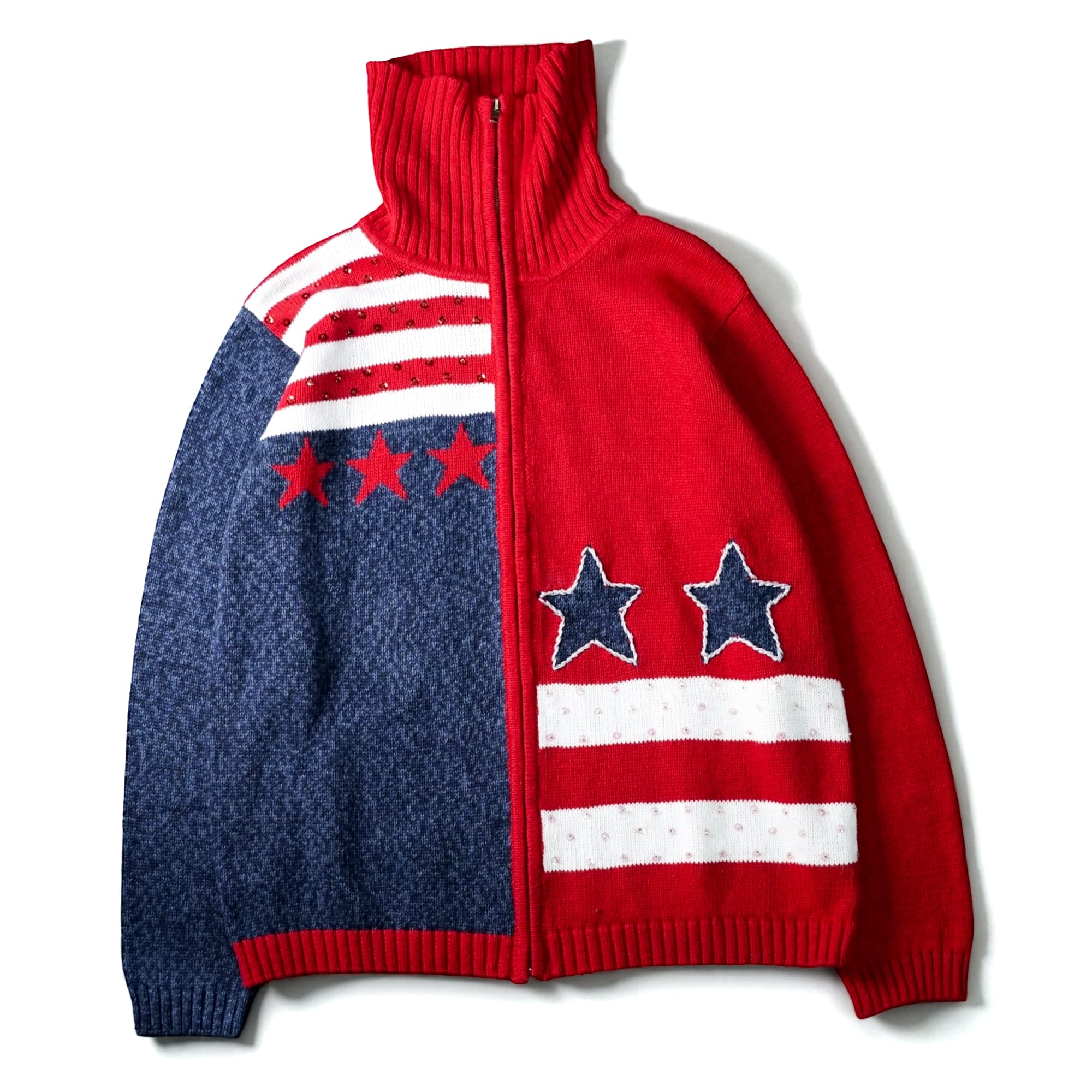 ポップな色使いで表現されたアメリカンフラッグモチーフのフルジップニット。