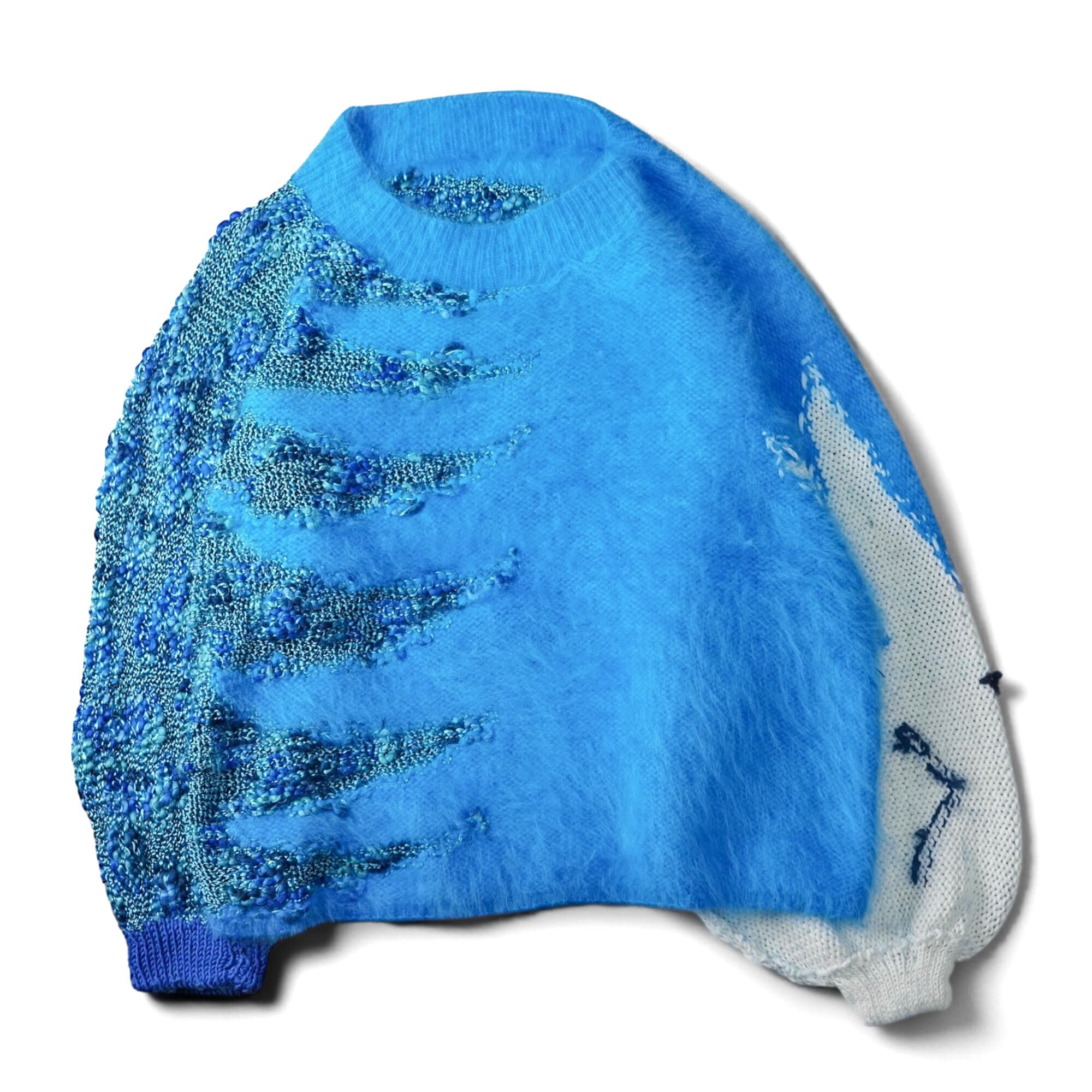 鮮やかなブルーを基調に、複数の編み地と質感を大胆に切り替えたハンドメイドのシャギーデザインニット。