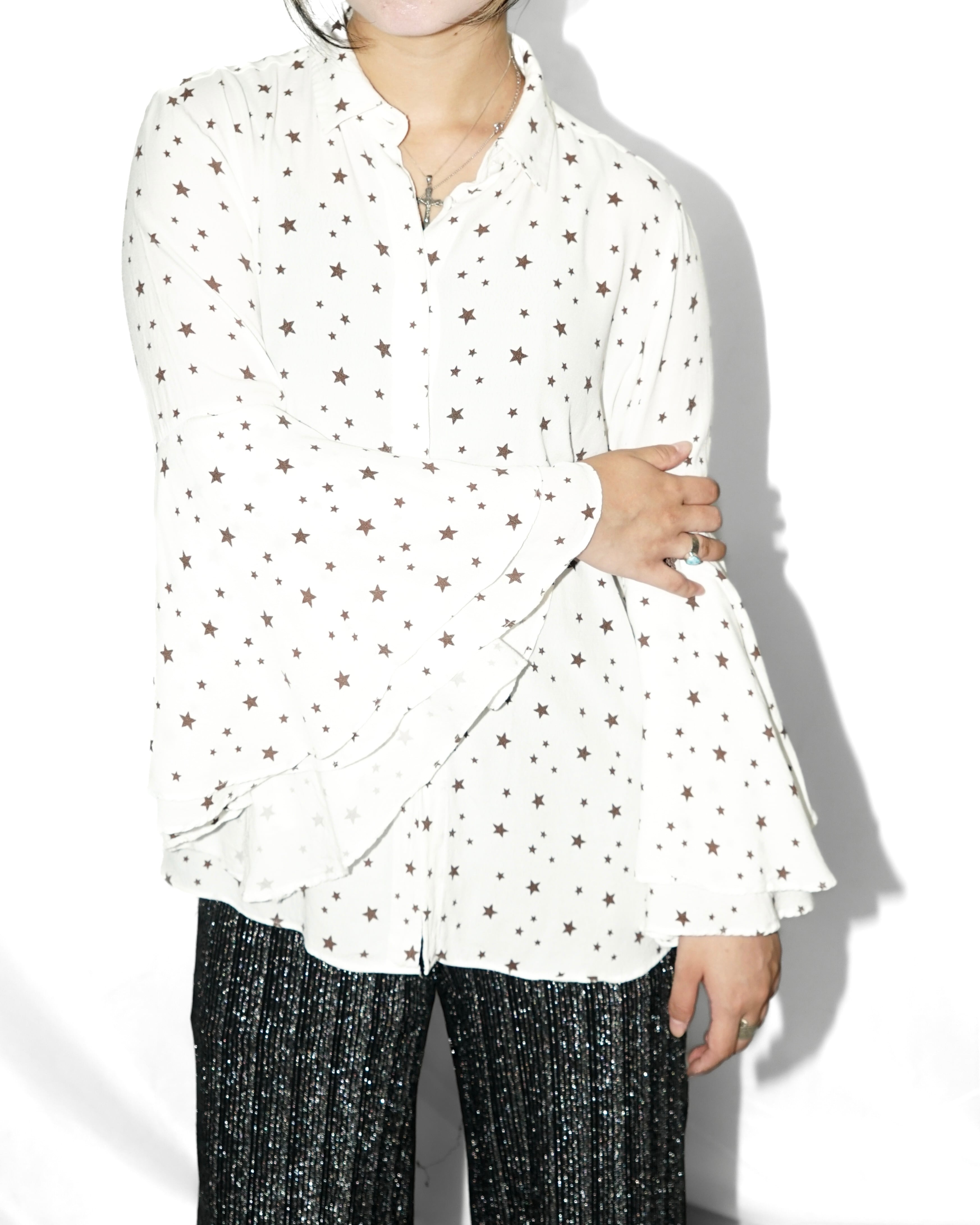 ランウェイを思わせるドラマティックな袖のフレアシルエットが魅力の、ヴィンテージスター柄シアーシャツ。 動くたびにふわりと広がる袖が印象的で、レイヤードスタイルでも圧倒的な存在感を放ちます。 程よく透ける軽やかな素材感は、秋冬の重いスタイリングに抜け感を与えてくれる万能アイテム。 タイトボトムからワイドパンツ、スカートまで幅広く合わせられ、ユニセックスに着用可能です。