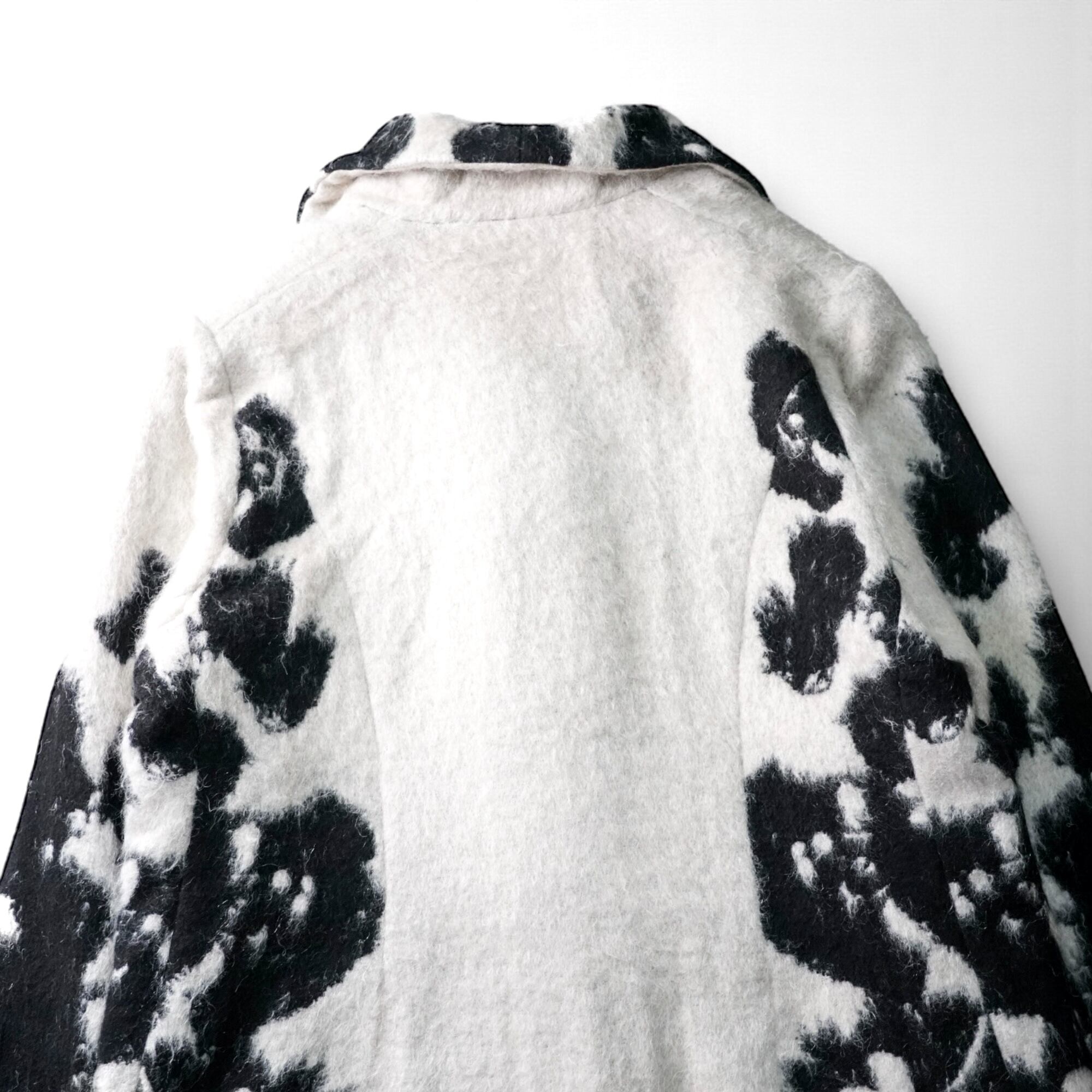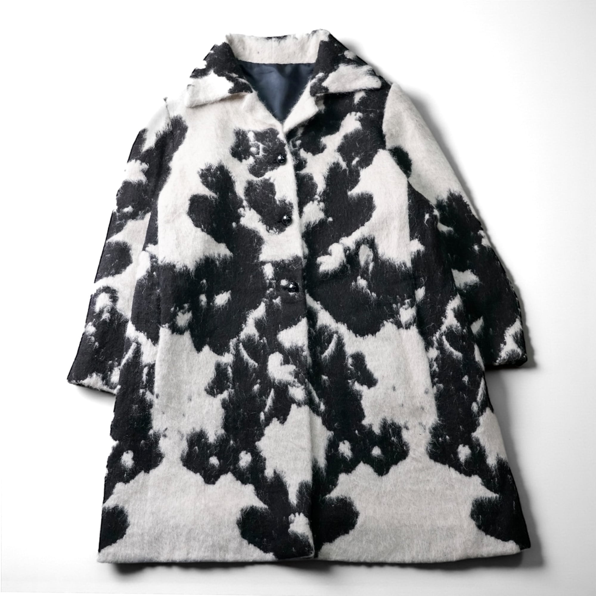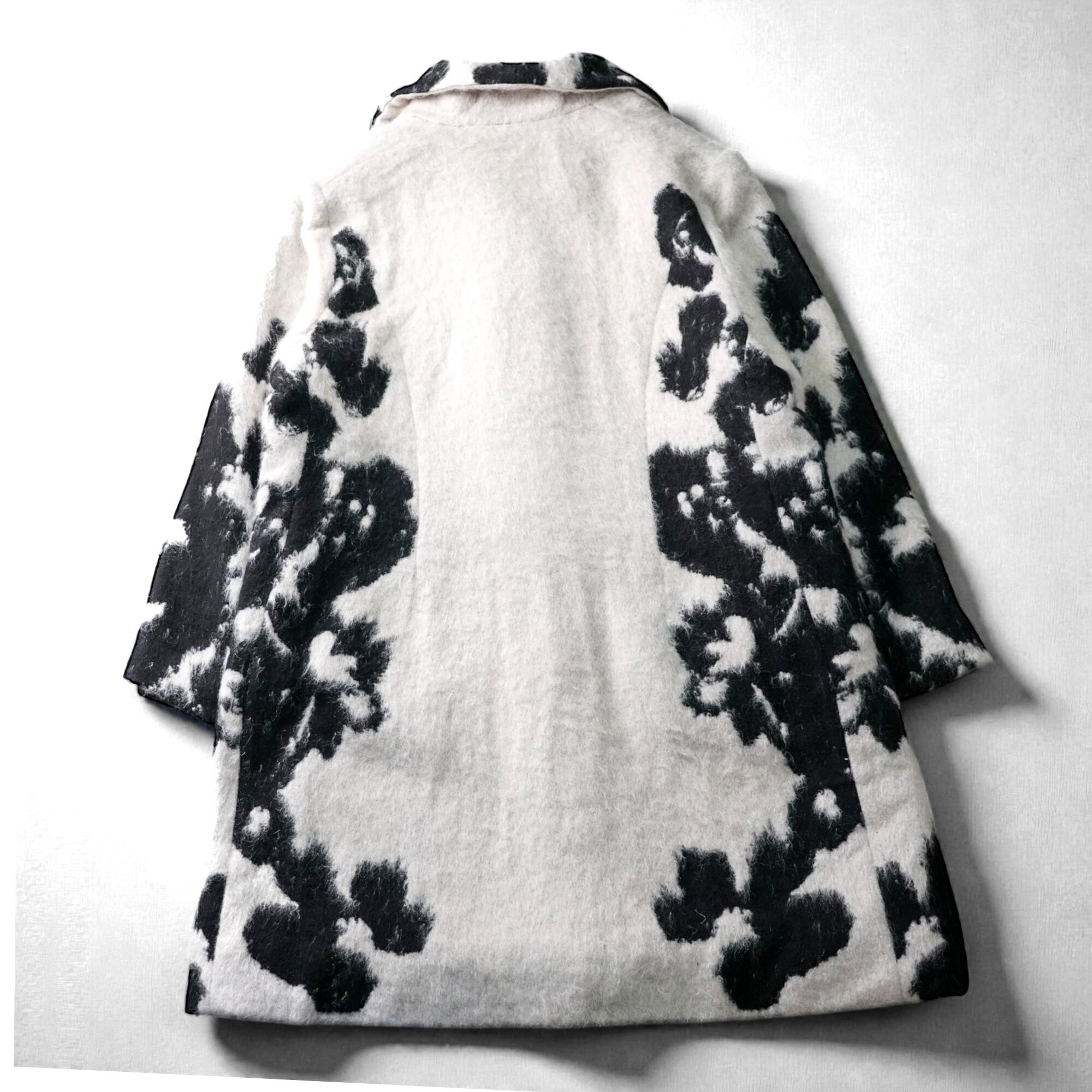 大胆な黒白の抽象パターンを全面に描いた、アートピースのようなモヘアコート。