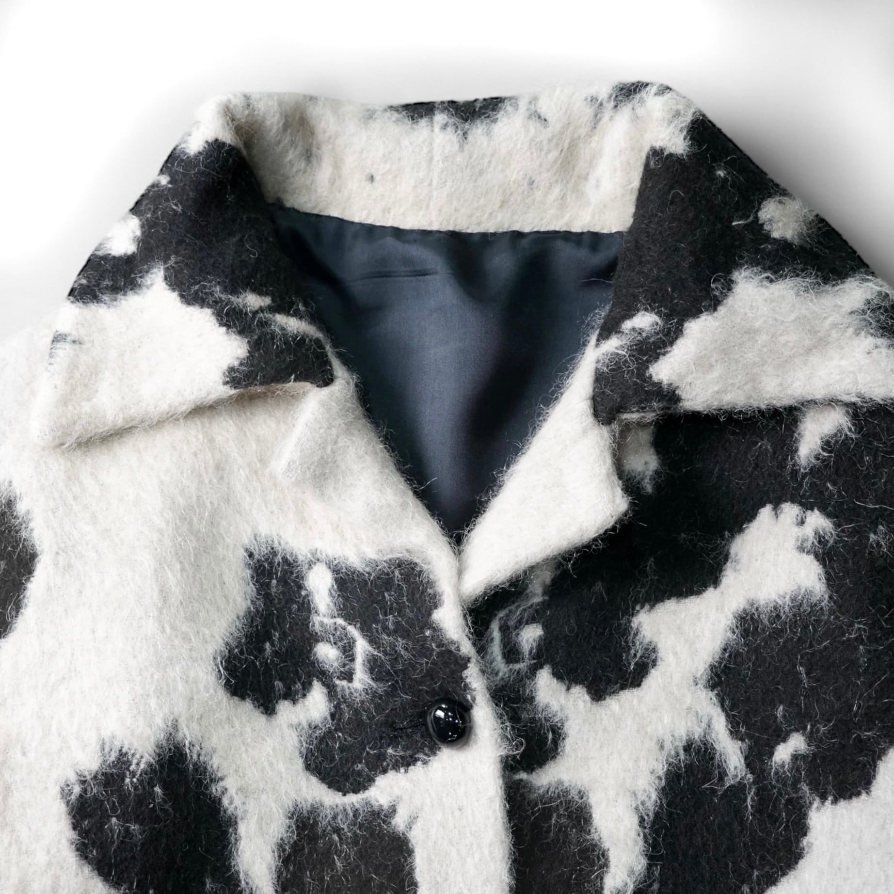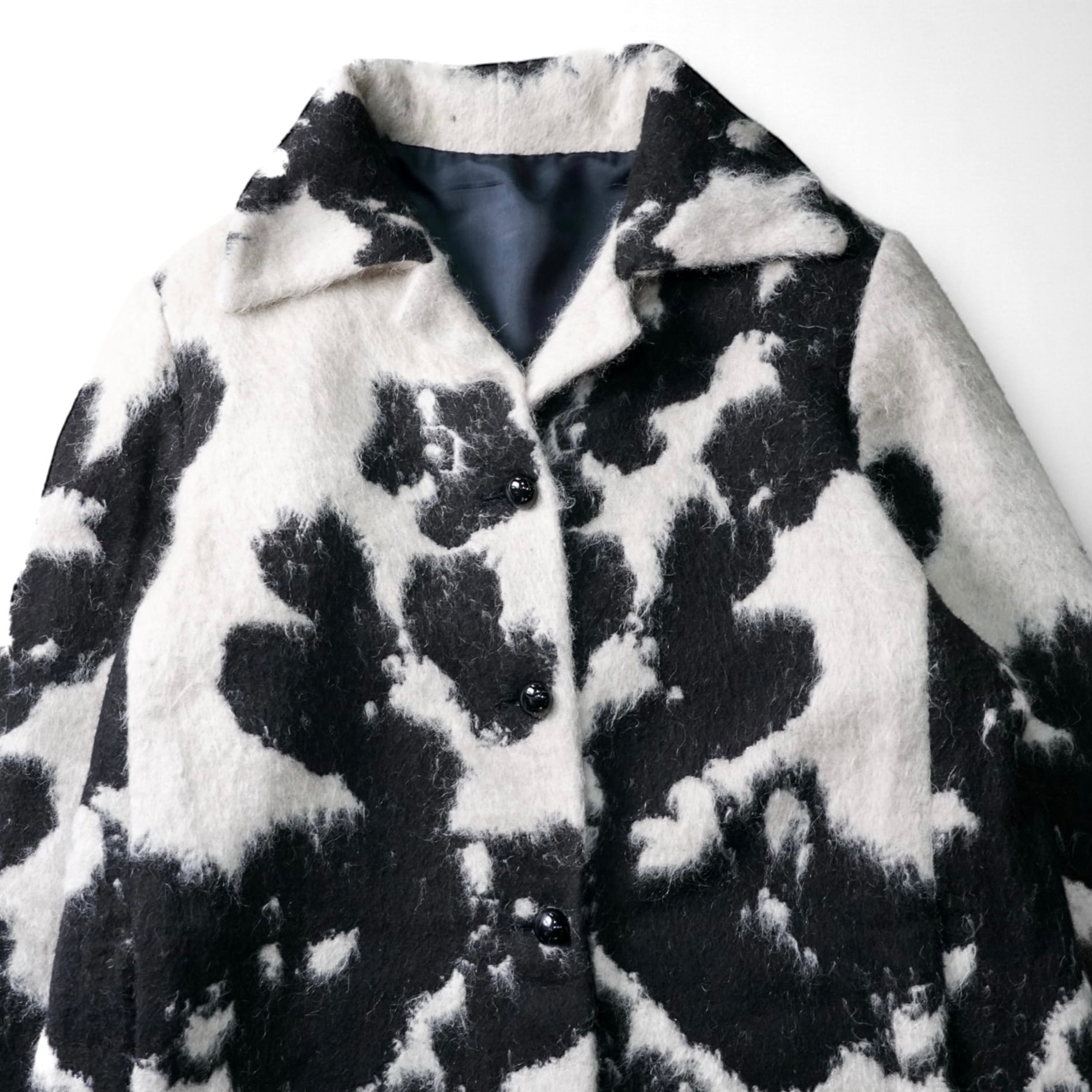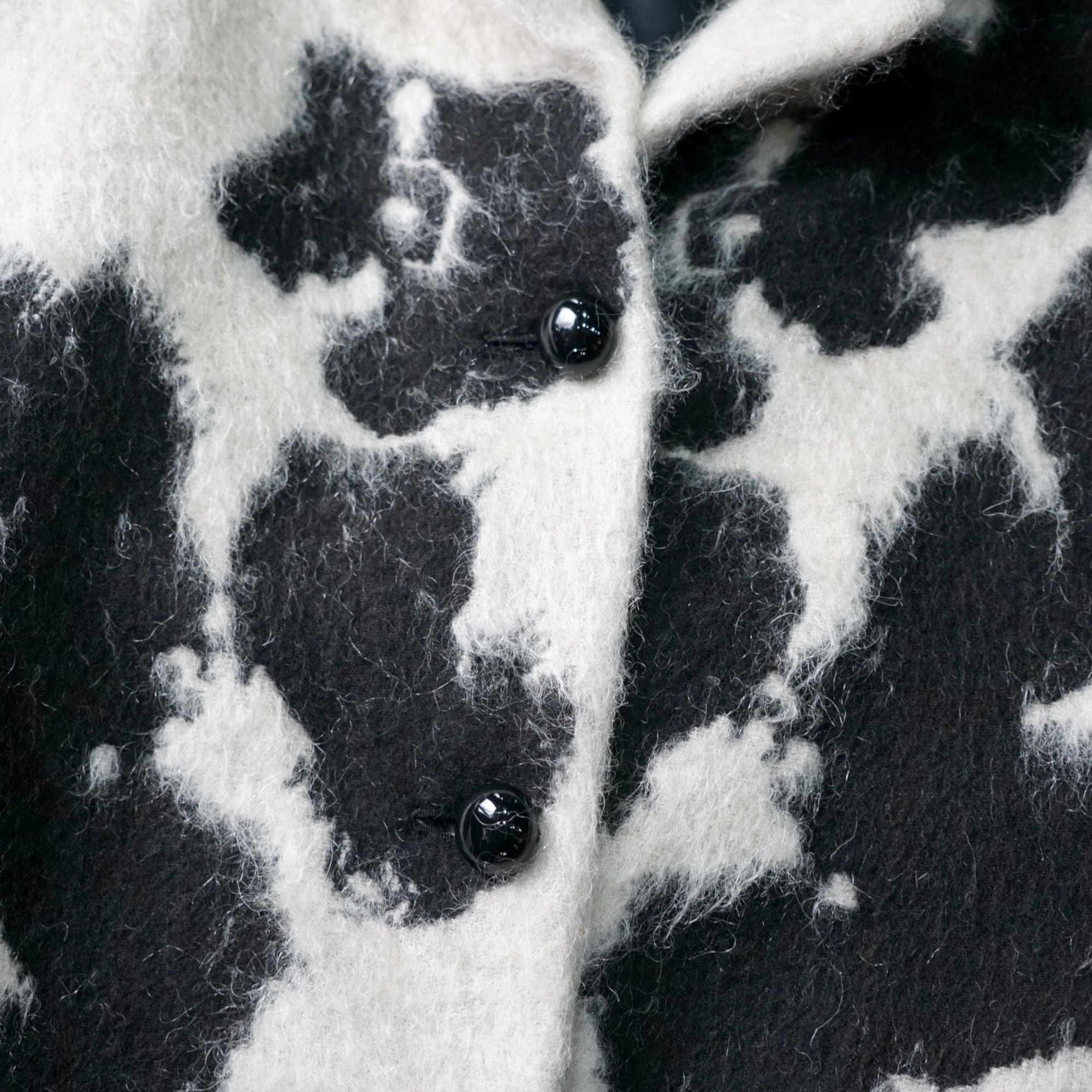 大胆な黒白の抽象パターンを全面に描いた、アートピースのようなモヘアコート。