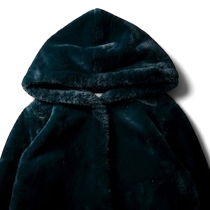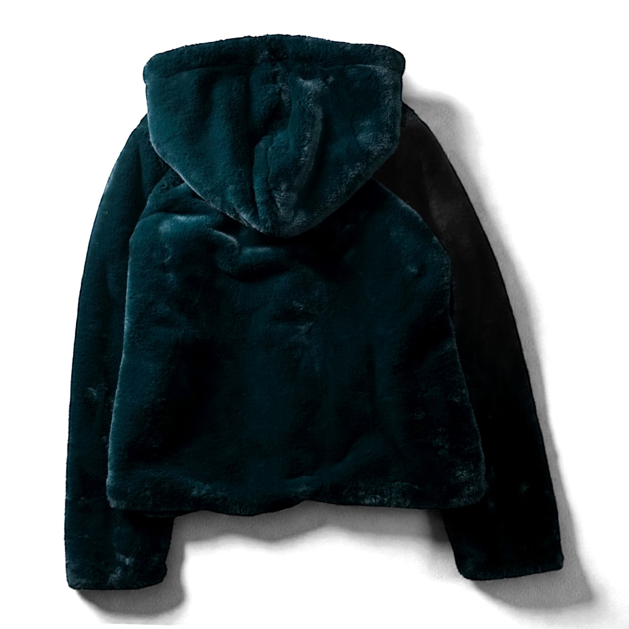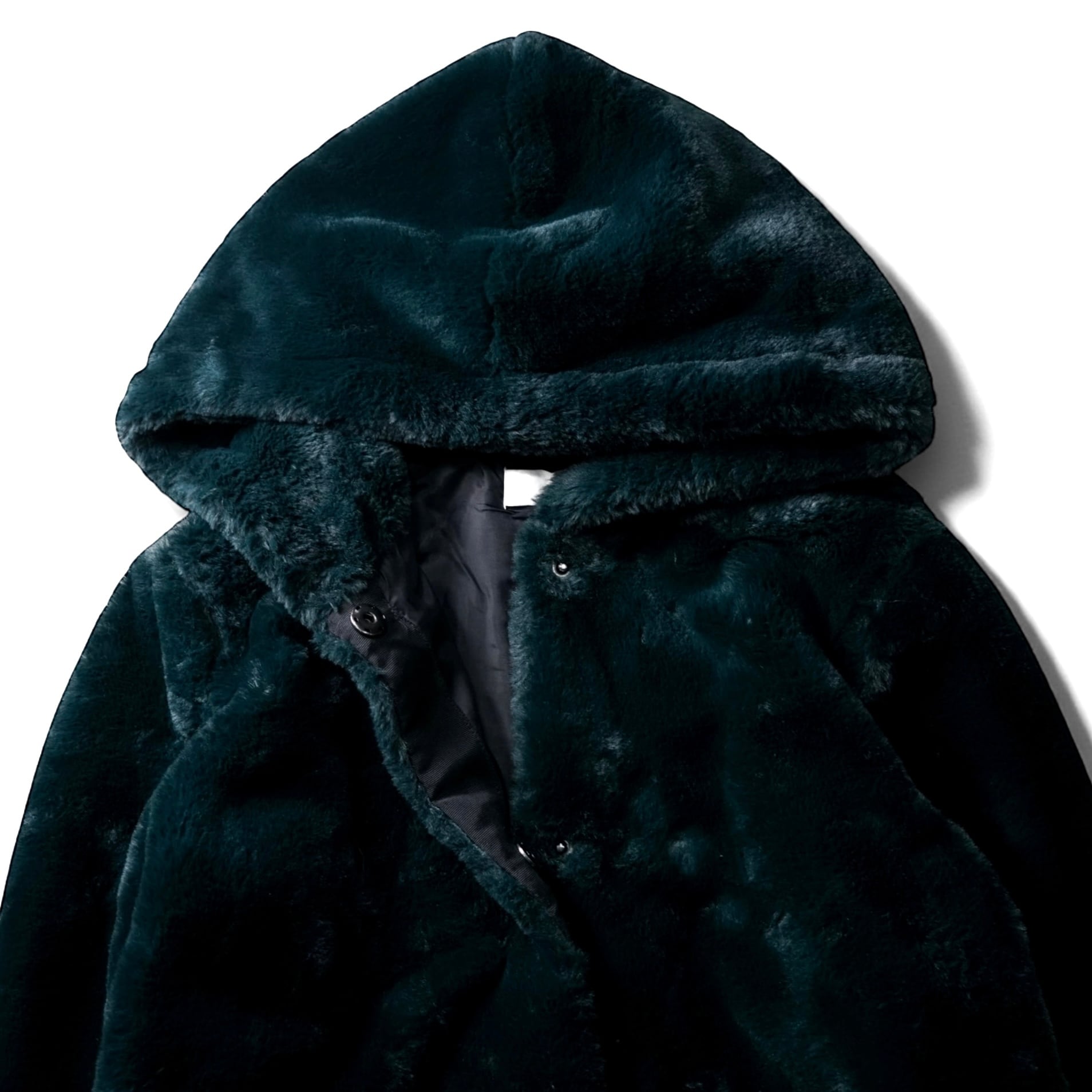 深みのあるグリーンカラーが印象的な、フード付きフェイクファージャケット。