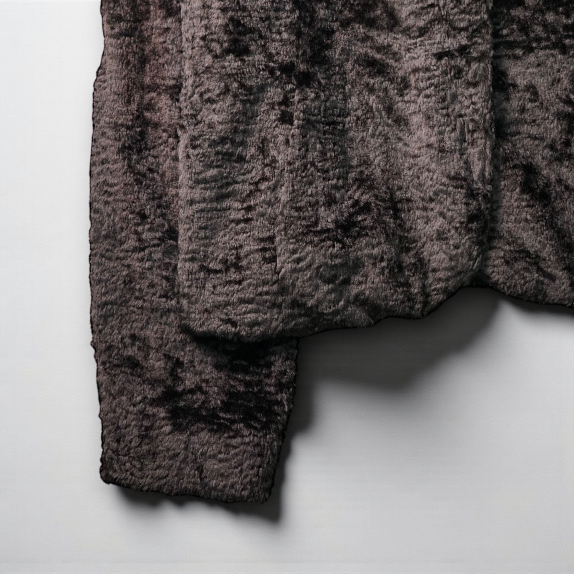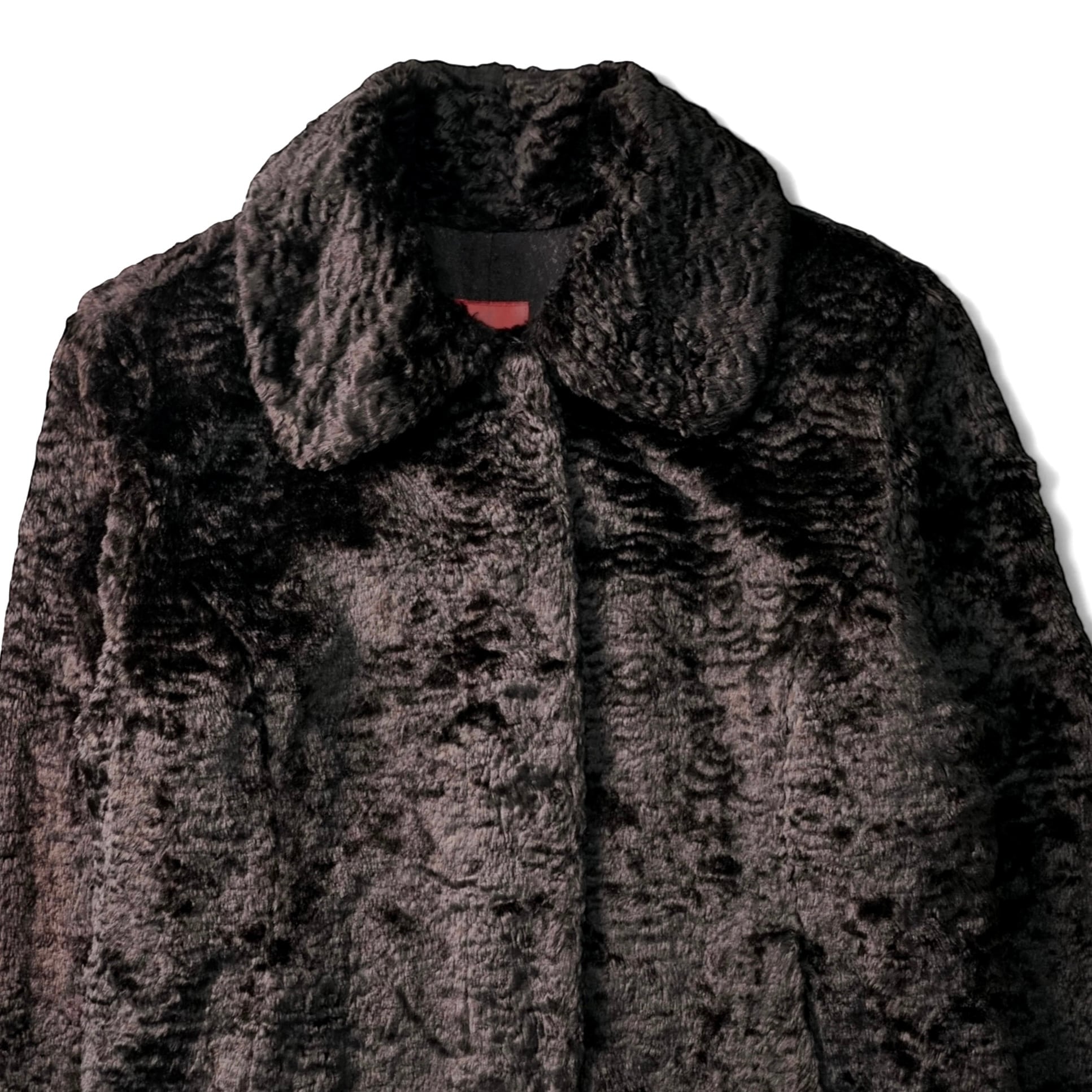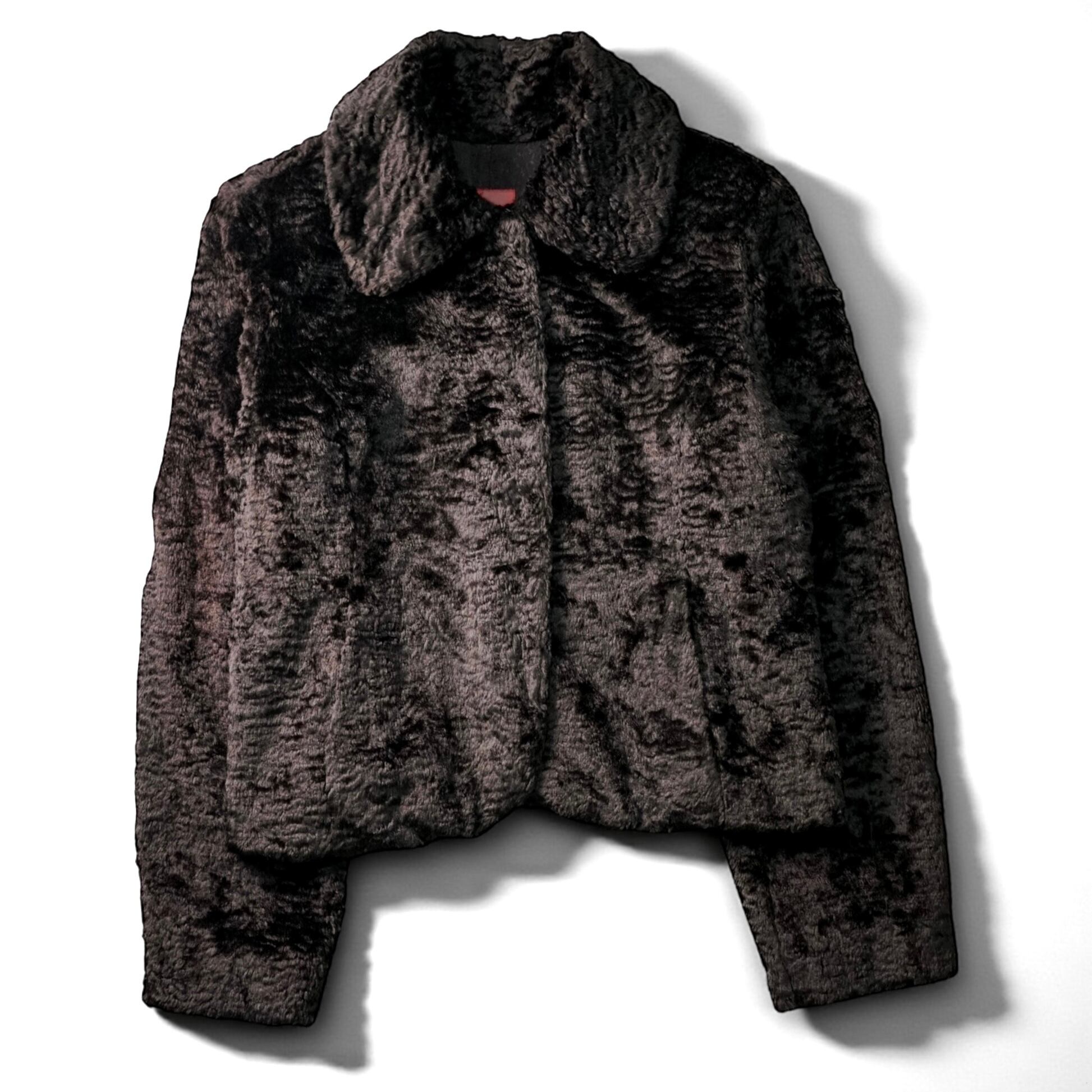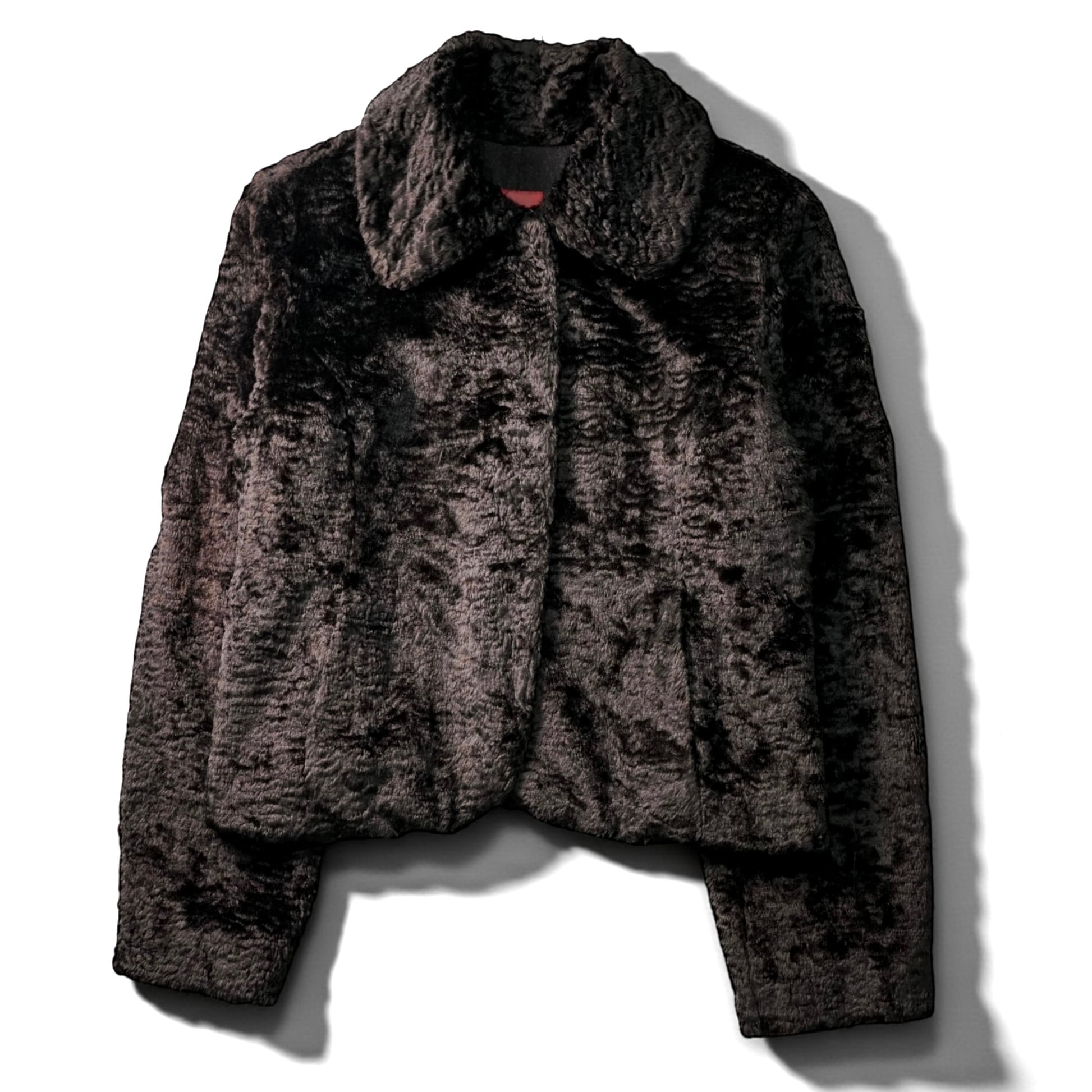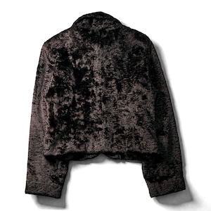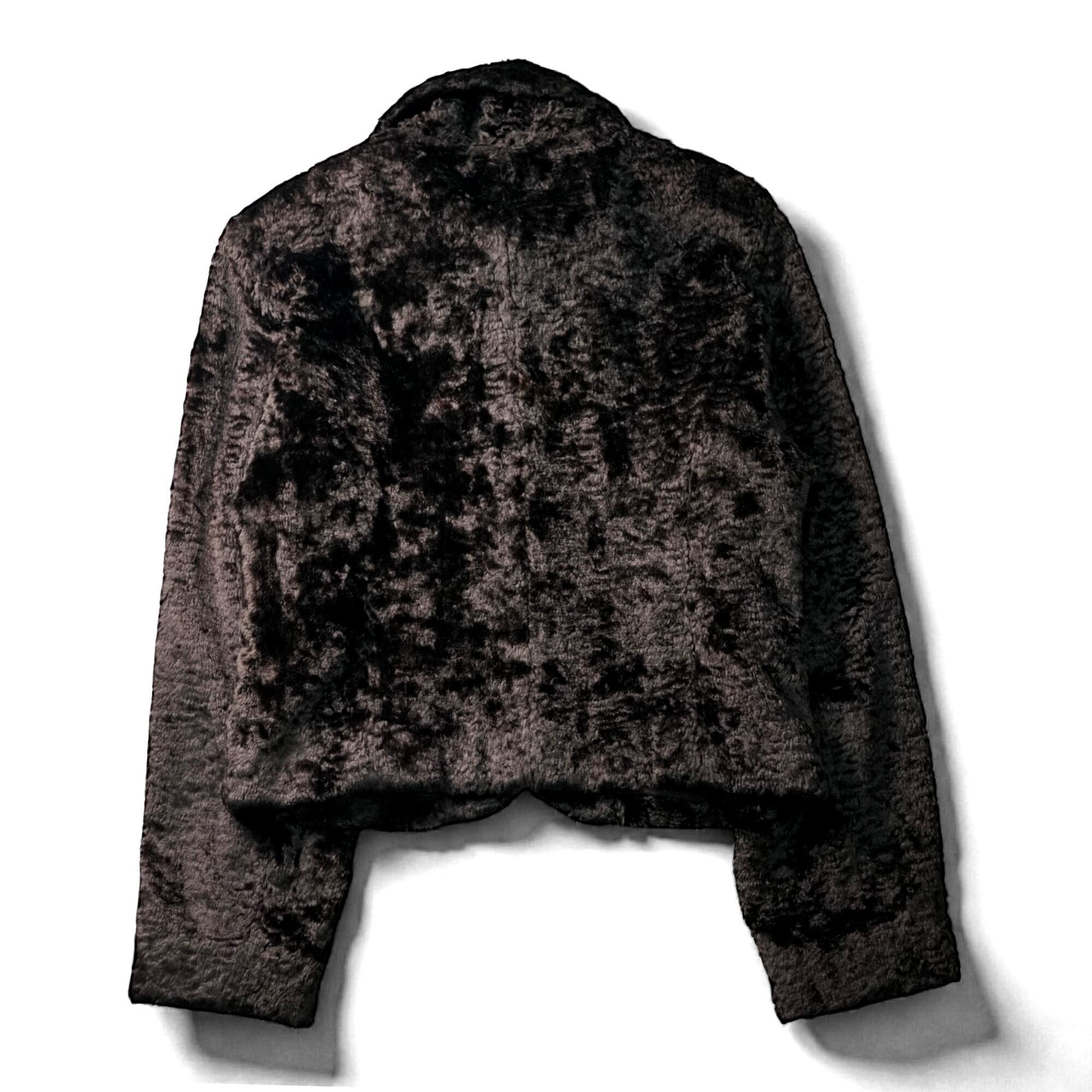 深みのあるブラウンカラーに、優しく波打つようなシアードファーの質感が美しいフェイクファージャケット。