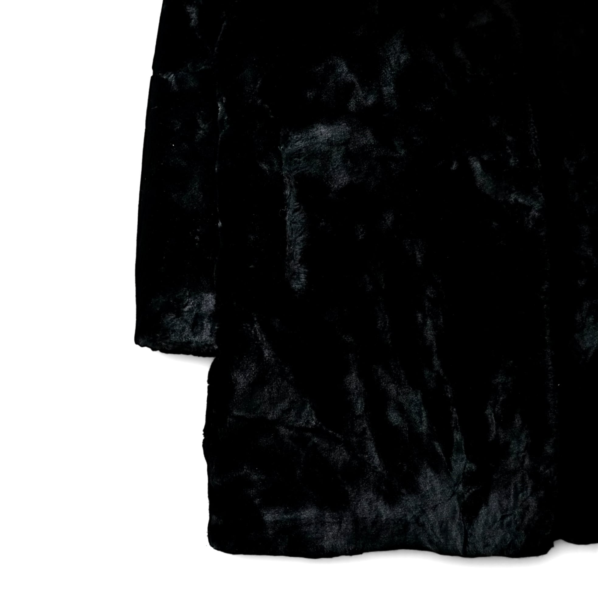 深い黒のフェイクファーは、光を吸い込むようなマットさと、揺れるたびに艶が走る上品な質感を兼ね備え、リアルファーさながらの密度ととろみのある落ち感が魅力です。