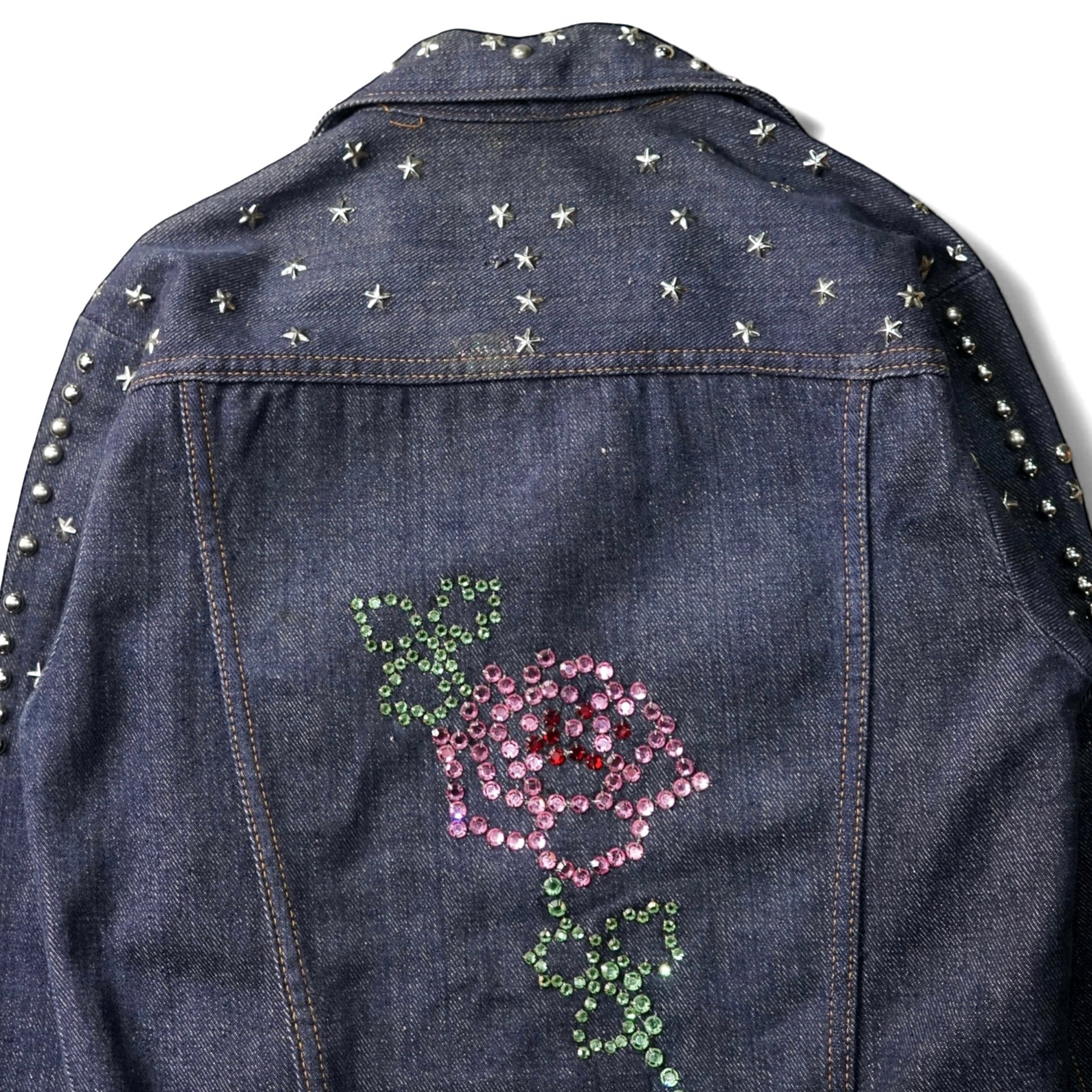 フロントにはシルバースタッズ×星のピンスタッズがびっしりと配置され、背面にはピンクとグリーンのラインストーンで描かれたローズ。
