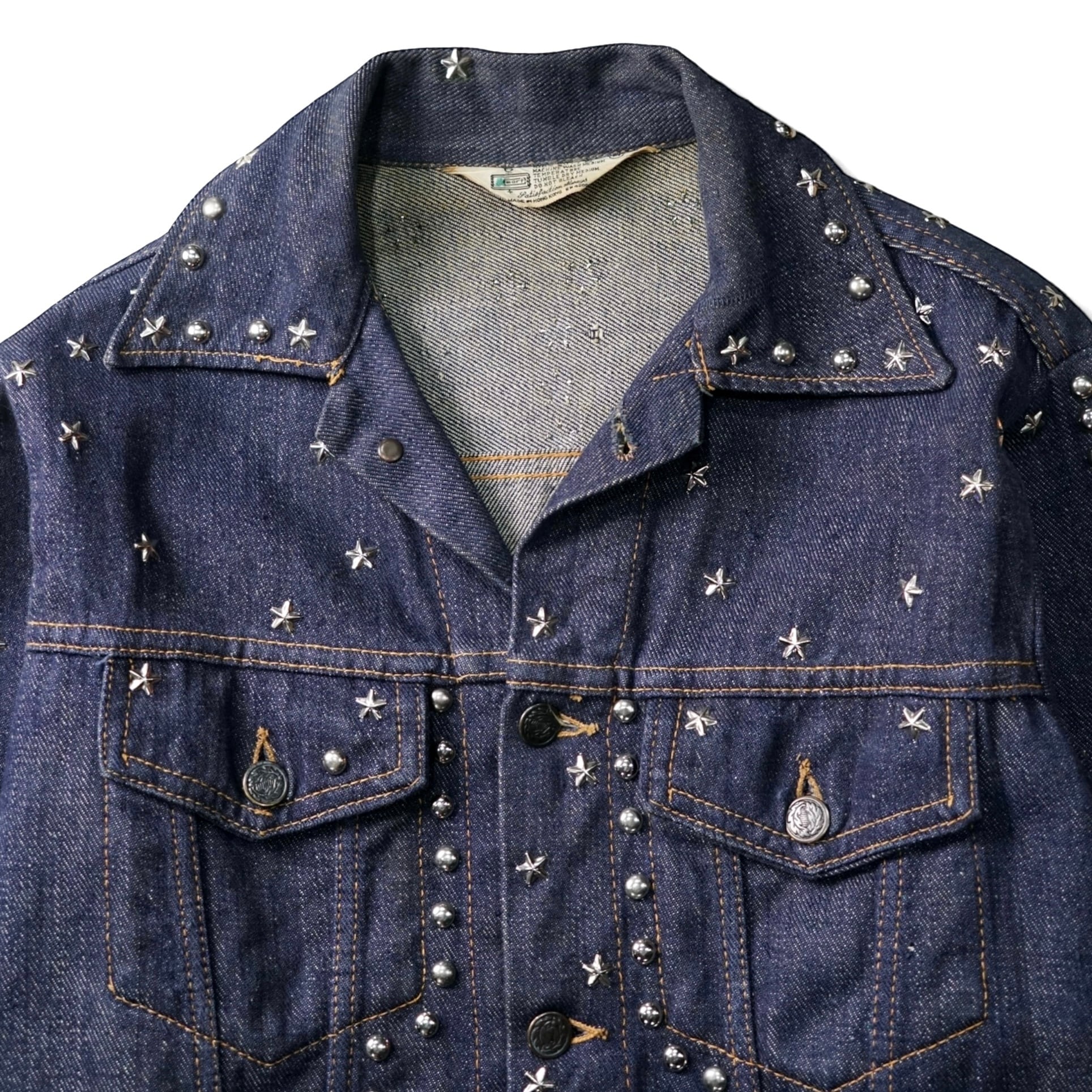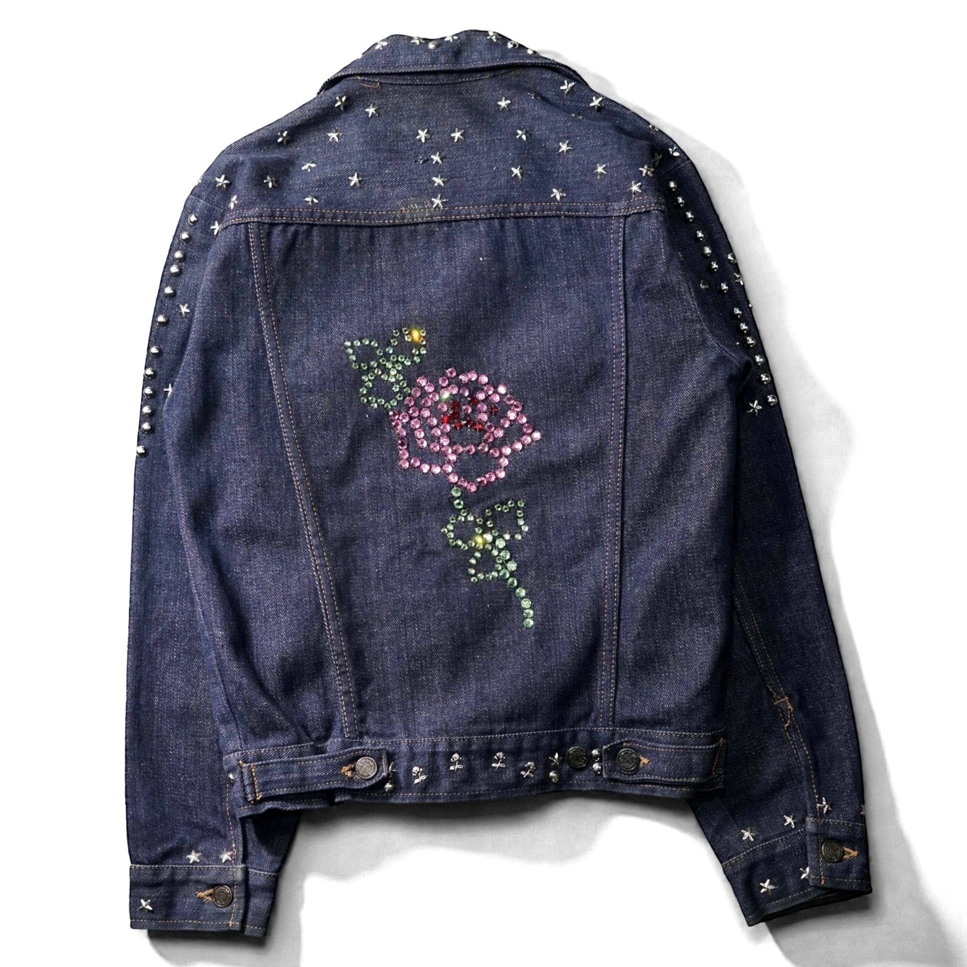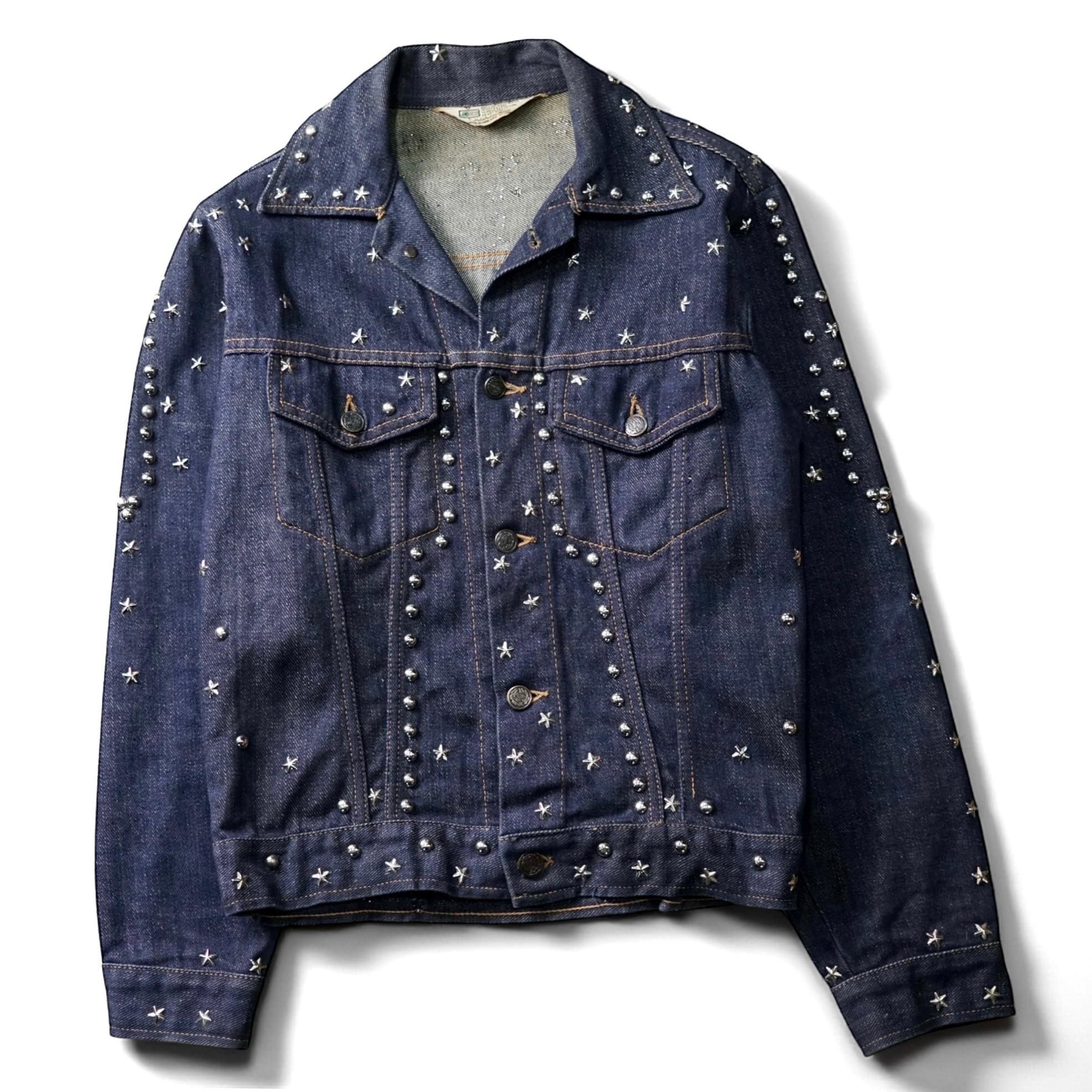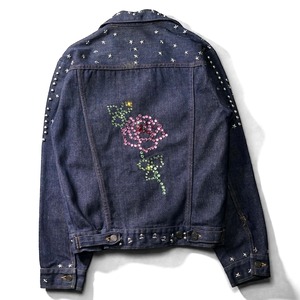 70年代当時、ロックとウエスタンが混ざりはじめた空気感そのままに、手作業でスタッズとラインストーンを打ち込んだ一着。