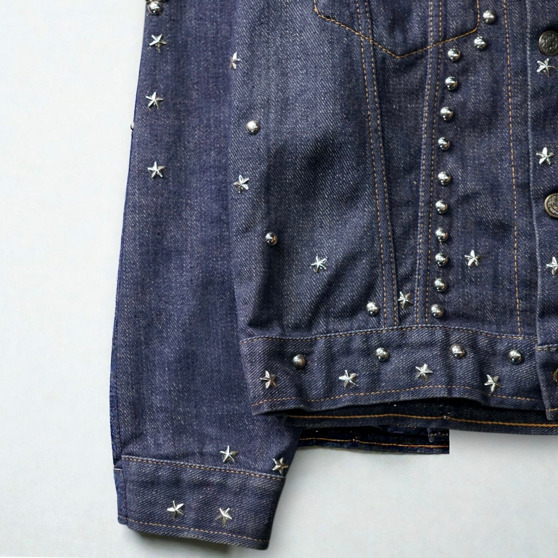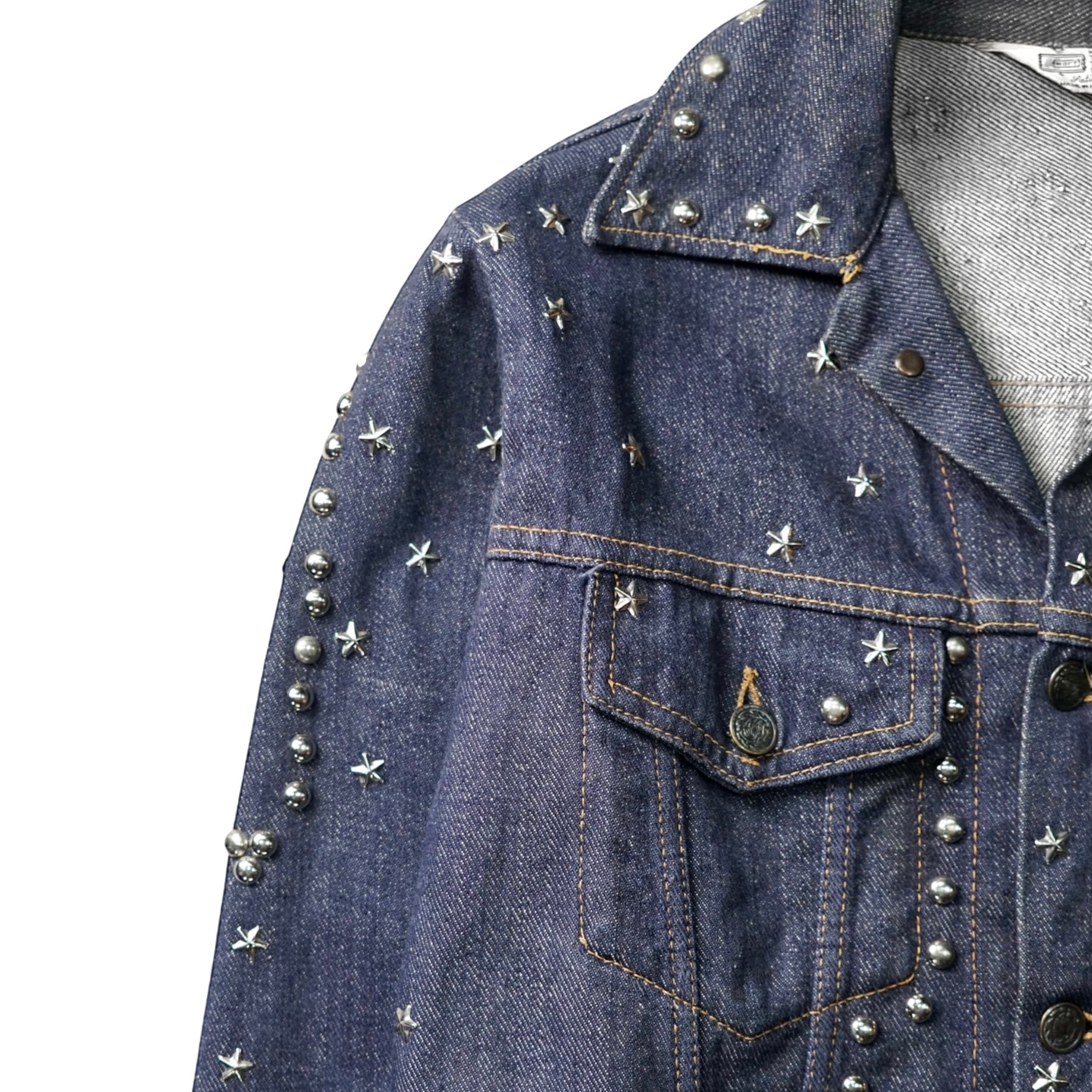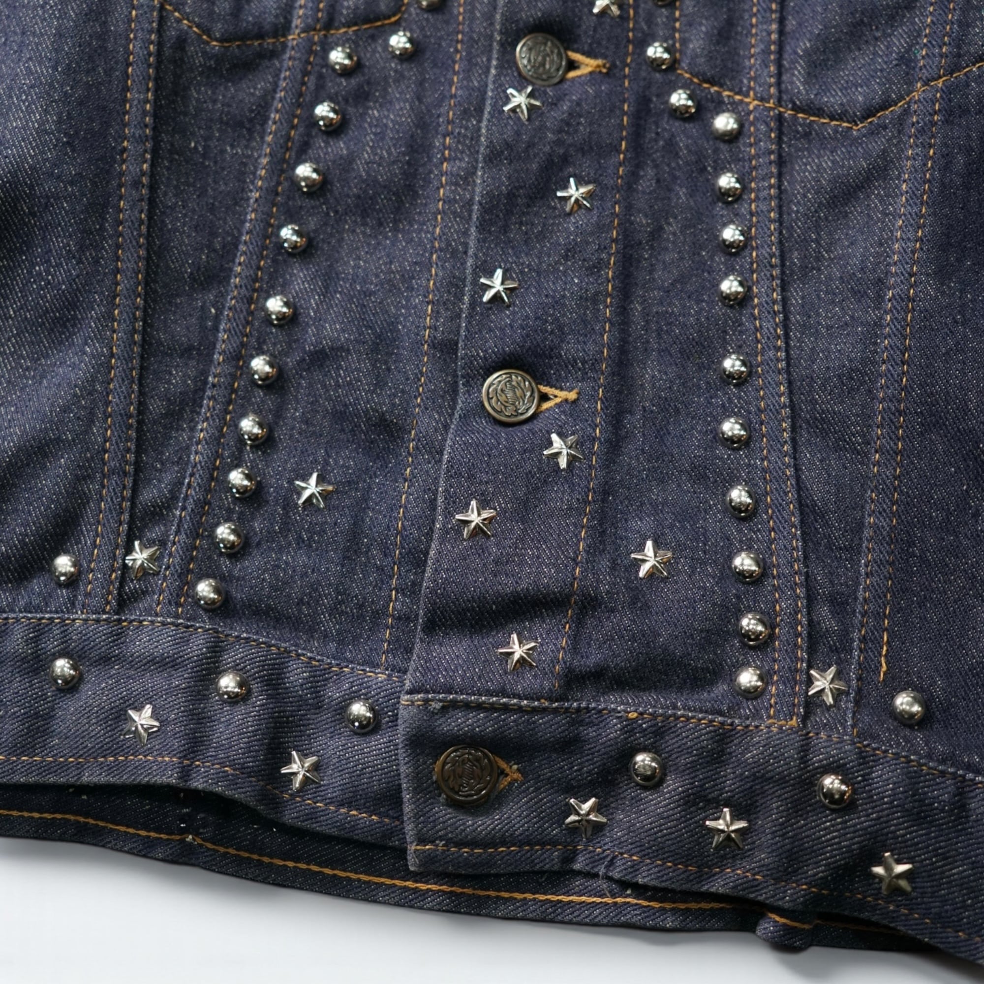 70年代当時、ロックとウエスタンが混ざりはじめた空気感そのままに、手作業でスタッズとラインストーンを打ち込んだ一着。