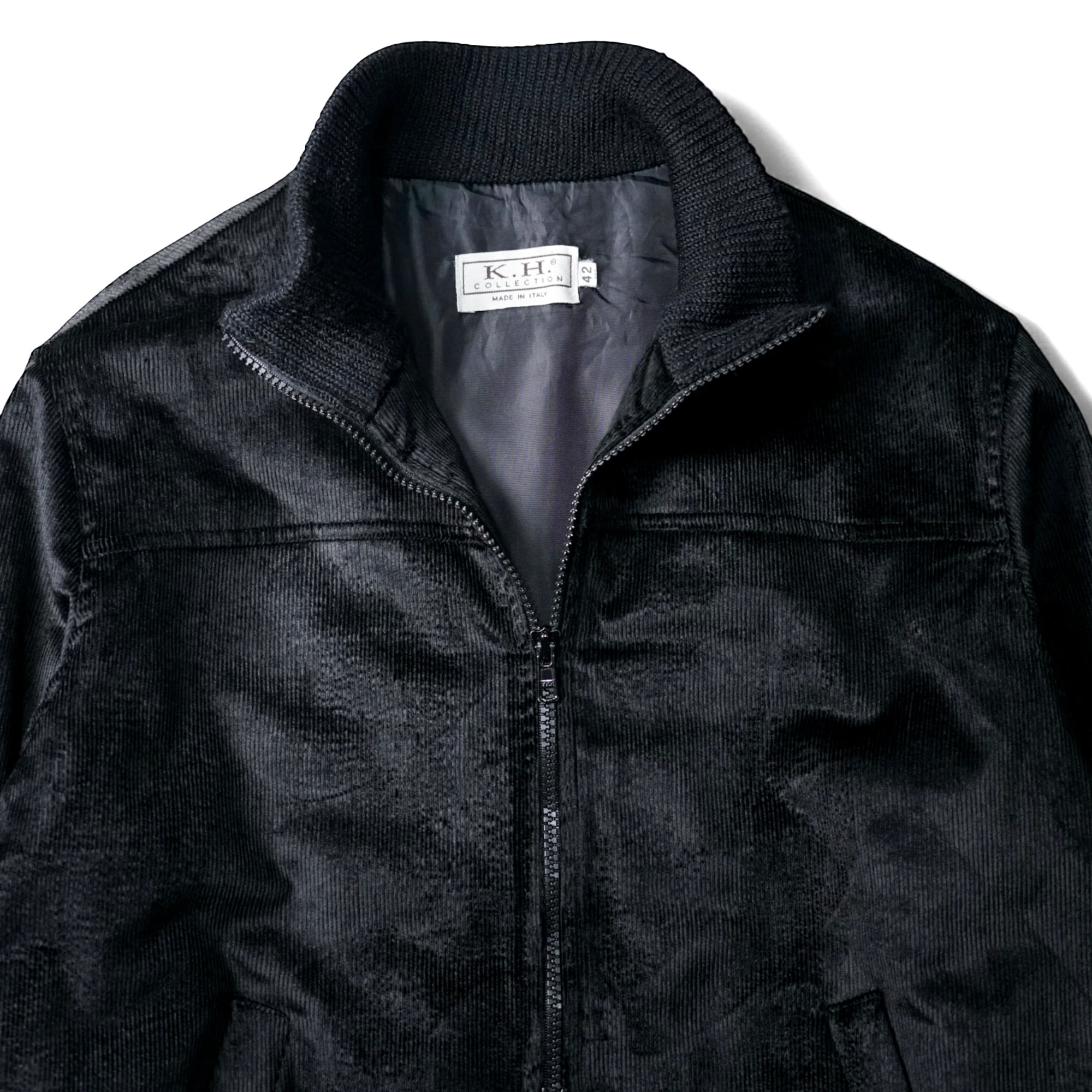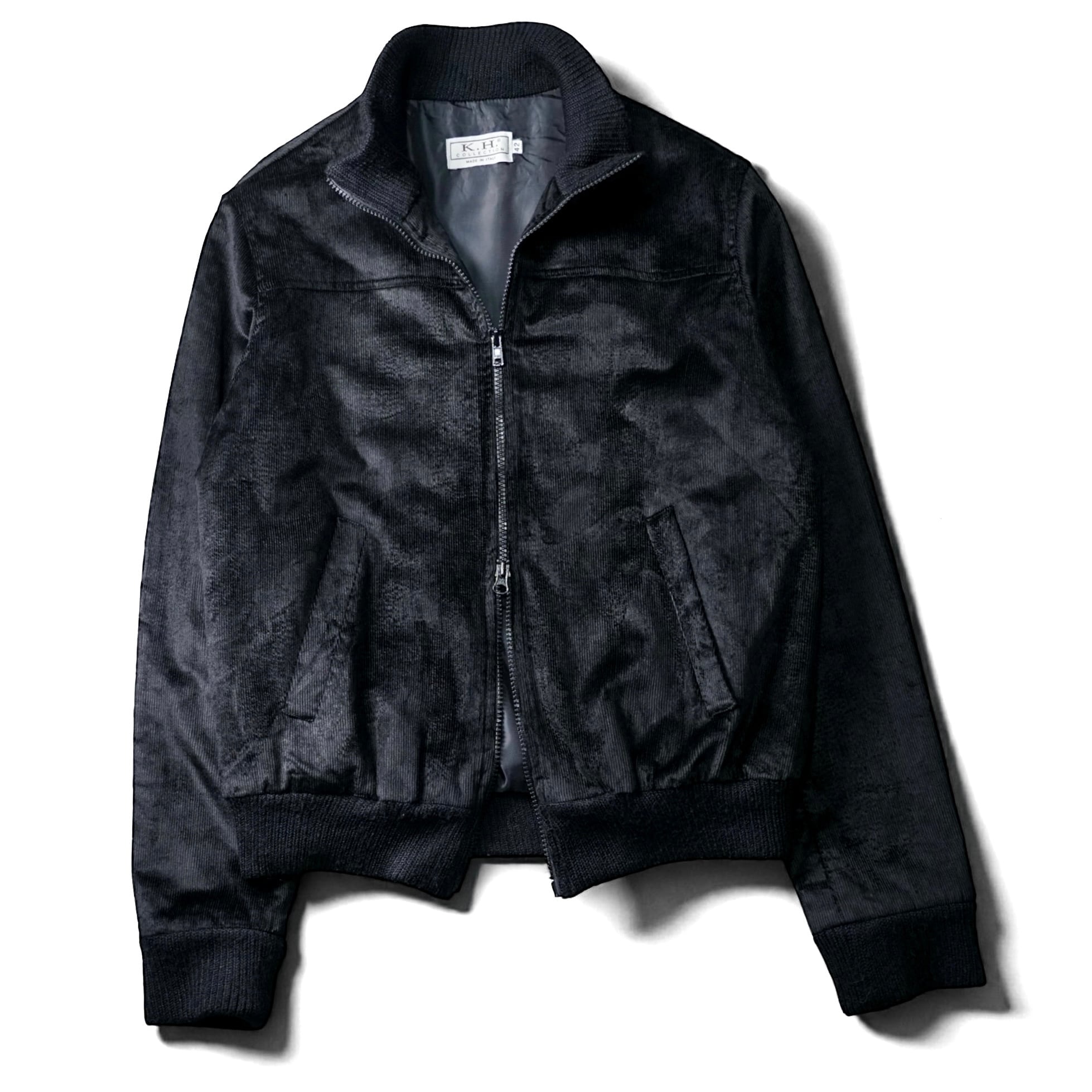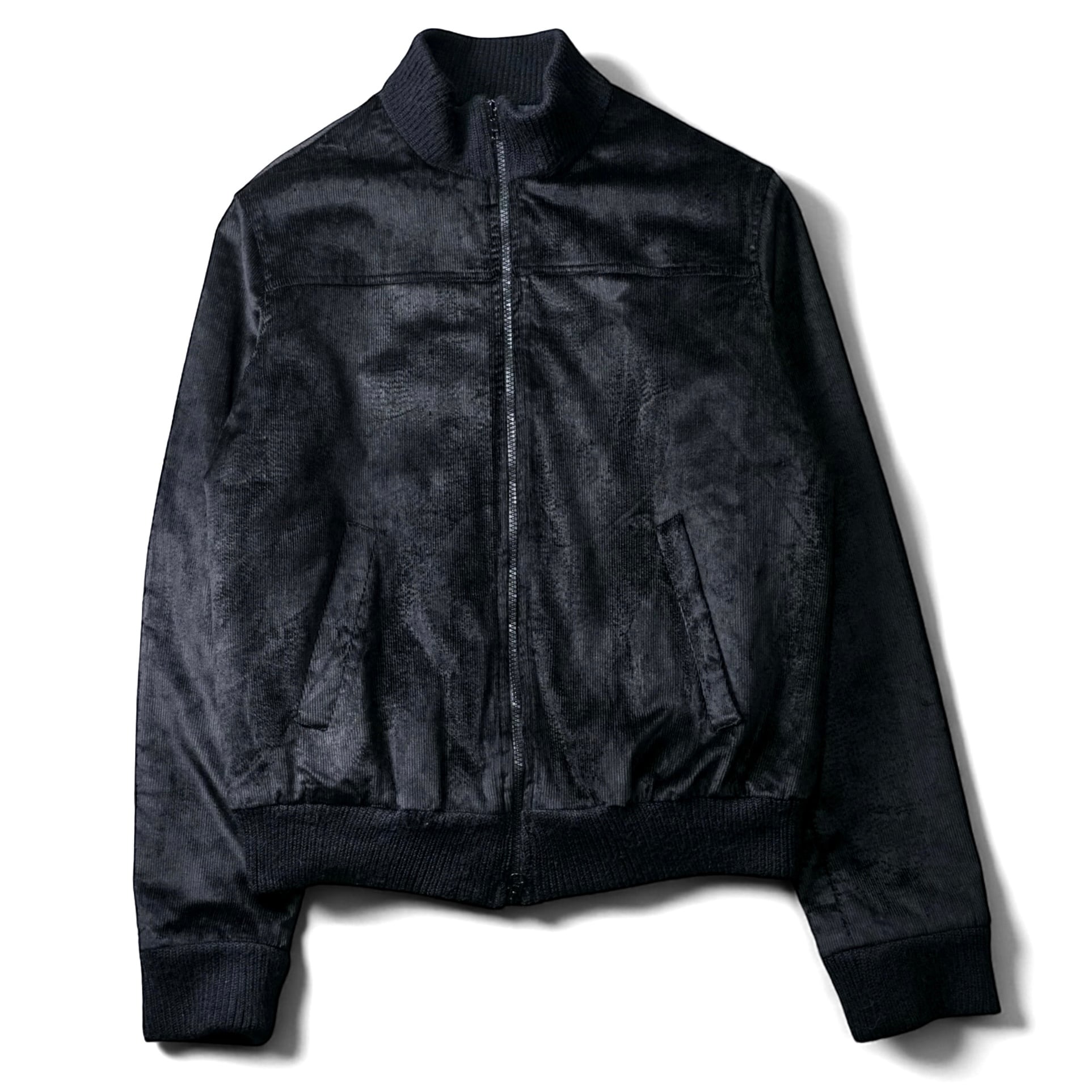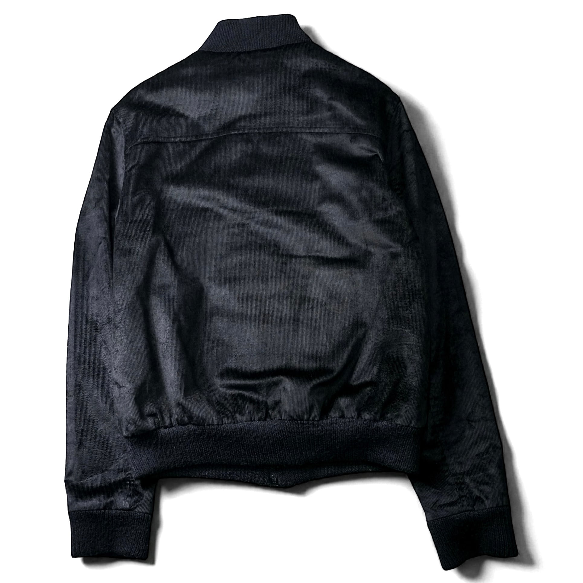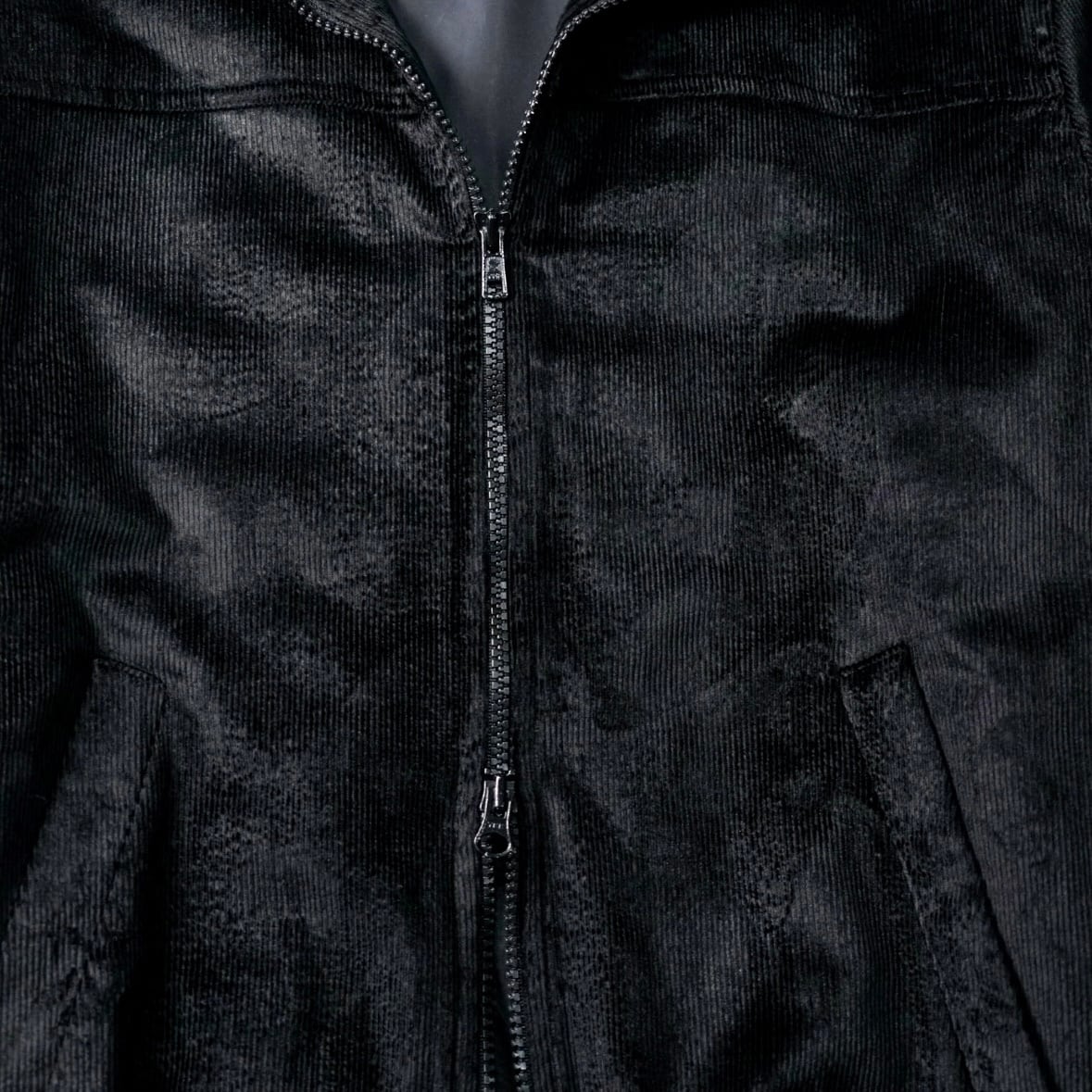 一見するとシンプルなブラックブルゾンですが、近くで見ると生地がまるで 起毛したベルベット × 細畝コーデュロイ の中間のような質感で、光を受けてほんのり艶が走ります。