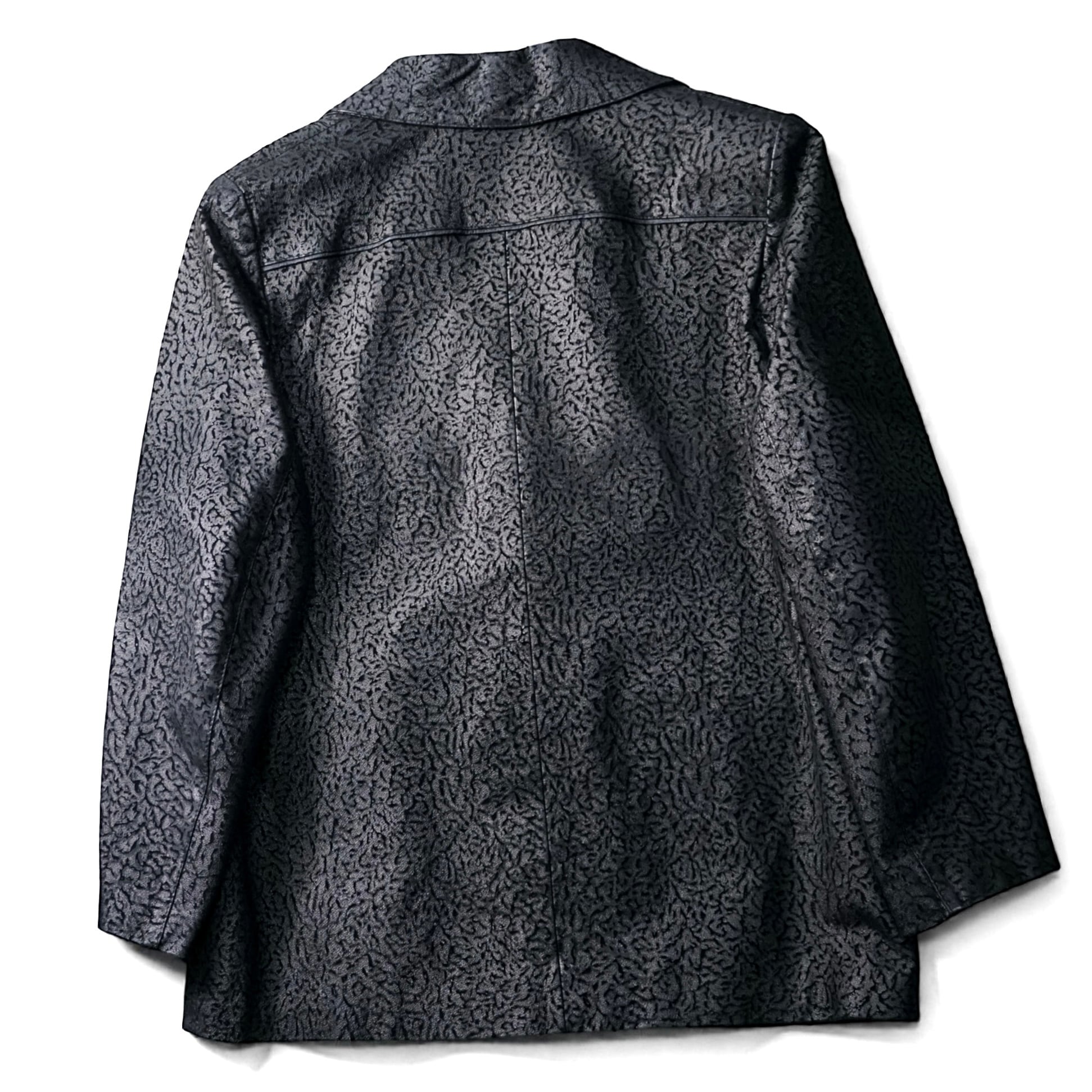 LUV が得意とする“工業的グラフィック”を、レザーの表面に エンボス × ラミネート のような方法でのせた一着。