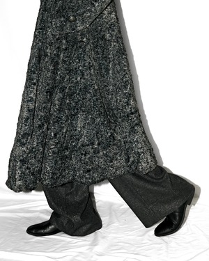 着丈は130cmオーバーの迫力あるマキシ丈。包み込まれるようなオーバーシルエットに、ダブル ボタンとピークドラペルを合わせ、ドレスにもモードにも振れる上品な佇まいに仕上がっています。