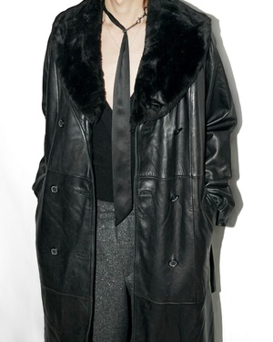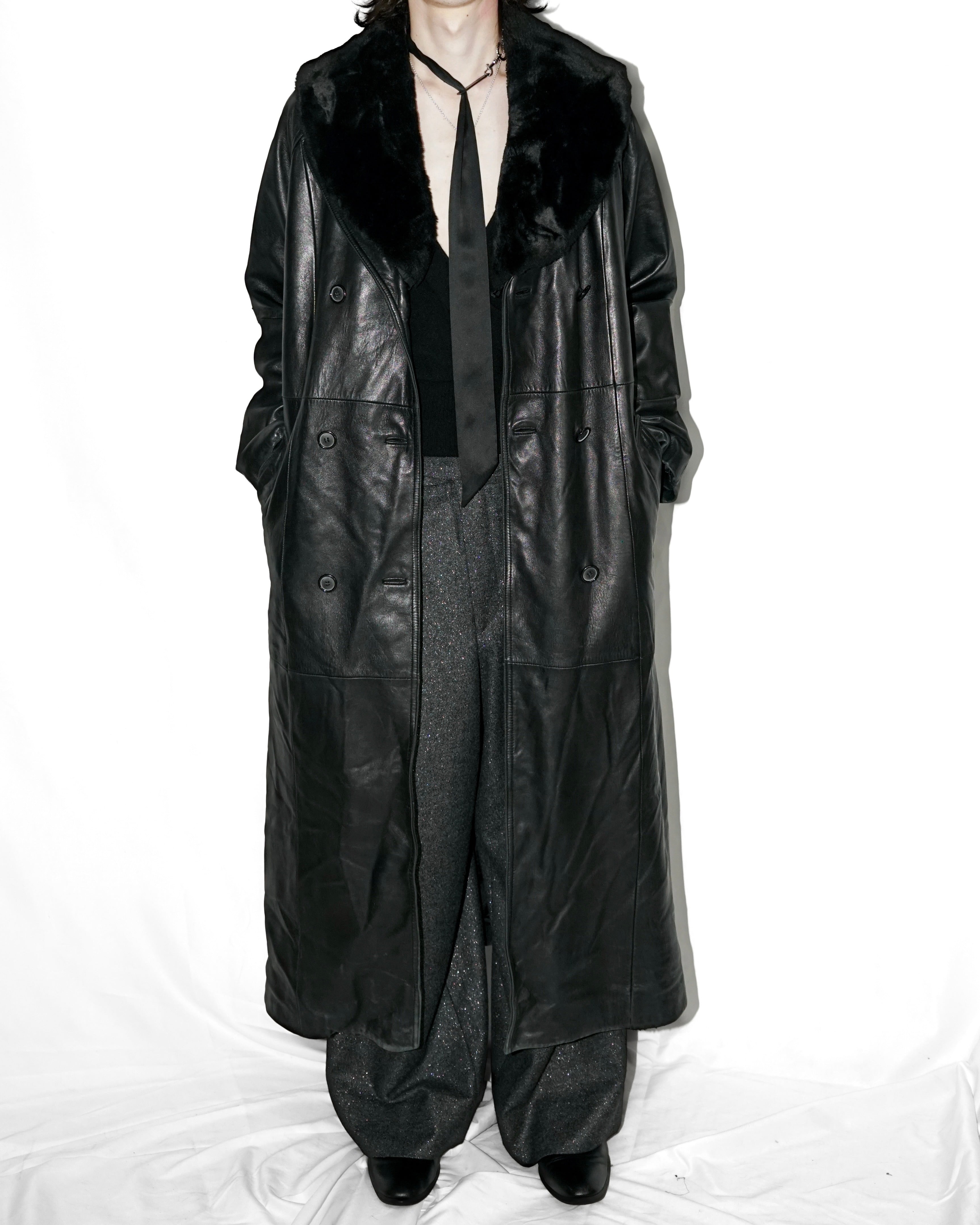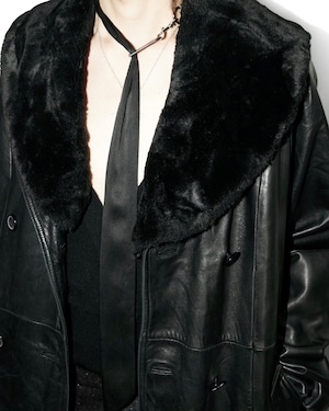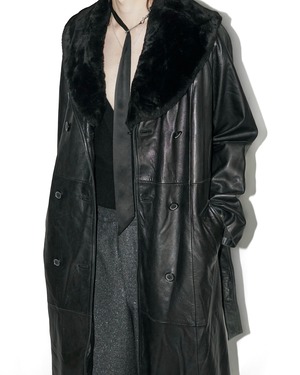 重厚感のあるリアルレザーの質感に、深いブラックのフェイクファーを配した大振りのショールカラーが加わることで、クラシックとモードが交差する存在感抜群の一着に仕上がっています。