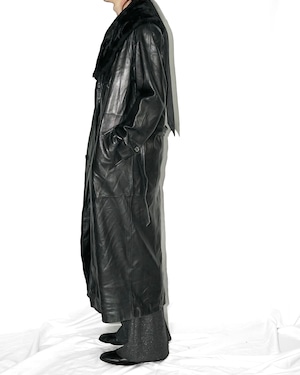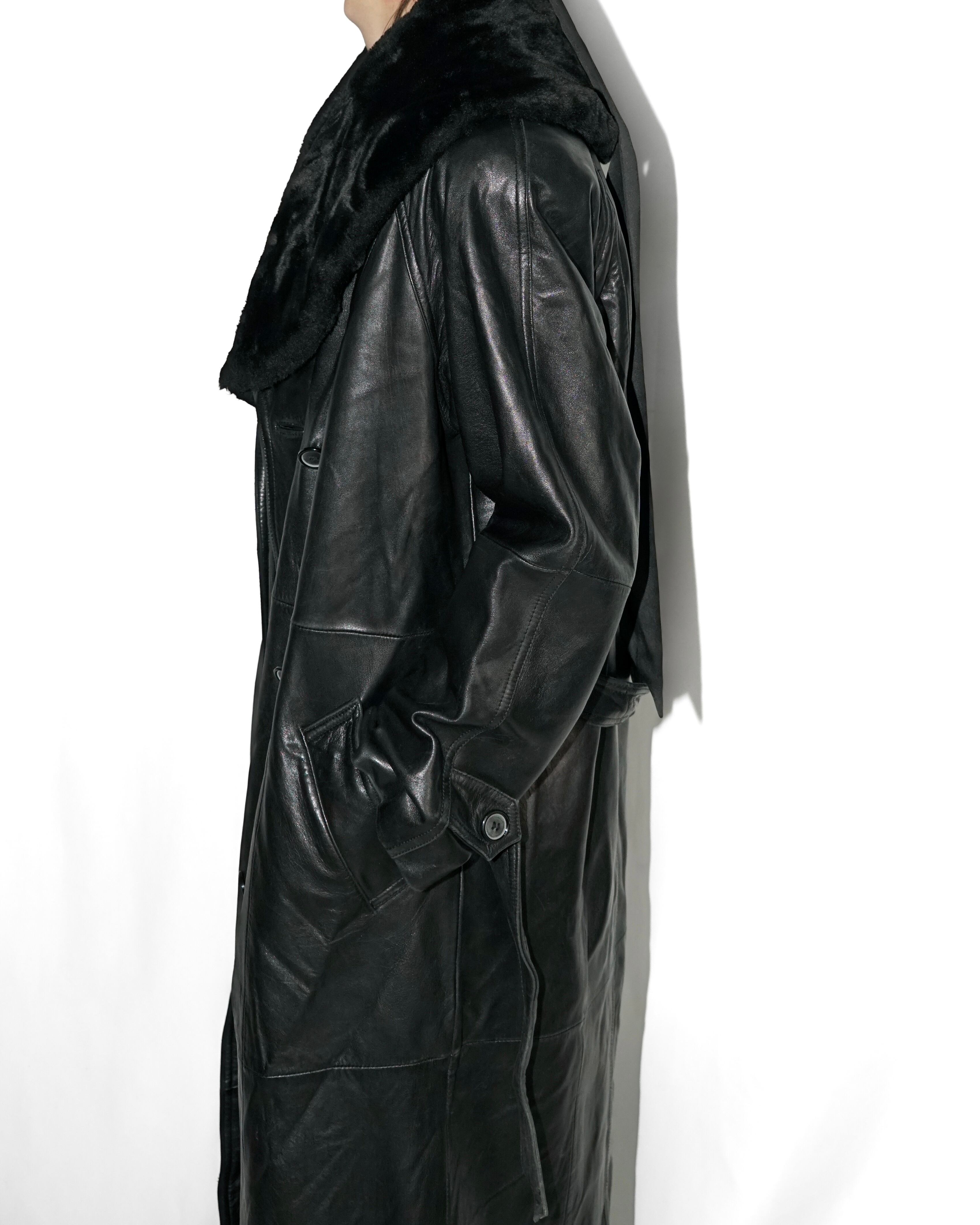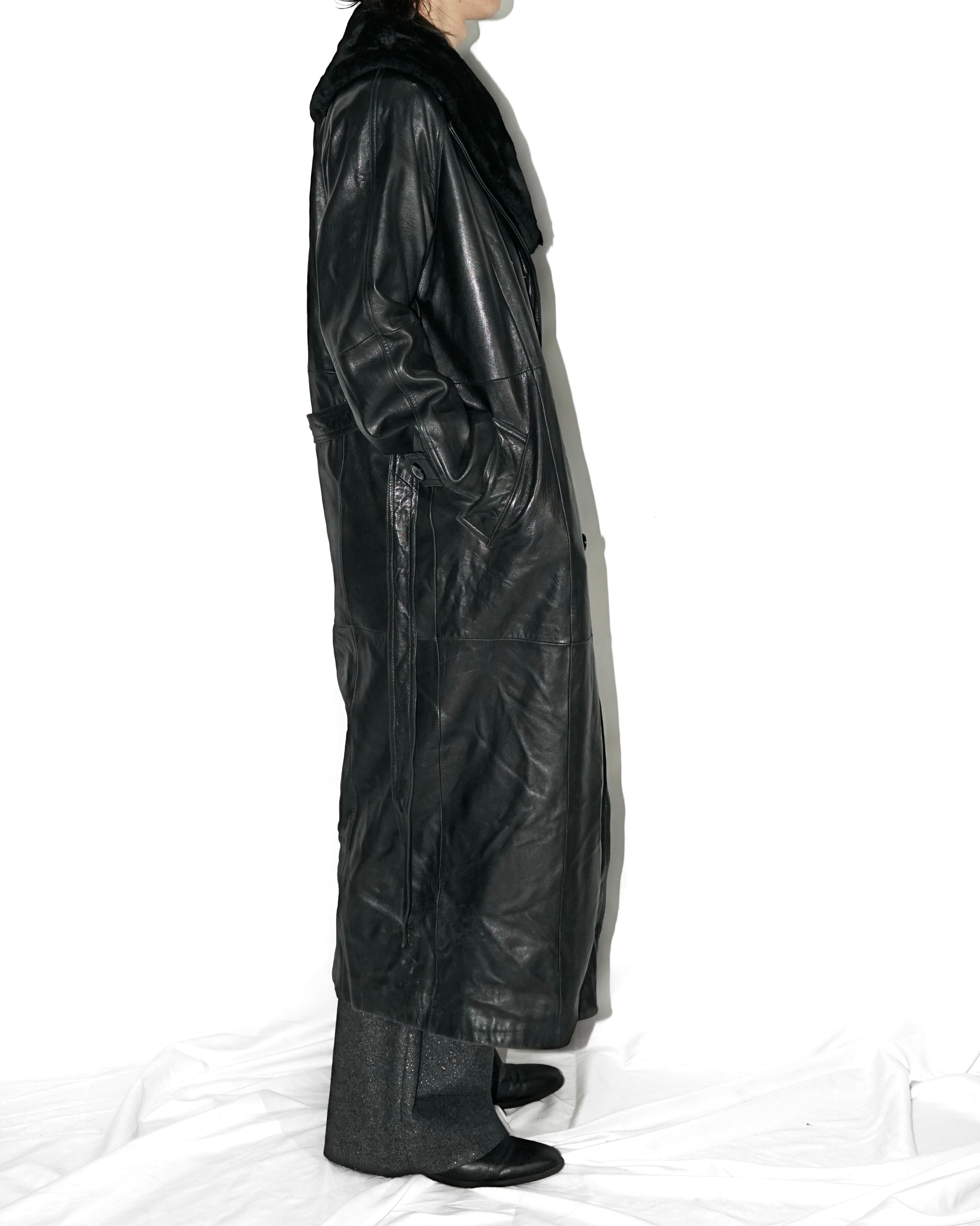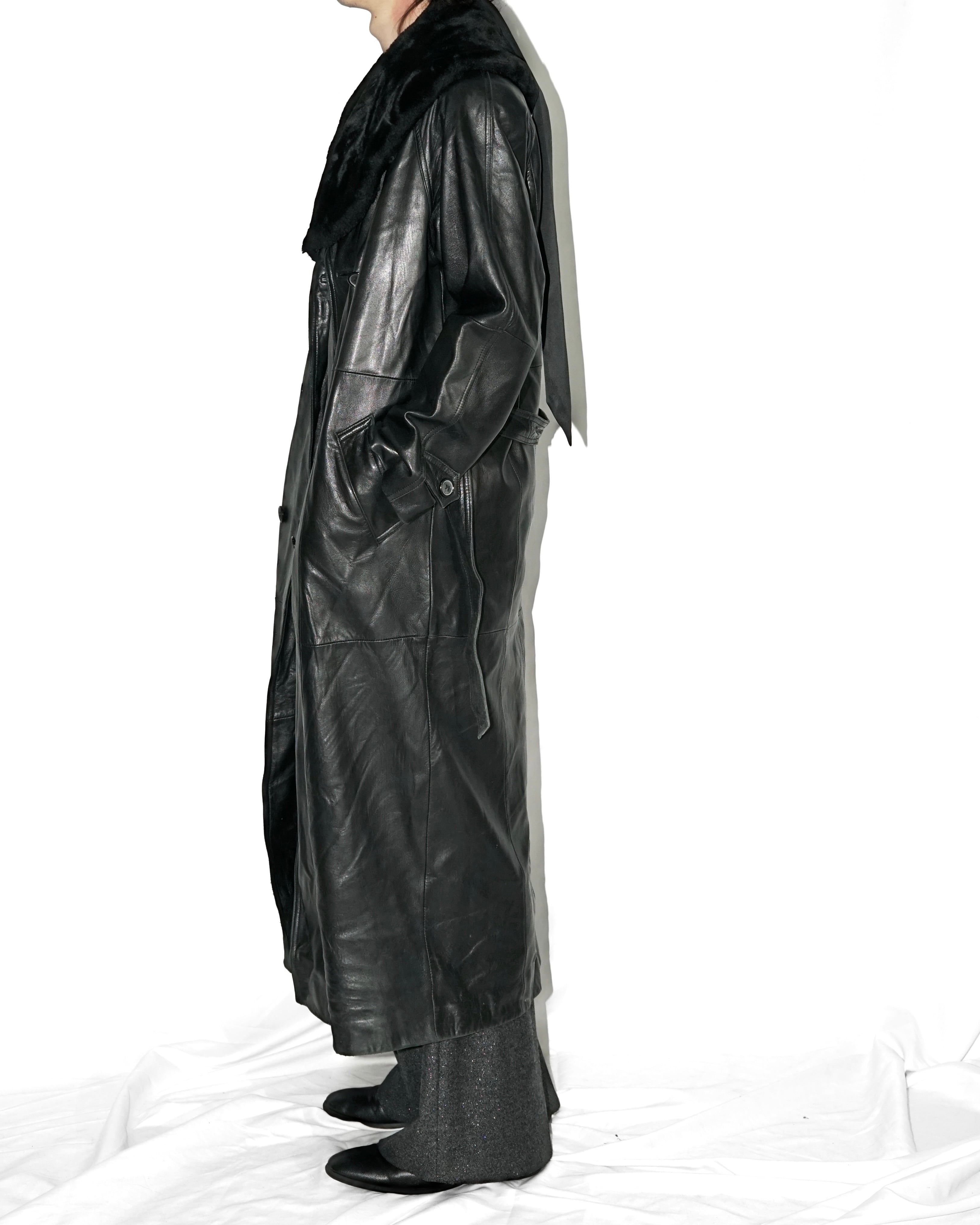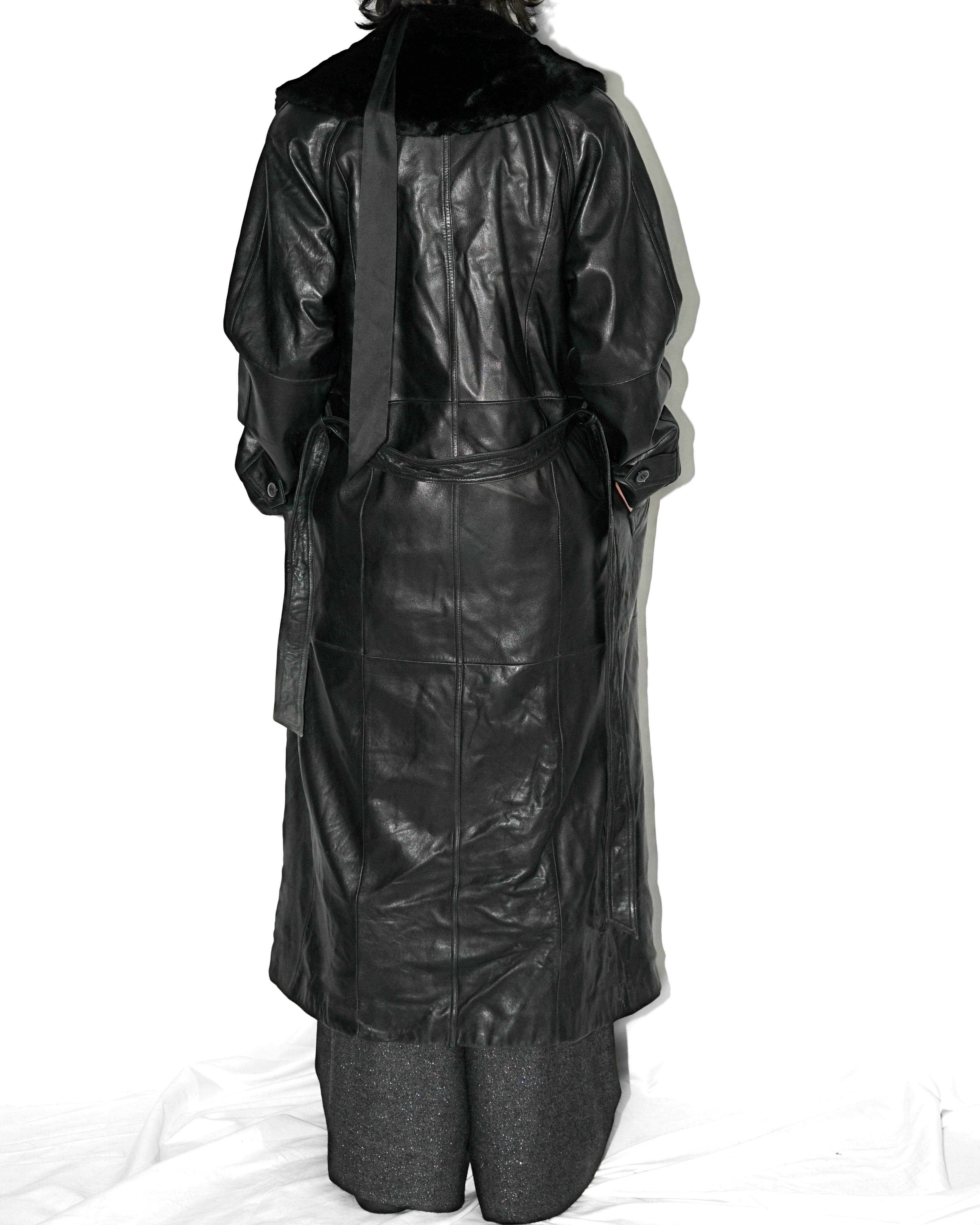 取り外し可能なファー襟を備えた、着丈132cmのマキシ丈レザーコート。